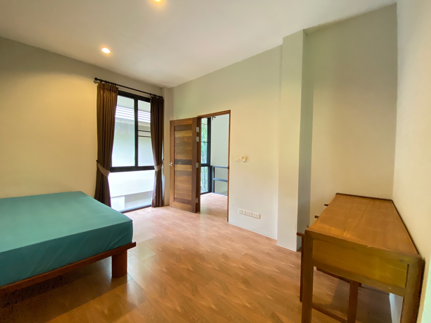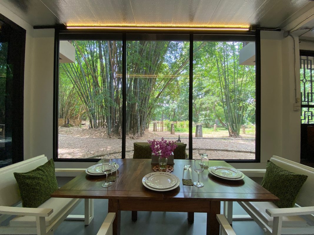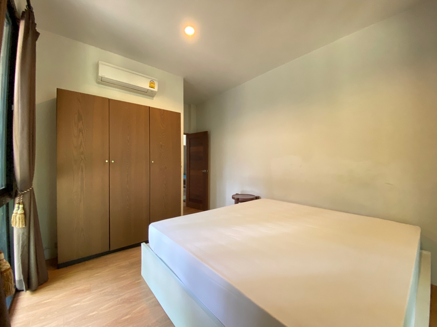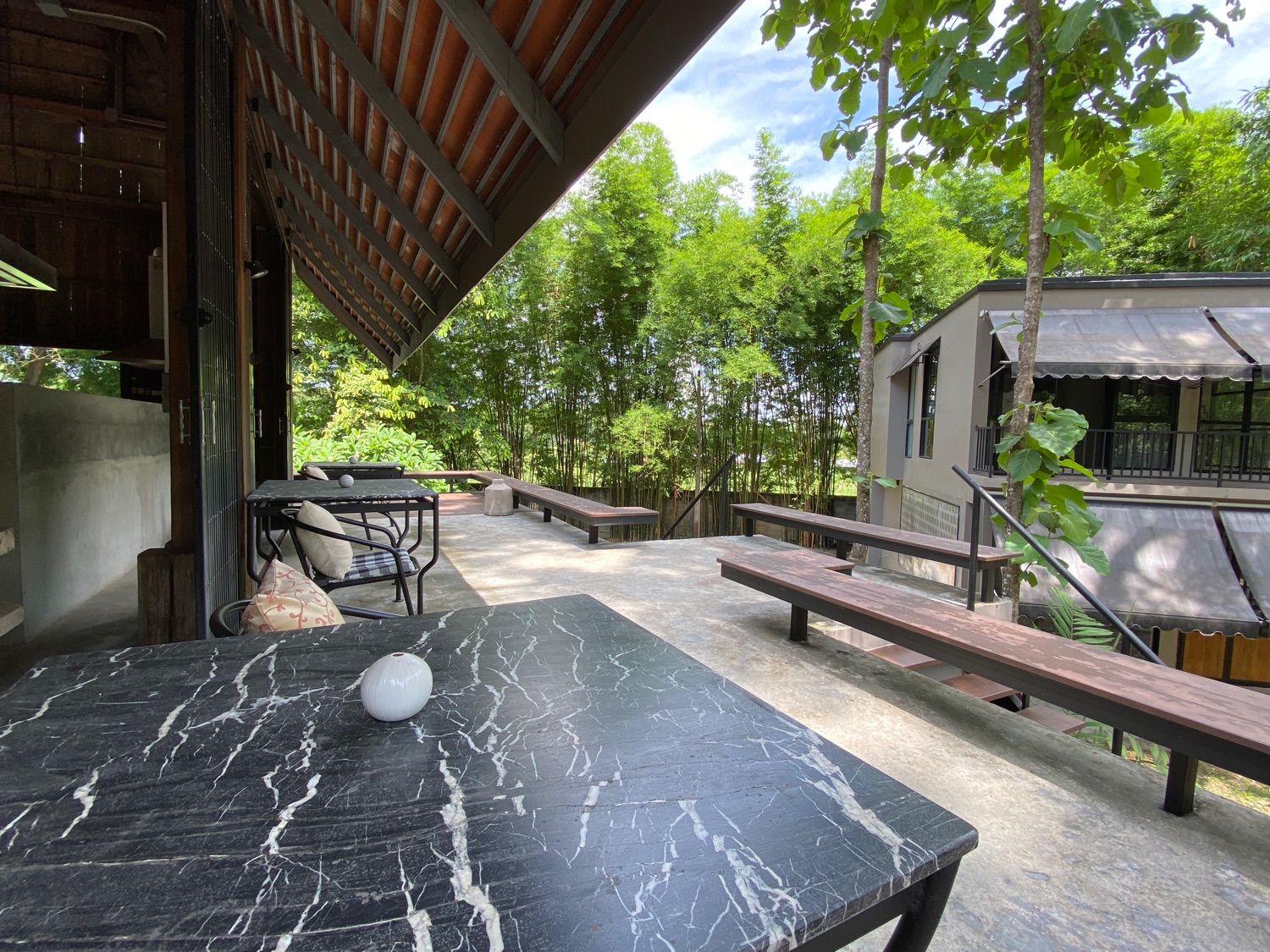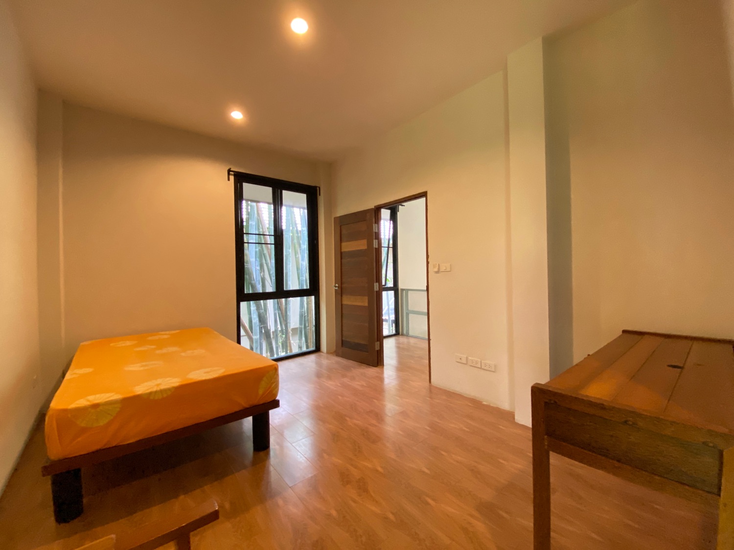 Modern and stylish 6-bedroom twin house for rent fully furnished near Ping River in Don Kaew area of Chiang Mai. Located just north of the city about 10 minutes drive to Mee Chok Plaza and 700 years stadium, the location also offers convenient reach to hospitals, schools and downtown Chiang Mai. About 20 minutes drive to the airport. The property is one of only 5 properties in this exclusive estate. Originally two houses, the owner has connected them with a conservatory or sunroom-style dining room in the middle. The two houses are identical with an open-plan living area with a tall ceiling, and a cute kitchen on the ground floor as well as a guest bathroom with a Victorian bathtub and a guest bedroom which can also be used as a study. On the second floor there are two further bedrooms both ensuite and come with terraces to enjoy the peaceful surroundings. The house is stylishly decorated using good quality and unique furniture pieces. The estate is cosy with gravel ground and bamboo. There is a common house by the river that residents can use for entertaining and a vegetable patch area where residents can grow their own vegetables. A unique and charming set-up in nature surroundings so close to town!