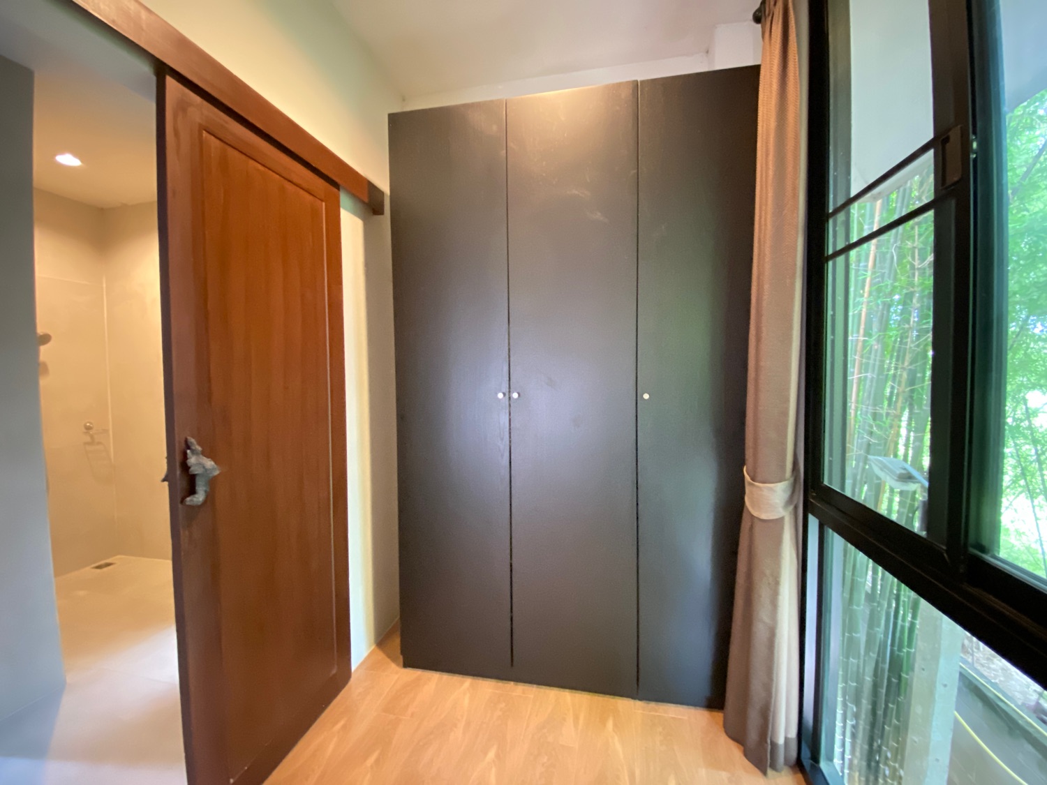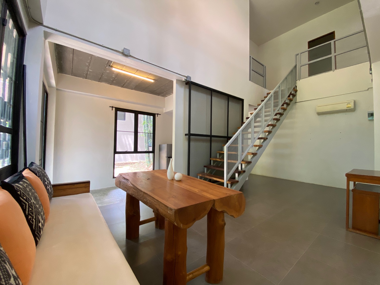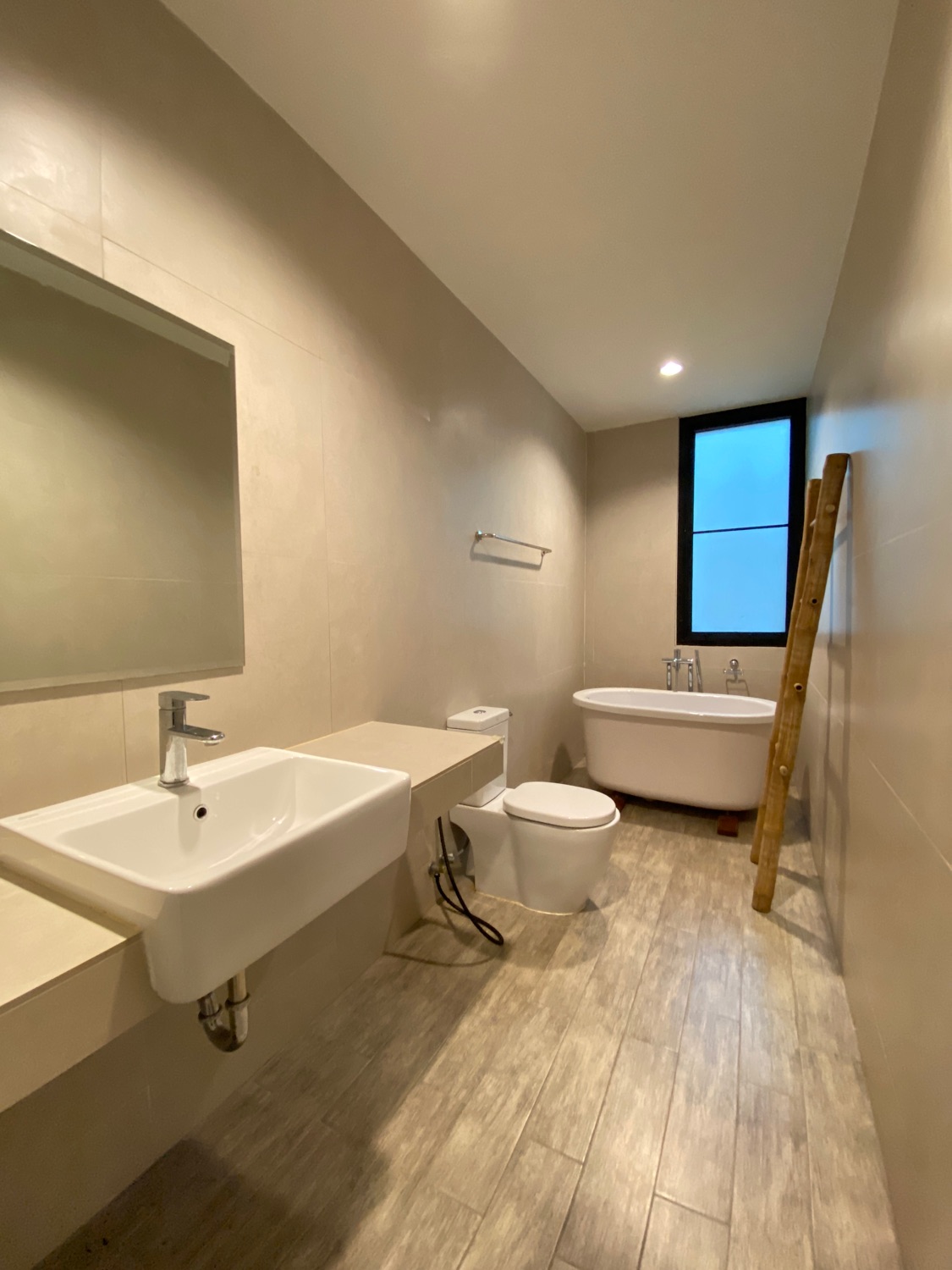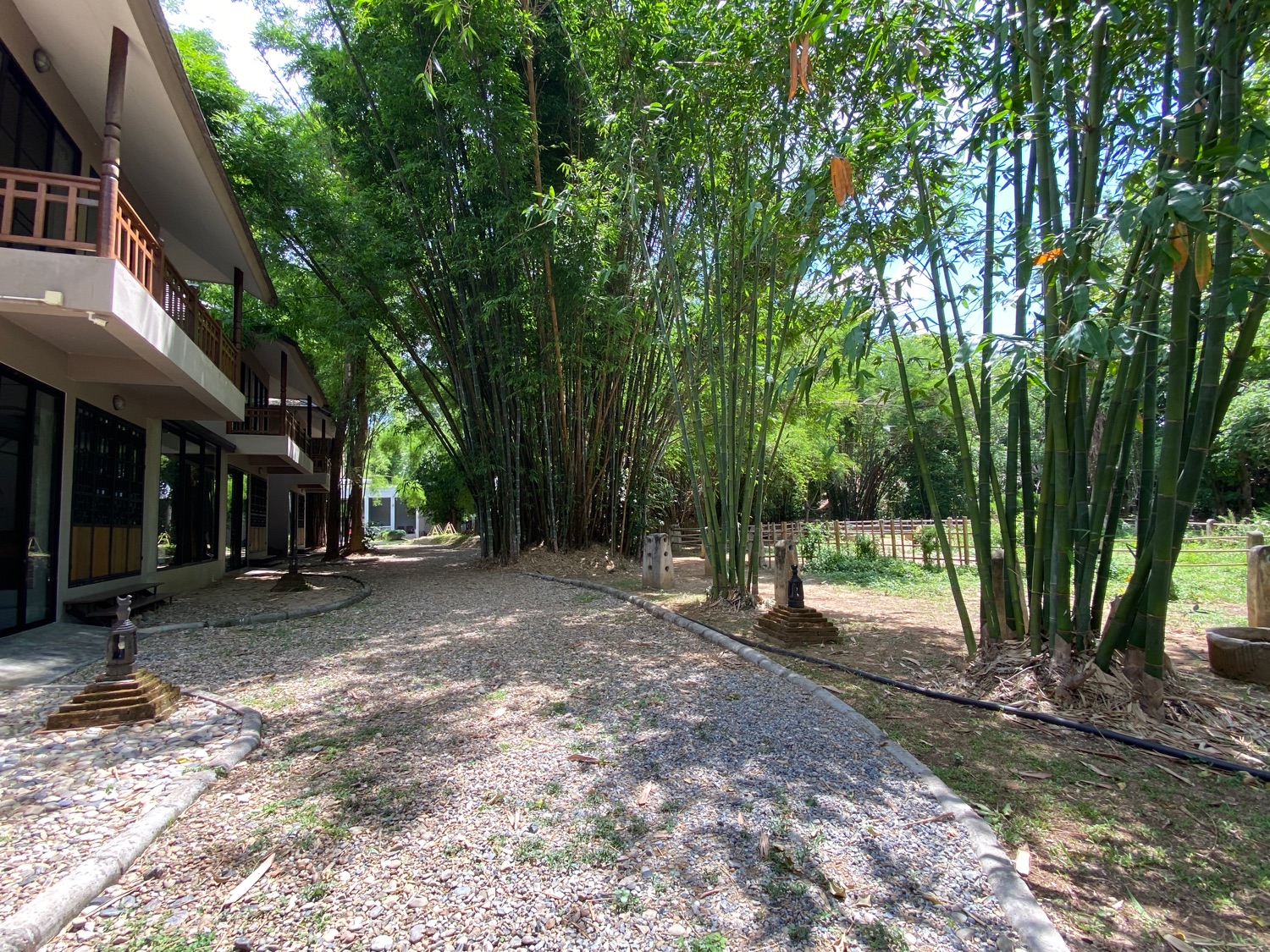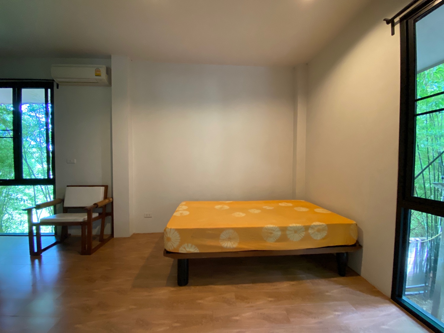 Modern and stylish 6-bedroom twin house for rent fully furnished near Ping River in Don Kaew area of Chiang Mai. Located just north of the city about 10 minutes drive to Mee Chok Plaza and 700 years stadium, the location also offers convenient reach to hospitals, schools and downtown Chiang Mai. About 20 minutes drive to the airport. The property is one of only 5 properties in this exclusive estate. Originally two houses, the owner has connected them with a conservatory or sunroom-style dining room in the middle. The two houses are identical with an open-plan living area with a tall ceiling, and a cute kitchen on the ground floor as well as a guest bathroom with a Victorian bathtub and a guest bedroom which can also be used as a study. On the second floor there are two further bedrooms both ensuite and come with terraces to enjoy the peaceful surroundings. The house is stylishly decorated using good quality and unique furniture pieces. The estate is cosy with gravel ground and bamboo. There is a common house by the river that residents can use for entertaining and a vegetable patch area where residents can grow their own vegetables. A unique and charming set-up in nature surroundings so close to town!