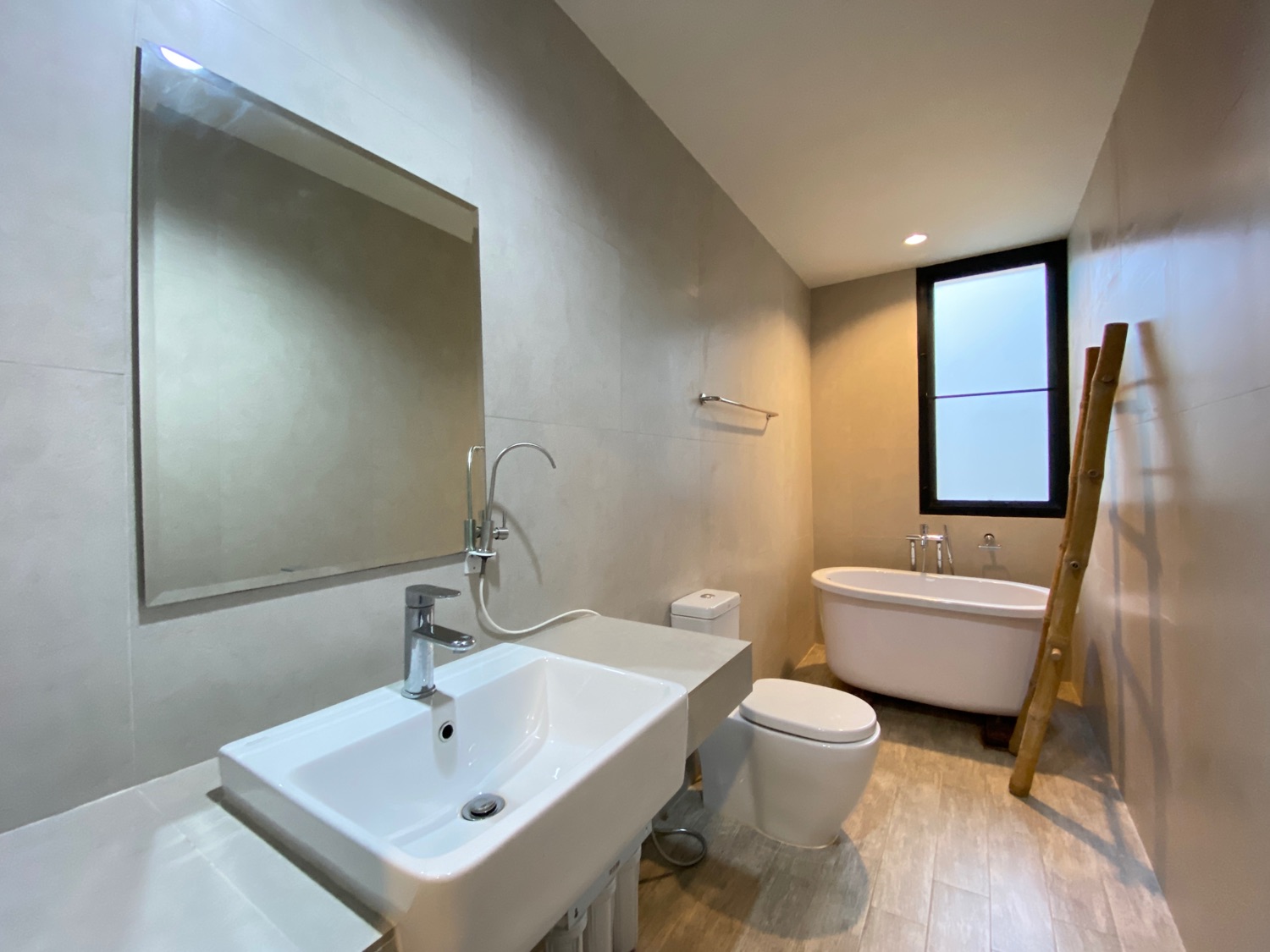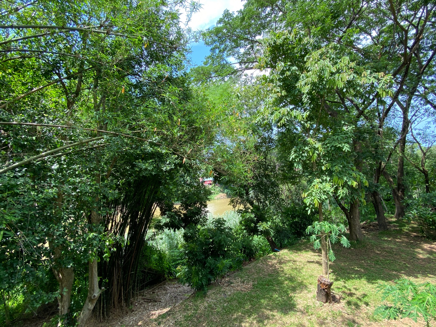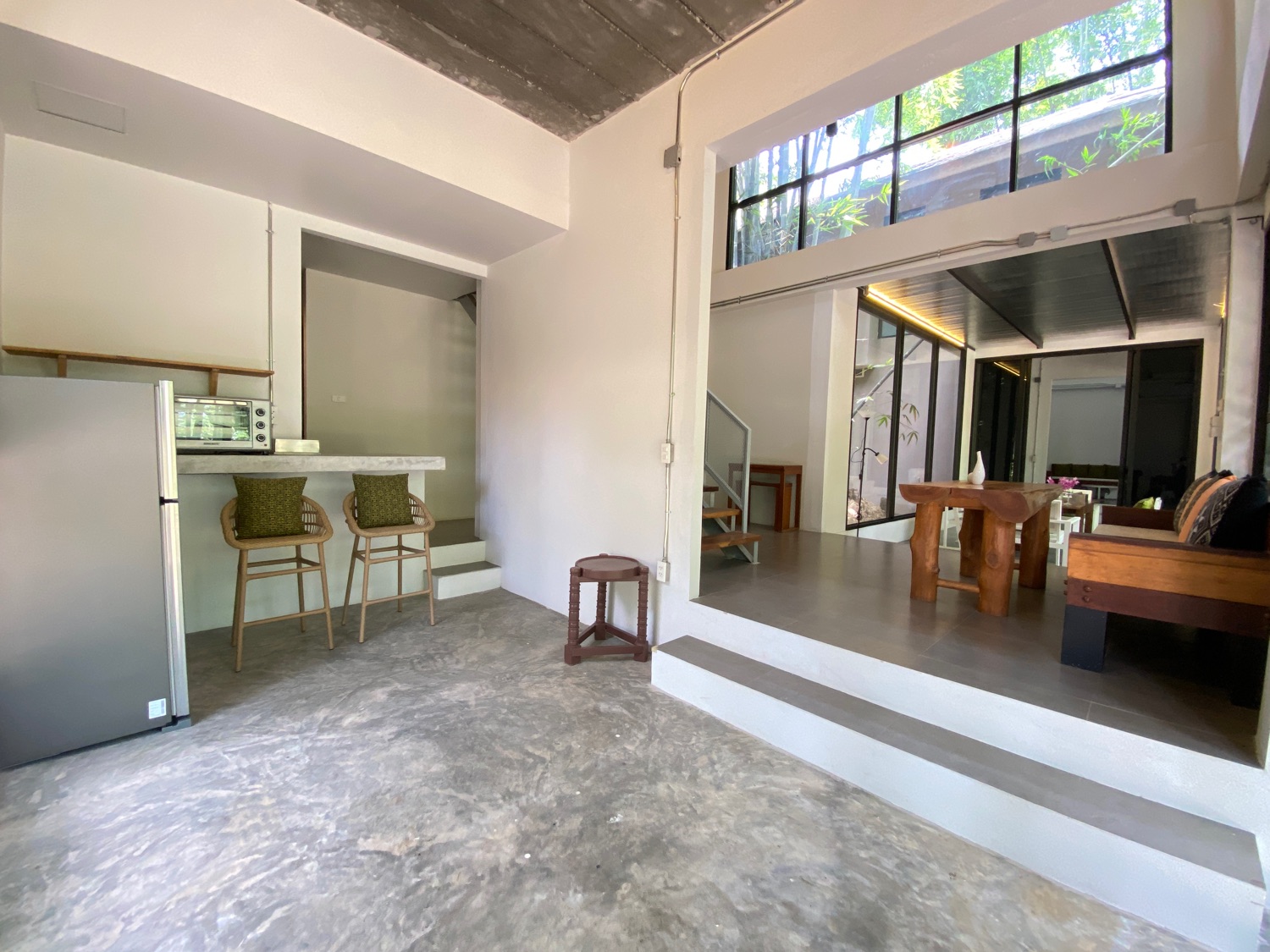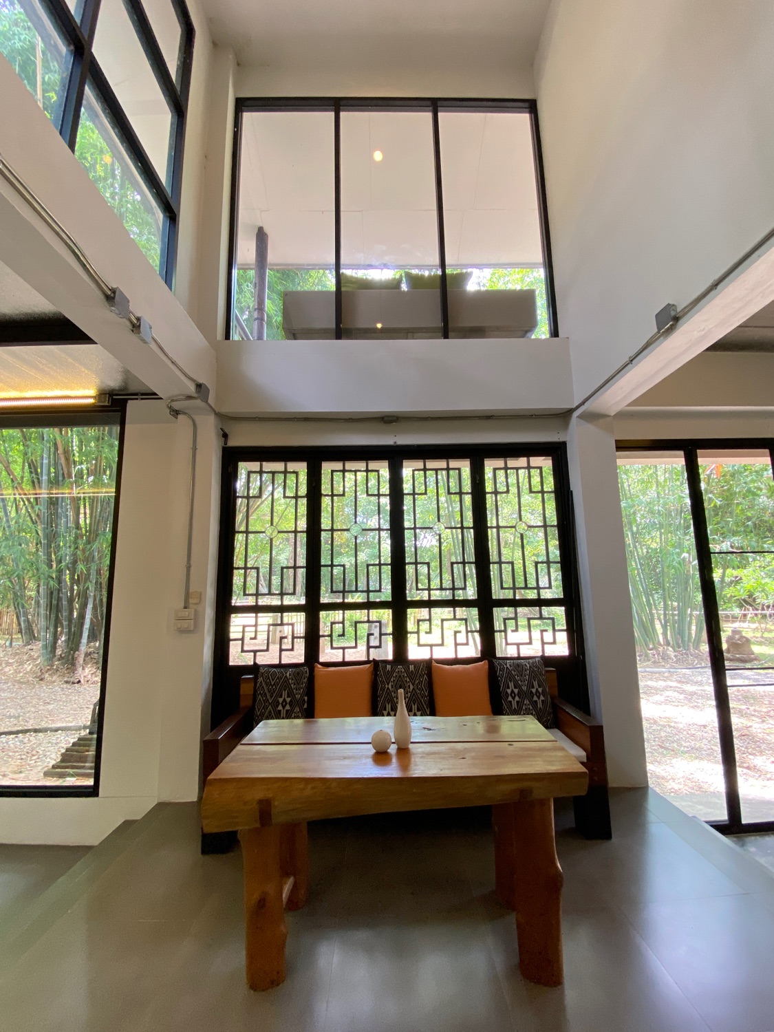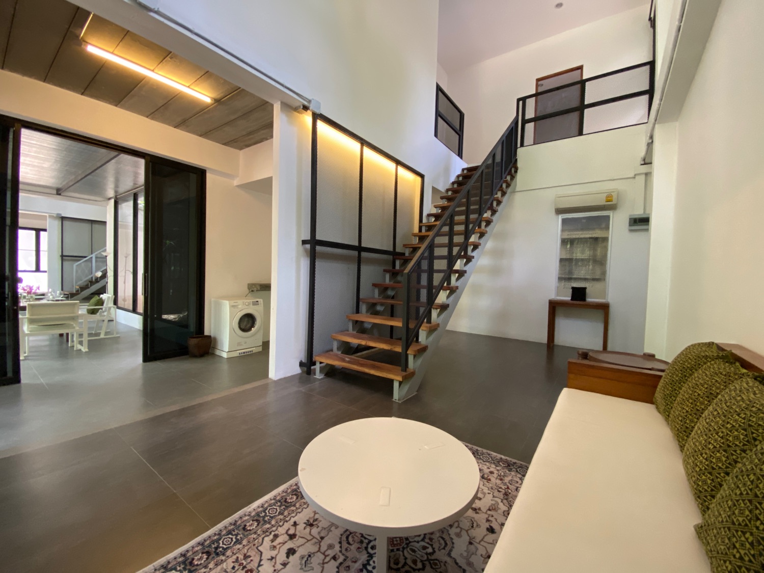 Modern and stylish 6-bedroom twin house for rent fully furnished near Ping River in Don Kaew area of Chiang Mai. Located just north of the city about 10 minutes drive to Mee Chok Plaza and 700 years stadium, the location also offers convenient reach to hospitals, schools and downtown Chiang Mai. About 20 minutes drive to the airport. The property is one of only 5 properties in this exclusive estate. Originally two houses, the owner has connected them with a conservatory or sunroom-style dining room in the middle. The two houses are identical with an open-plan living area with a tall ceiling, and a cute kitchen on the ground floor as well as a guest bathroom with a Victorian bathtub and a guest bedroom which can also be used as a study. On the second floor there are two further bedrooms both ensuite and come with terraces to enjoy the peaceful surroundings. The house is stylishly decorated using good quality and unique furniture pieces. The estate is cosy with gravel ground and bamboo. There is a common house by the river that residents can use for entertaining and a vegetable patch area where residents can grow their own vegetables. A unique and charming set-up in nature surroundings so close to town!