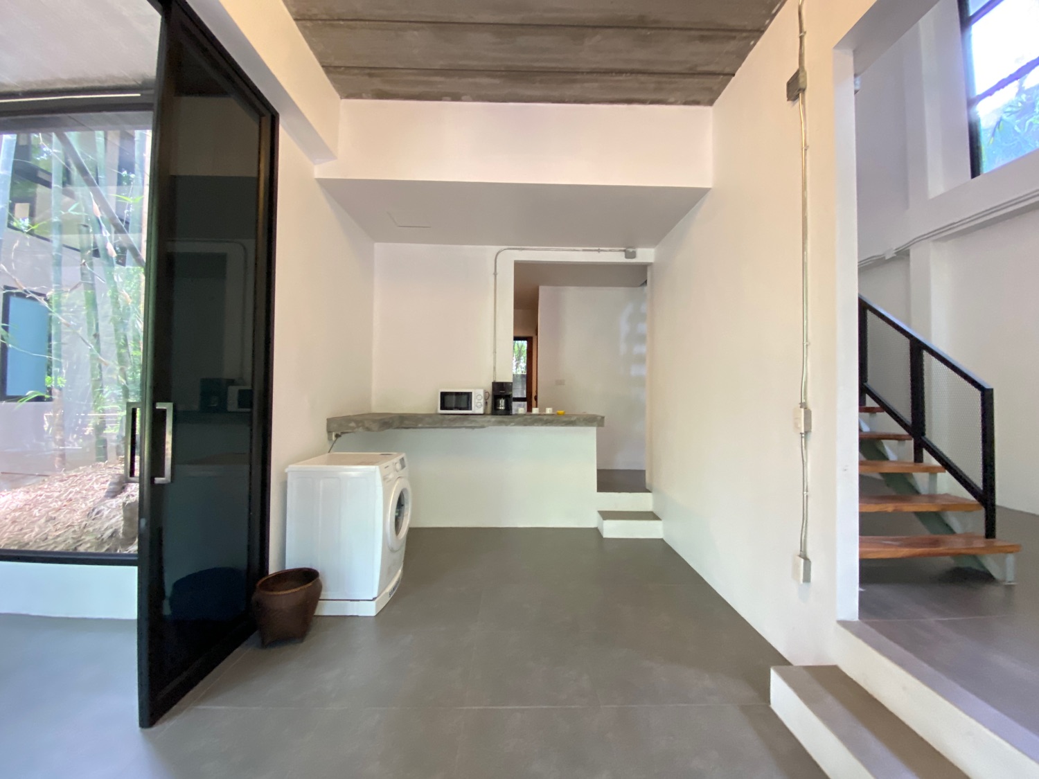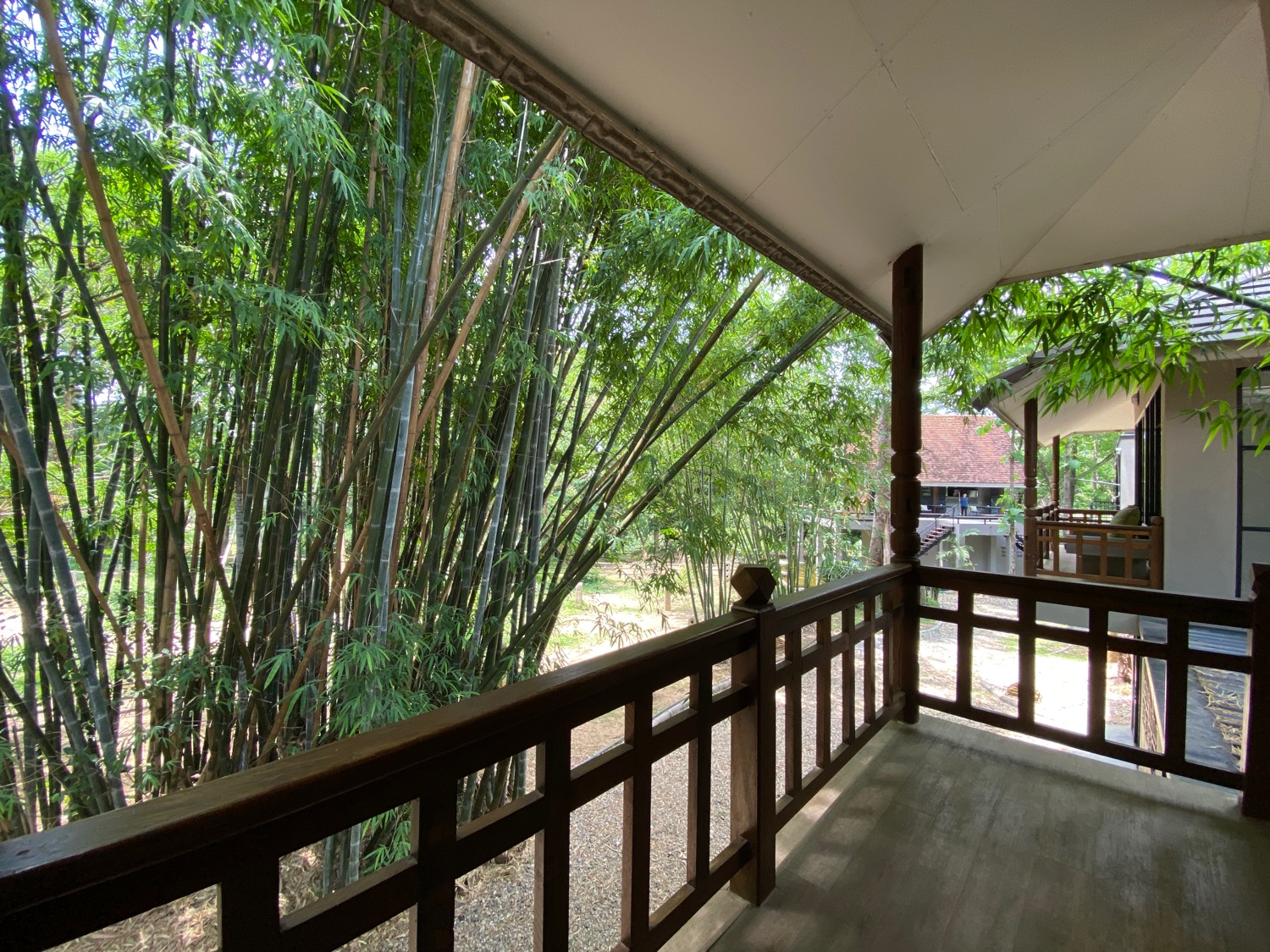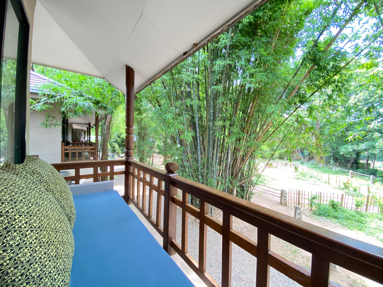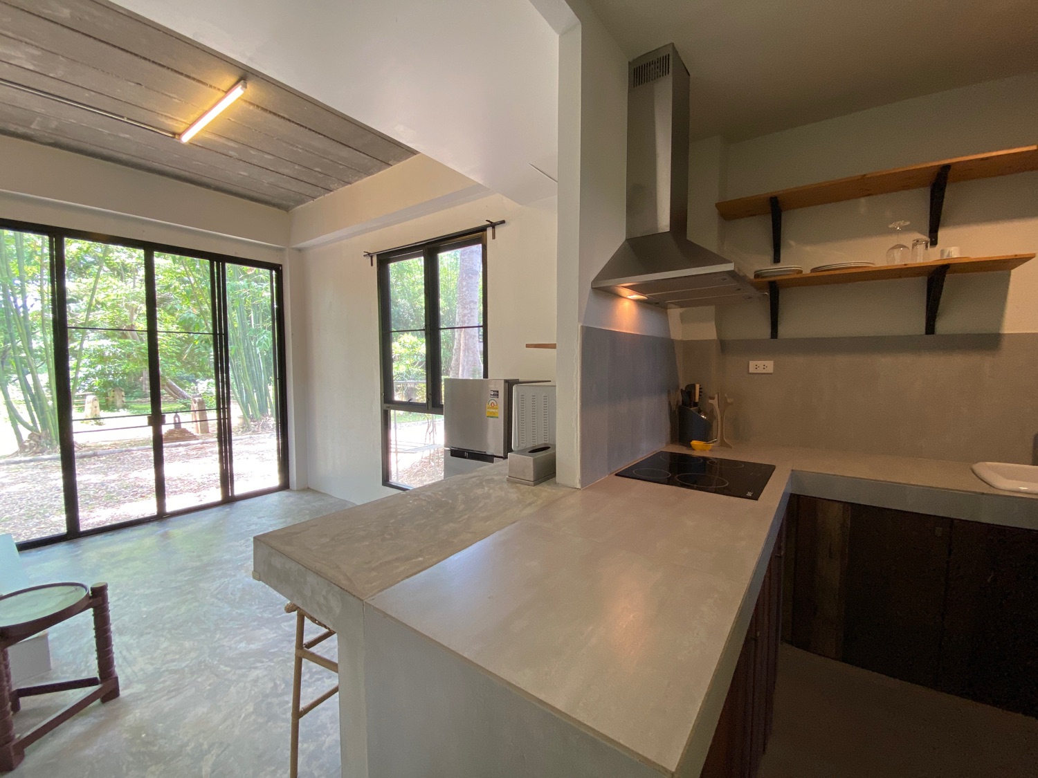Modern and stylish 6-bedroom twin house for rent fully furnished near Ping River in Don Kaew area of Chiang Mai. Located just north of the city about 10 minutes drive to Mee Chok Plaza and 700 years stadium, the location also offers convenient reach to hospitals, schools and downtown Chiang Mai. About 20 minutes drive to the airport. The property is one of only 5 properties in this exclusive estate. Originally two houses, the owner has connected them with a conservatory or sunroom-style dining room in the middle. The two houses are identical with an open-plan living area with a tall ceiling, and a cute kitchen on the ground floor as well as a guest bathroom with a Victorian bathtub and a guest bedroom which can also be used as a study. On the second floor there are two further bedrooms both ensuite and come with terraces to enjoy the peaceful surroundings. The house is stylishly decorated using good quality and unique furniture pieces. The estate is cosy with gravel ground and bamboo. There is a common house by the river that residents can use for entertaining and a vegetable patch area where residents can grow their own vegetables. A unique and charming set-up in nature surroundings so close to town!