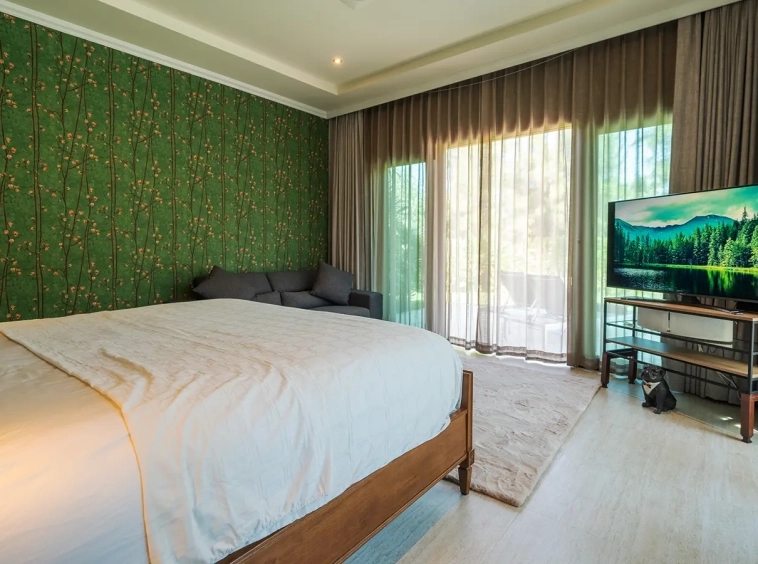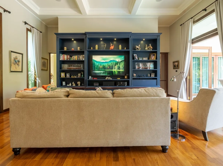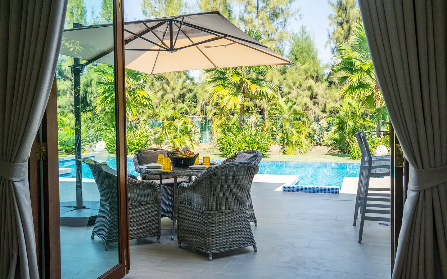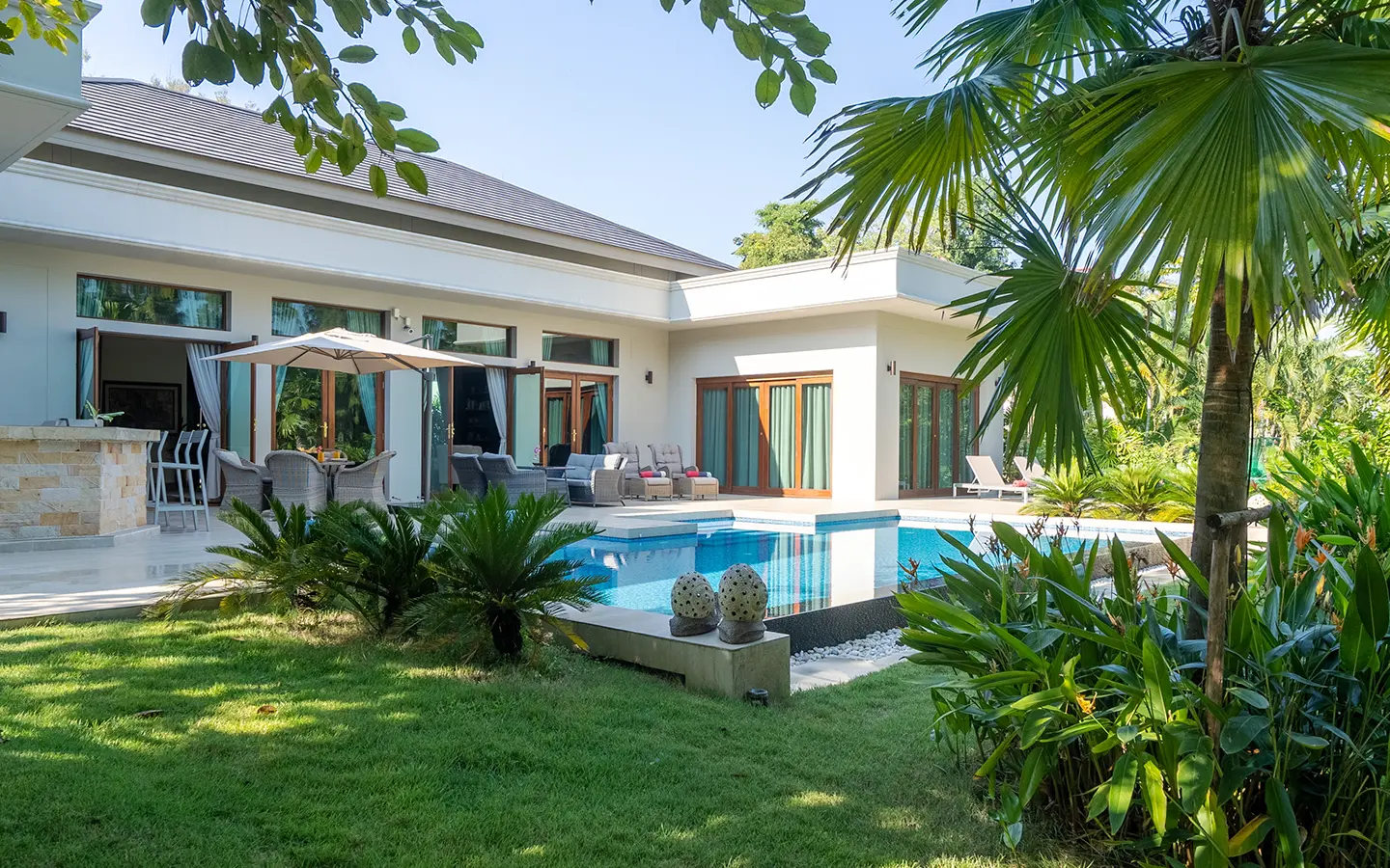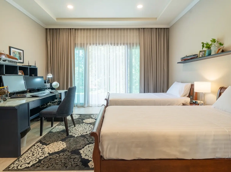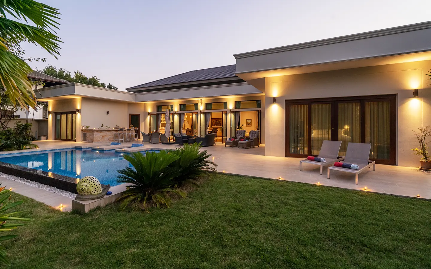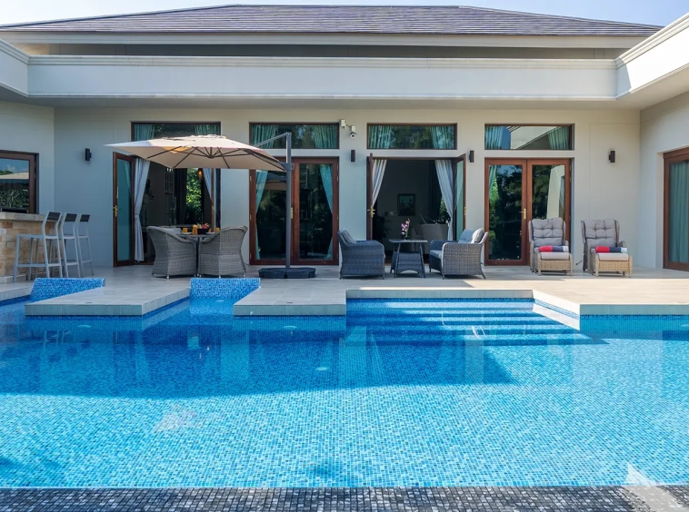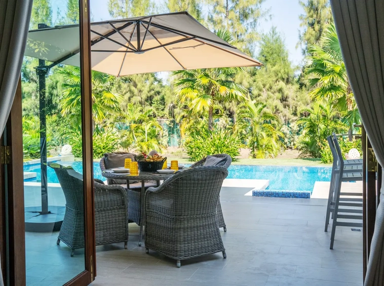 The residence is constructed with double-layer walls, and all doors and windows are custom-made from premium teak wood, designed to minimize dust intrusion and maximize living comfort. High-quality tempered glass is used throughout the home, complemented by a built-in sound system imported from Klipsch. Floor-to-ceiling glass panels in the living area open fully to the terrace and swimming pool, allowing abundant natural light and a seamless indoor-outdoor connection.