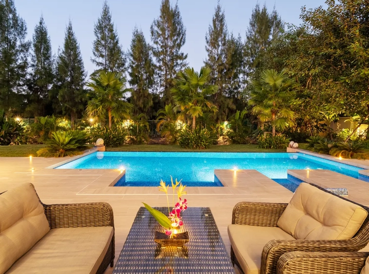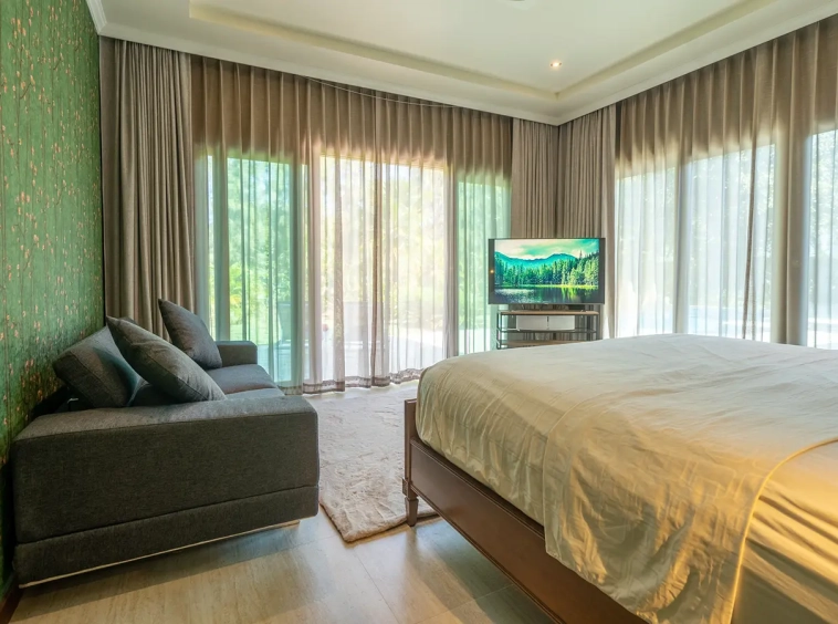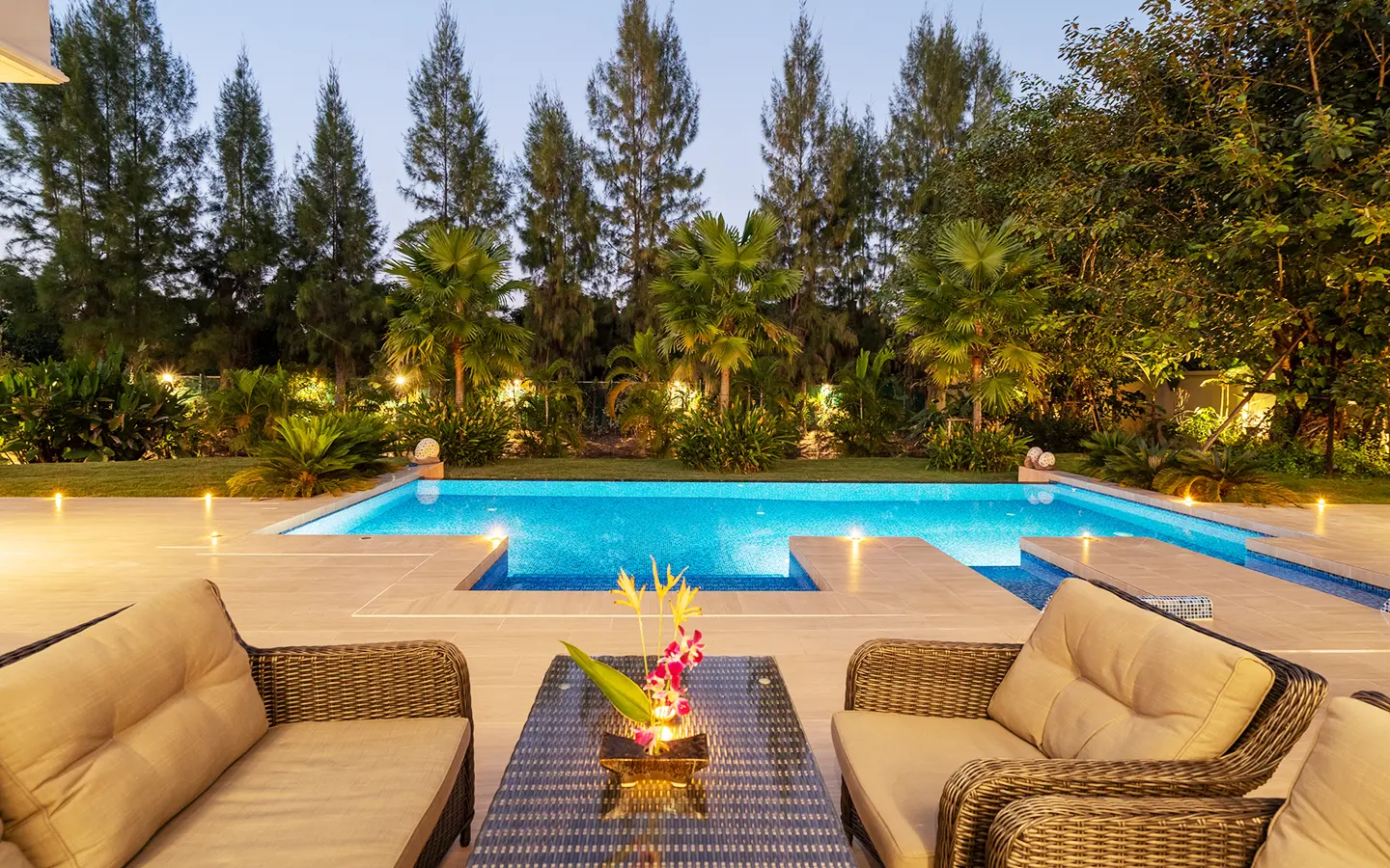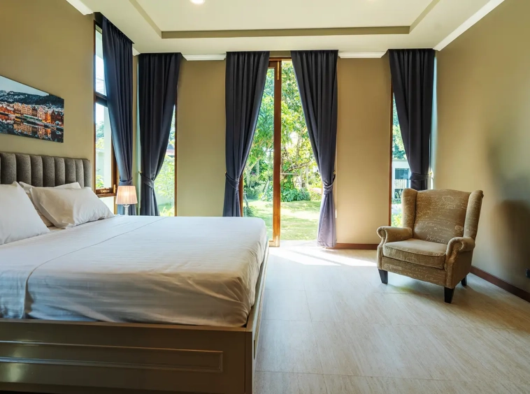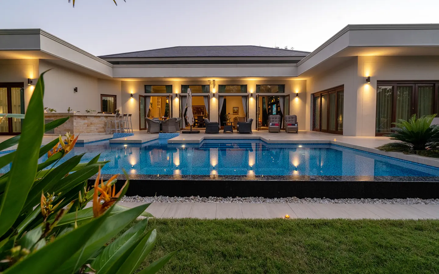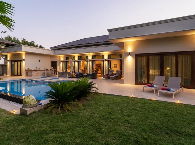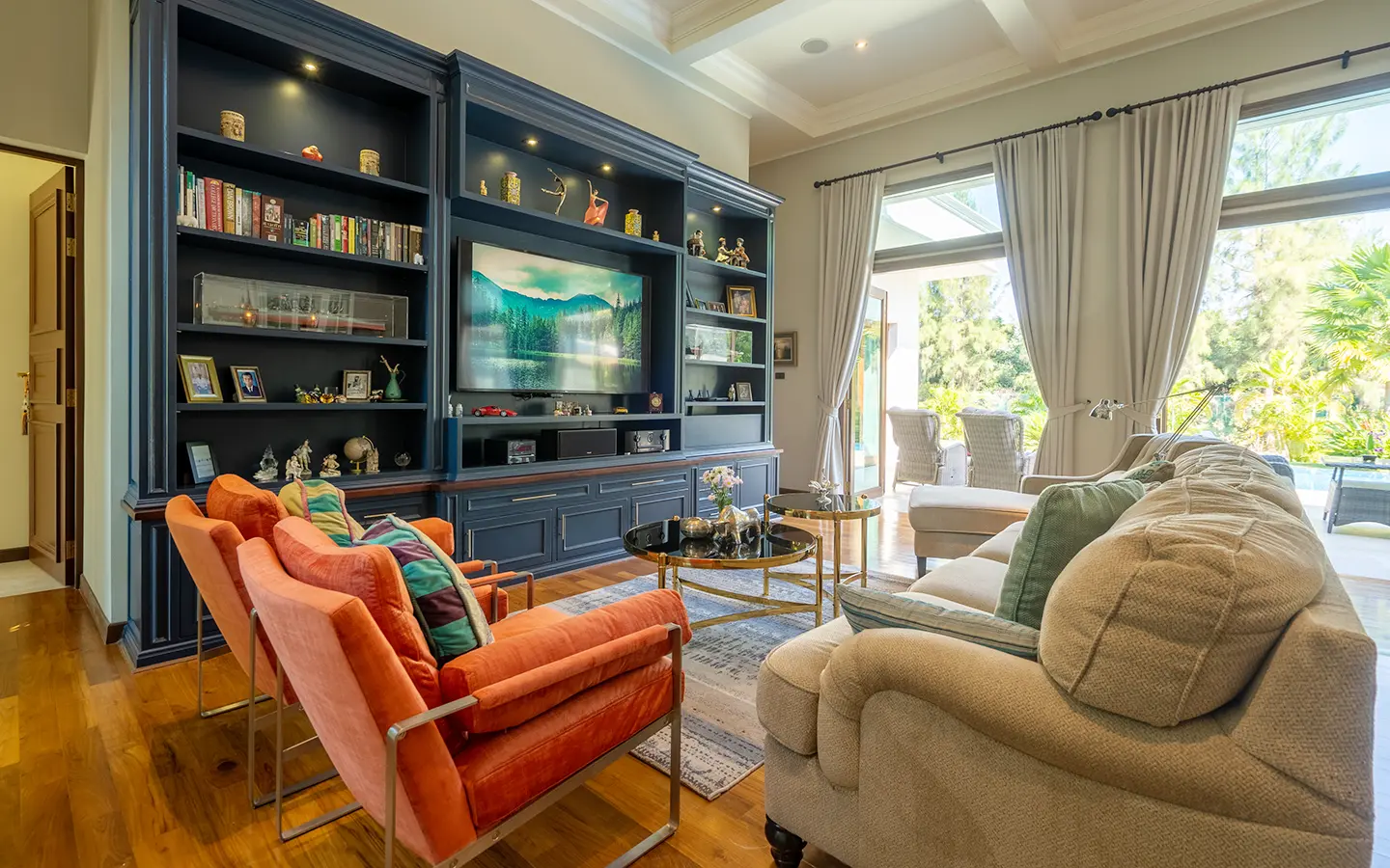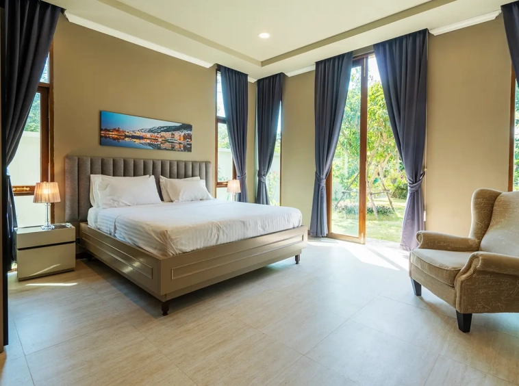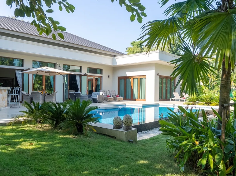 The residence is constructed with double-layer walls, and all doors and windows are custom-made from premium teak wood, designed to minimize dust intrusion and maximize living comfort. High-quality tempered glass is used throughout the home, complemented by a built-in sound system imported from Klipsch. Floor-to-ceiling glass panels in the living area open fully to the terrace and swimming pool, allowing abundant natural light and a seamless indoor-outdoor connection.