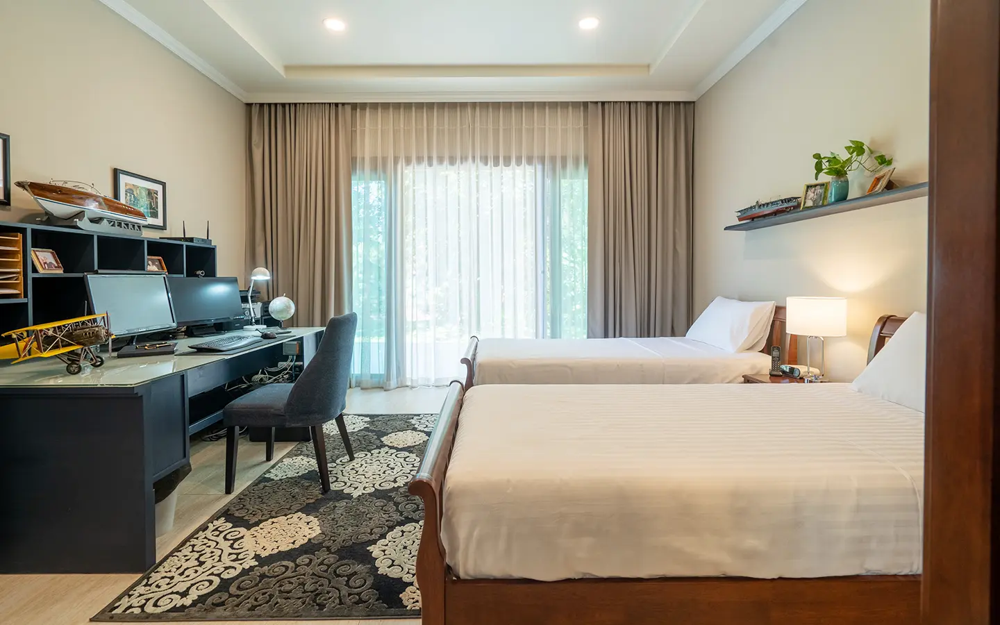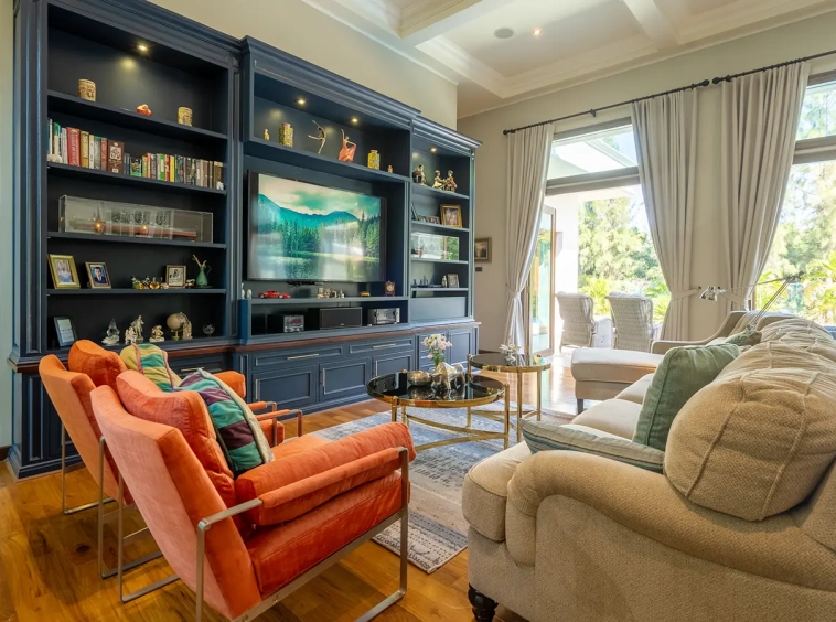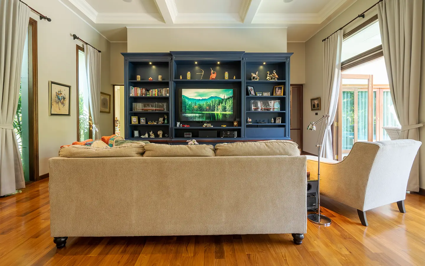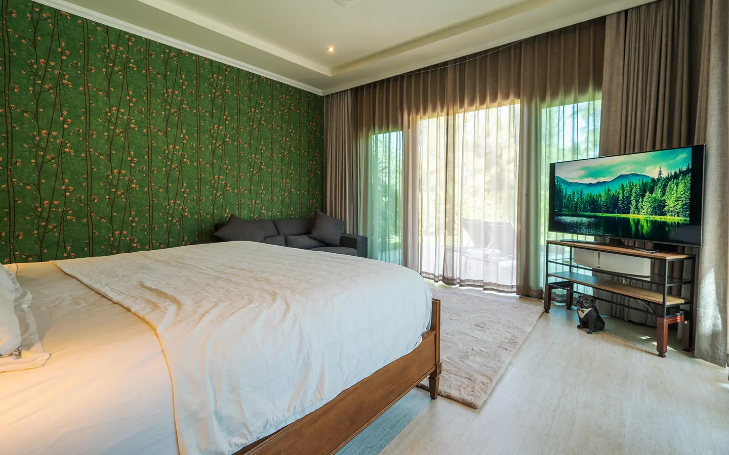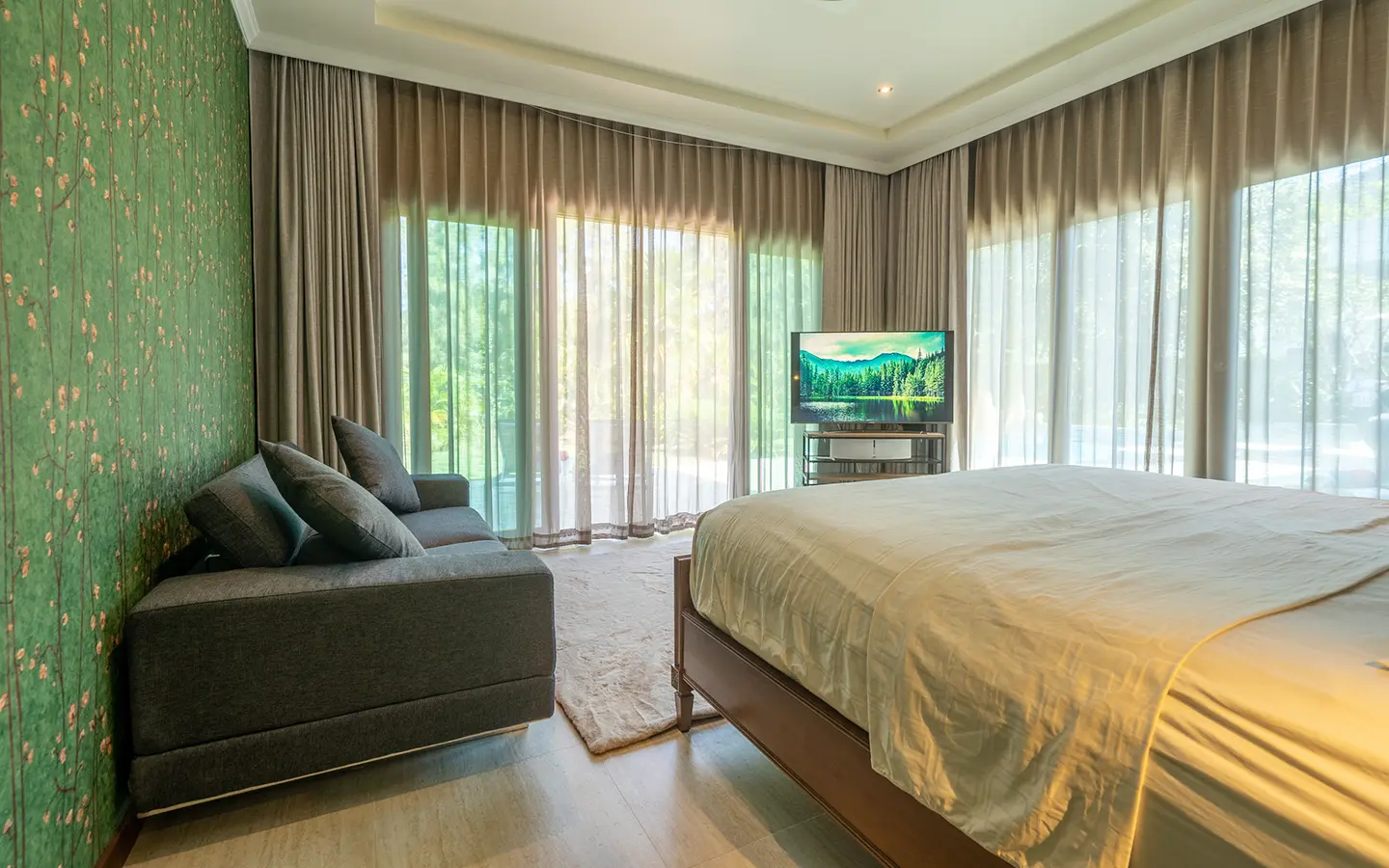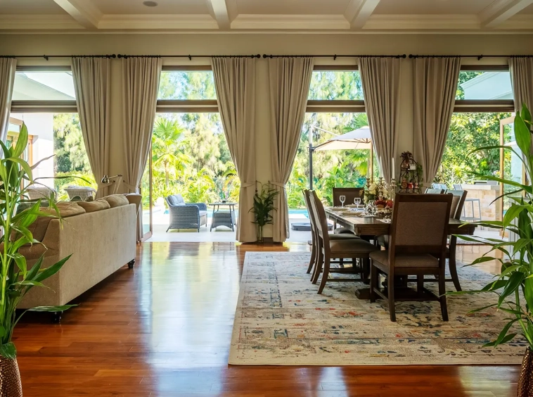 The residence is constructed with double-layer walls, and all doors and windows are custom-made from premium teak wood, designed to minimize dust intrusion and maximize living comfort. High-quality tempered glass is used throughout the home, complemented by a built-in sound system imported from Klipsch. Floor-to-ceiling glass panels in the living area open fully to the terrace and swimming pool, allowing abundant natural light and a seamless indoor-outdoor connection.