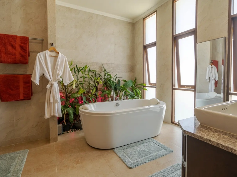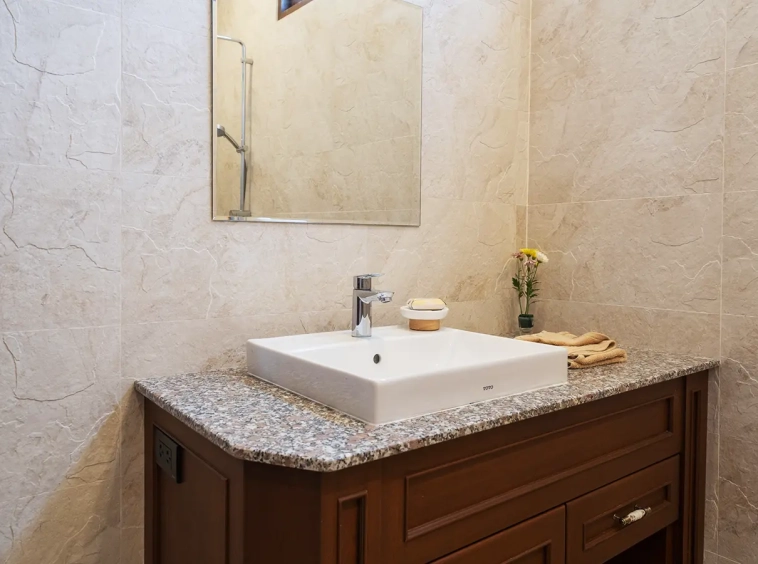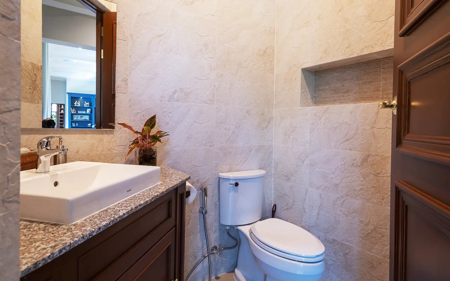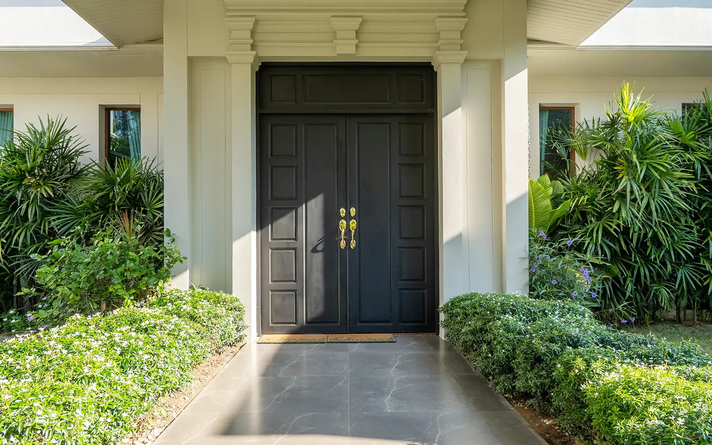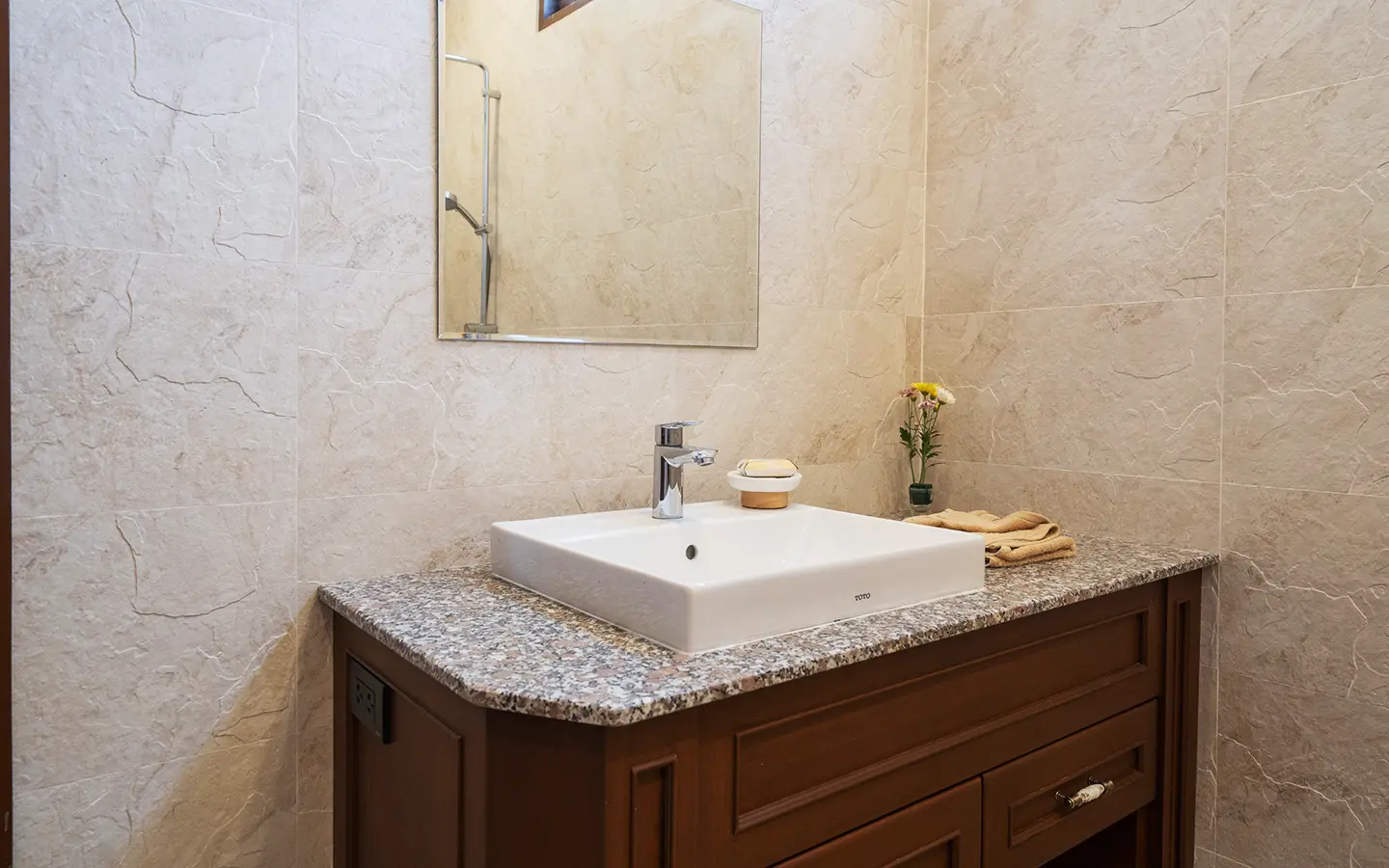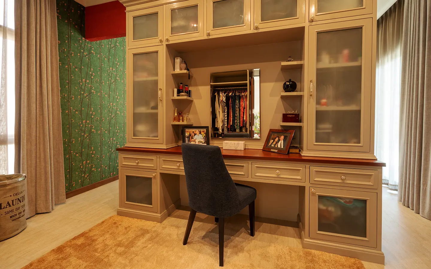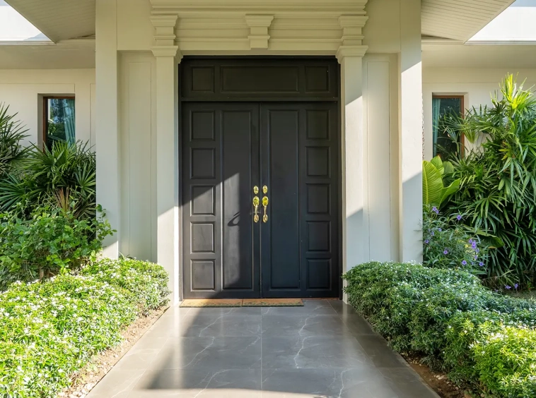 The residence is constructed with double-layer walls, and all doors and windows are custom-made from premium teak wood, designed to minimize dust intrusion and maximize living comfort. High-quality tempered glass is used throughout the home, complemented by a built-in sound system imported from Klipsch. Floor-to-ceiling glass panels in the living area open fully to the terrace and swimming pool, allowing abundant natural light and a seamless indoor-outdoor connection.
