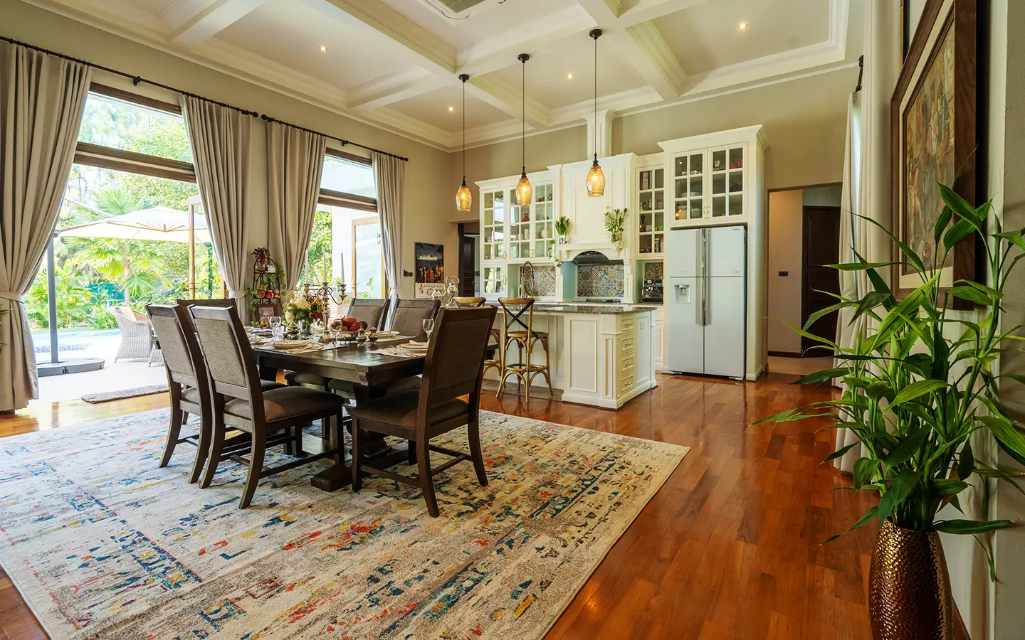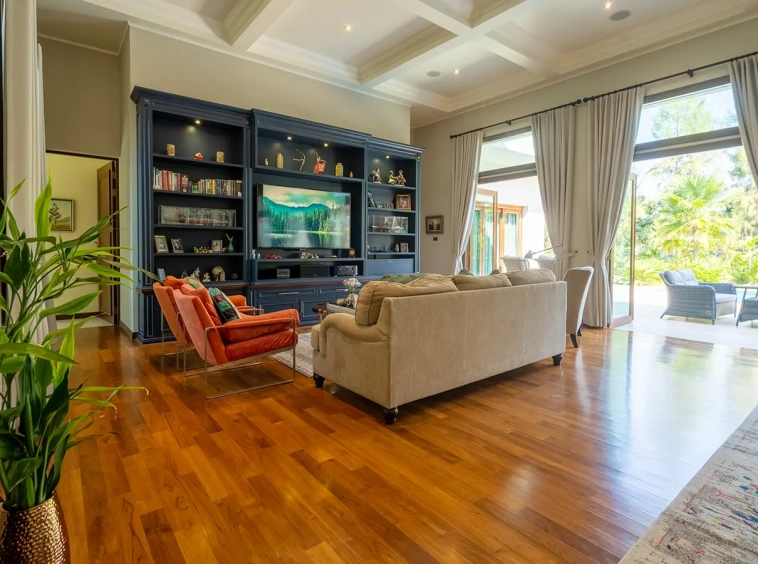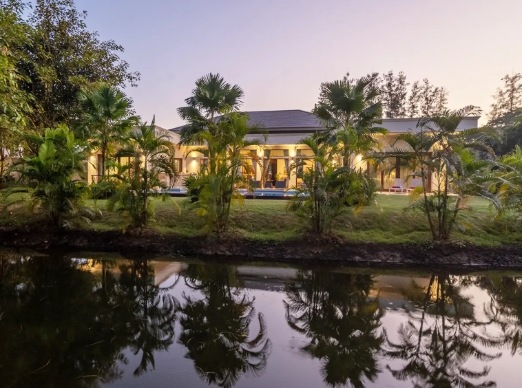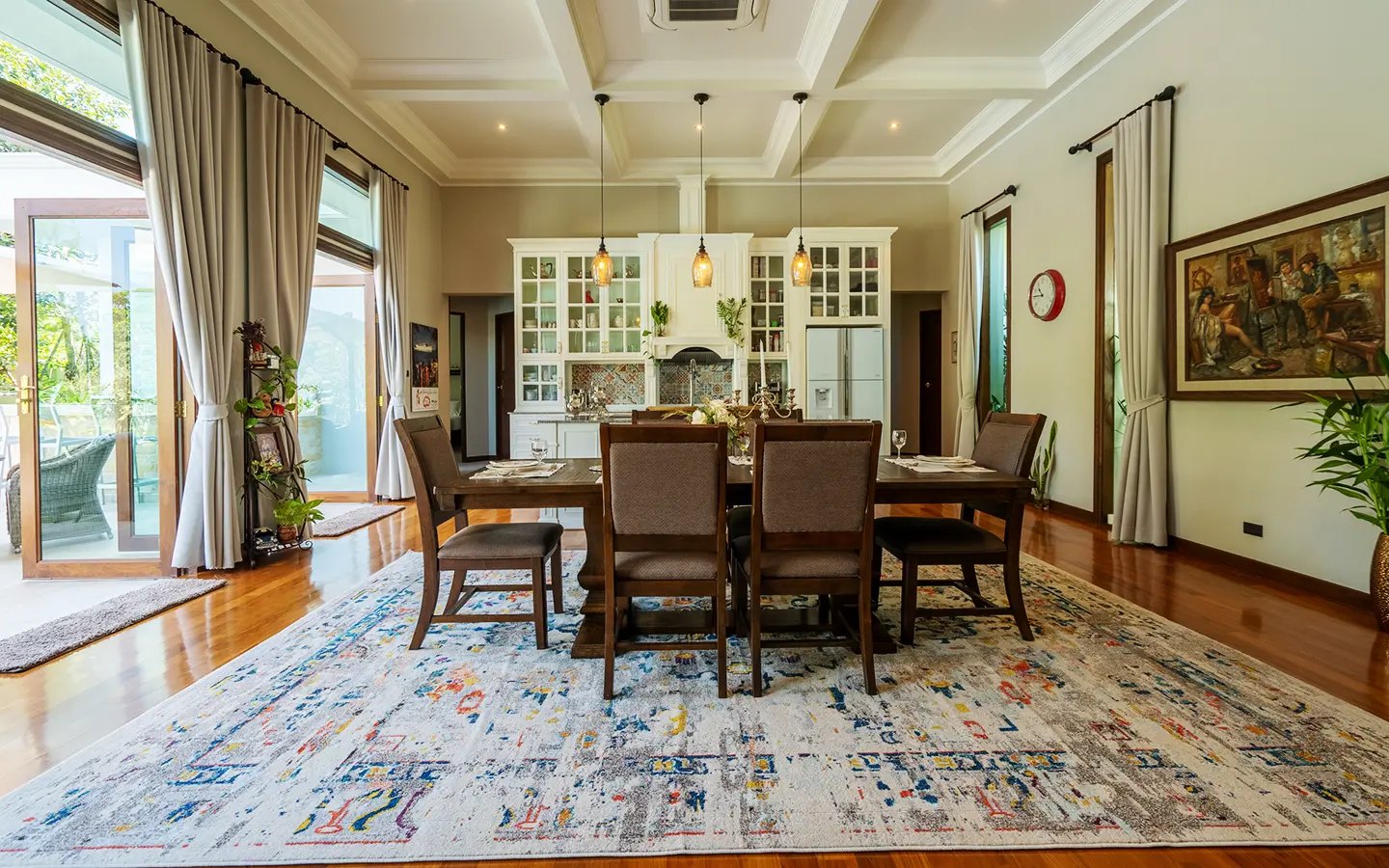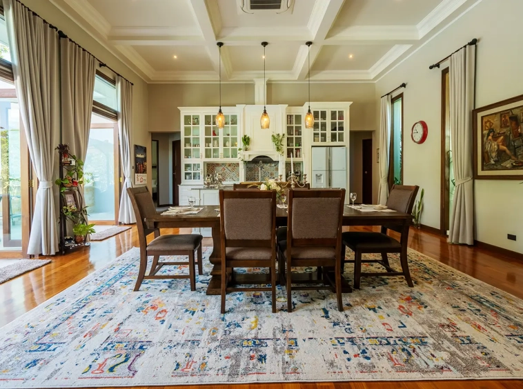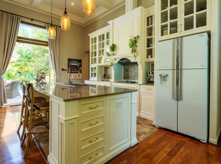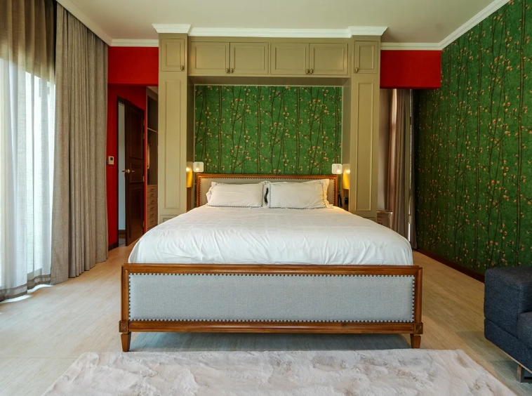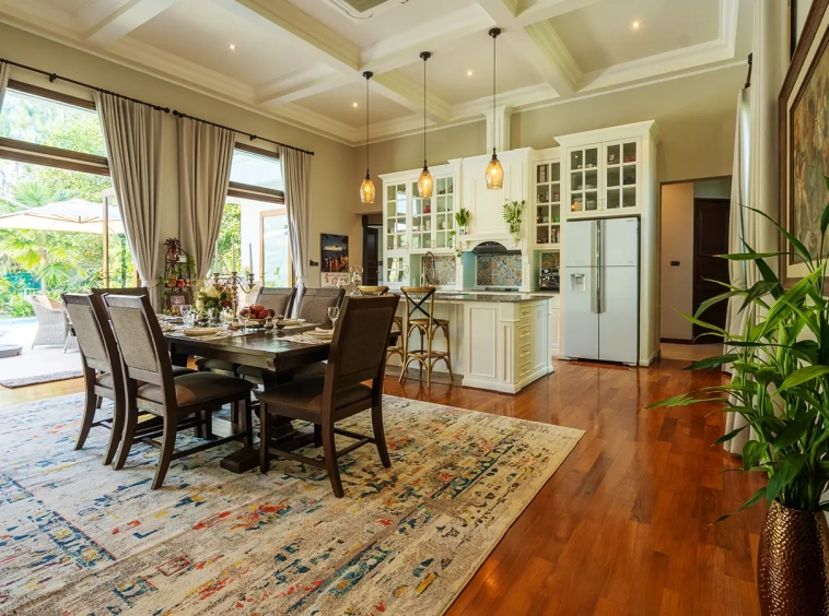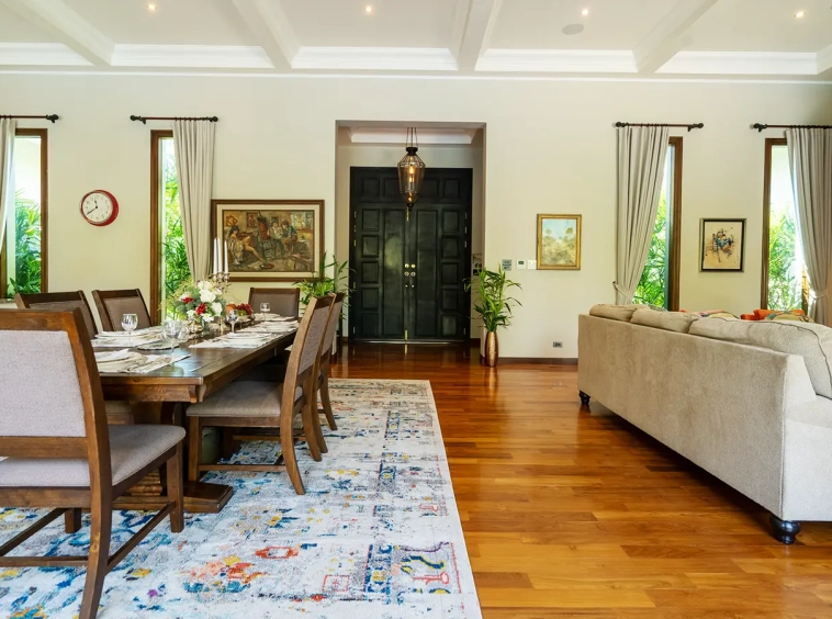 Upon entering the residence, you are greeted by an impressive open-plan living and dining area, seamlessly connected to an elegant island counter and a high-end European-style kitchen with finely crafted built-in cabinetry. The ceilings rise to 3.4 meters and feature a layered architectural design, enhancing the sense of space and sophistication. Natural airflow keeps the home cool and comfortable, while solid teak parquet flooring adds warmth and timeless elegance throughout.