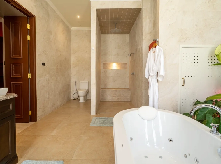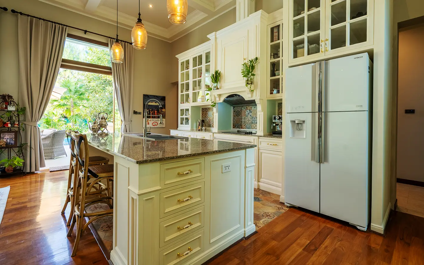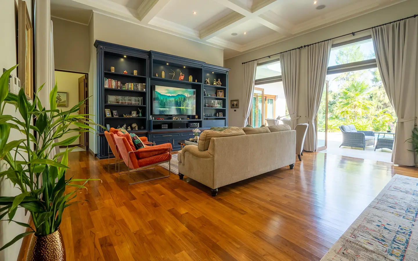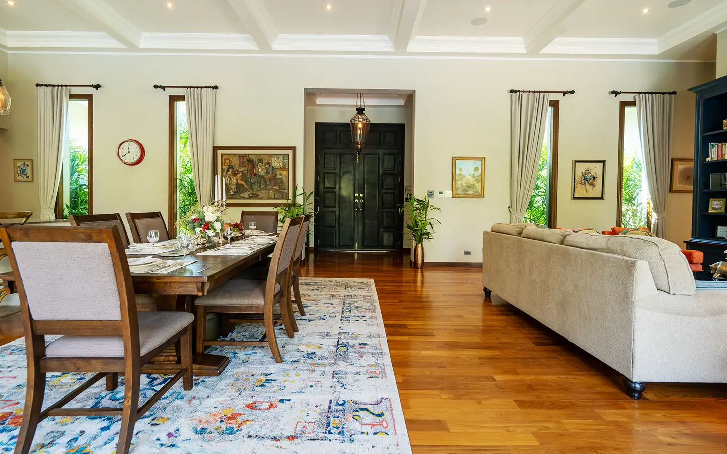 Upon entering the residence, you are greeted by an impressive open-plan living and dining area, seamlessly connected to an elegant island counter and a high-end European-style kitchen with finely crafted built-in cabinetry. The ceilings rise to 3.4 meters and feature a layered architectural design, enhancing the sense of space and sophistication. Natural airflow keeps the home cool and comfortable, while solid teak parquet flooring adds warmth and timeless elegance throughout.