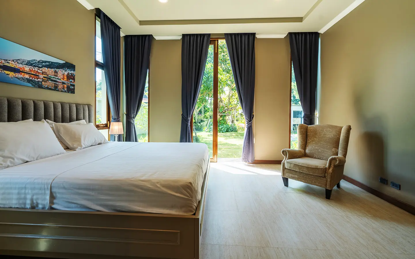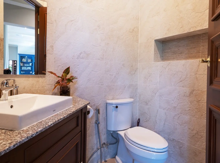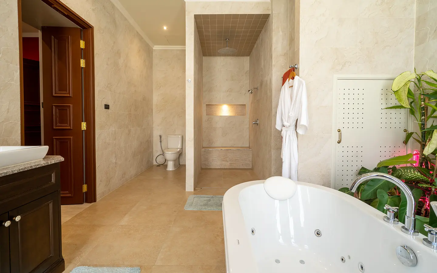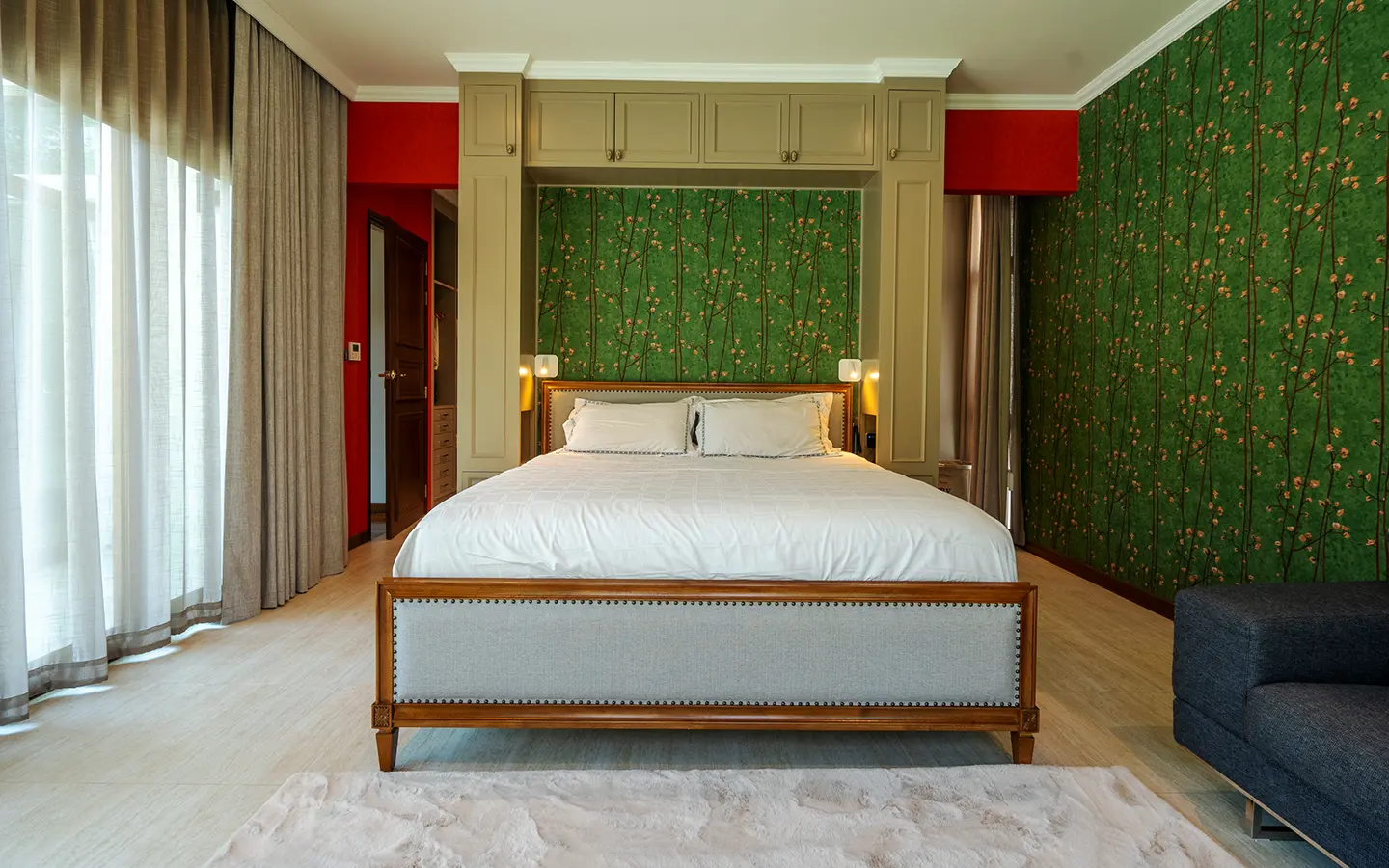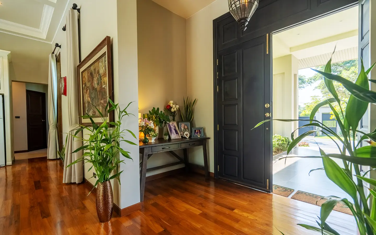 Upon entering the residence, you are greeted by an impressive open-plan living and dining area, seamlessly connected to an elegant island counter and a high-end European-style kitchen with finely crafted built-in cabinetry. The ceilings rise to 3.4 meters and feature a layered architectural design, enhancing the sense of space and sophistication. Natural airflow keeps the home cool and comfortable, while solid teak parquet flooring adds warmth and timeless elegance throughout.