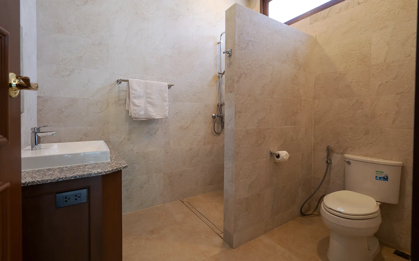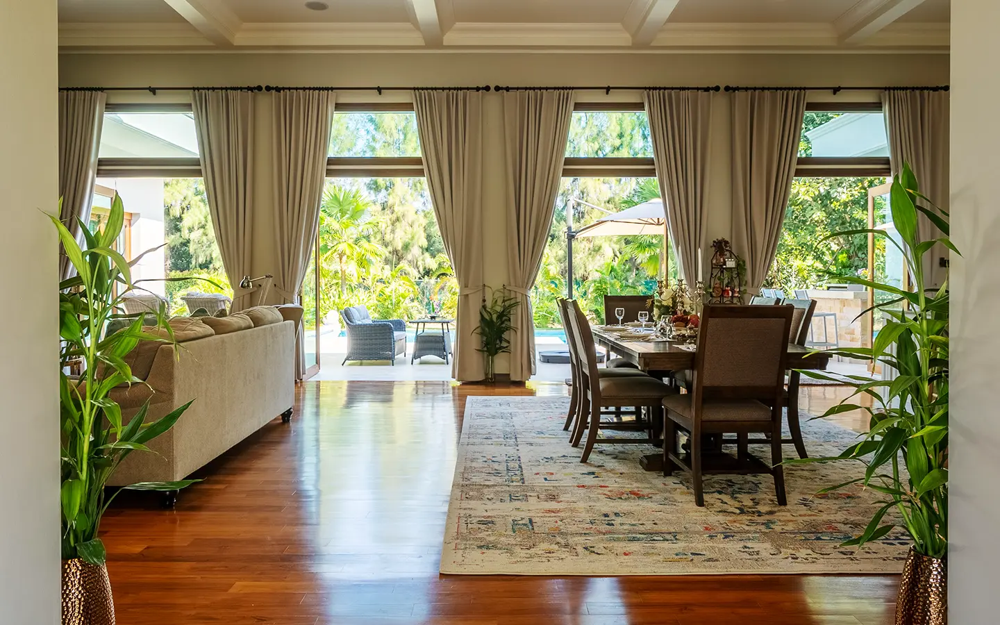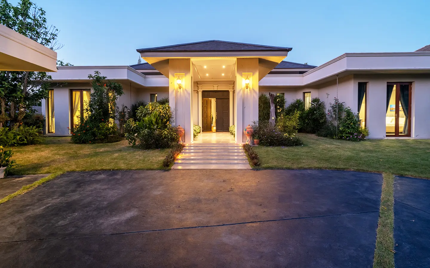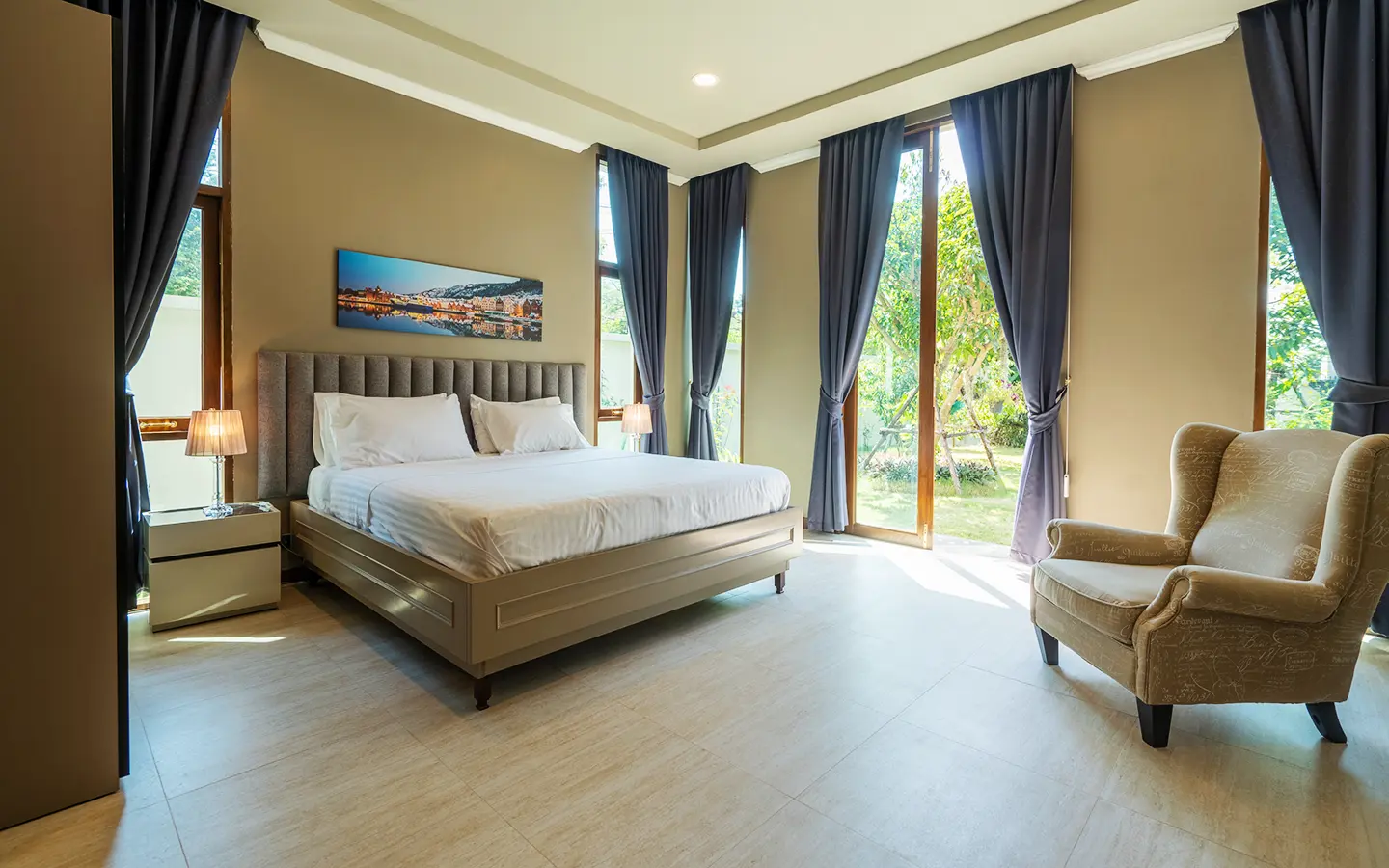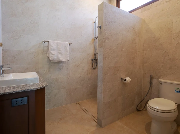 Upon entering the residence, you are greeted by an impressive open-plan living and dining area, seamlessly connected to an elegant island counter and a high-end European-style kitchen with finely crafted built-in cabinetry. The ceilings rise to 3.4 meters and feature a layered architectural design, enhancing the sense of space and sophistication. Natural airflow keeps the home cool and comfortable, while solid teak parquet flooring adds warmth and timeless elegance throughout.
