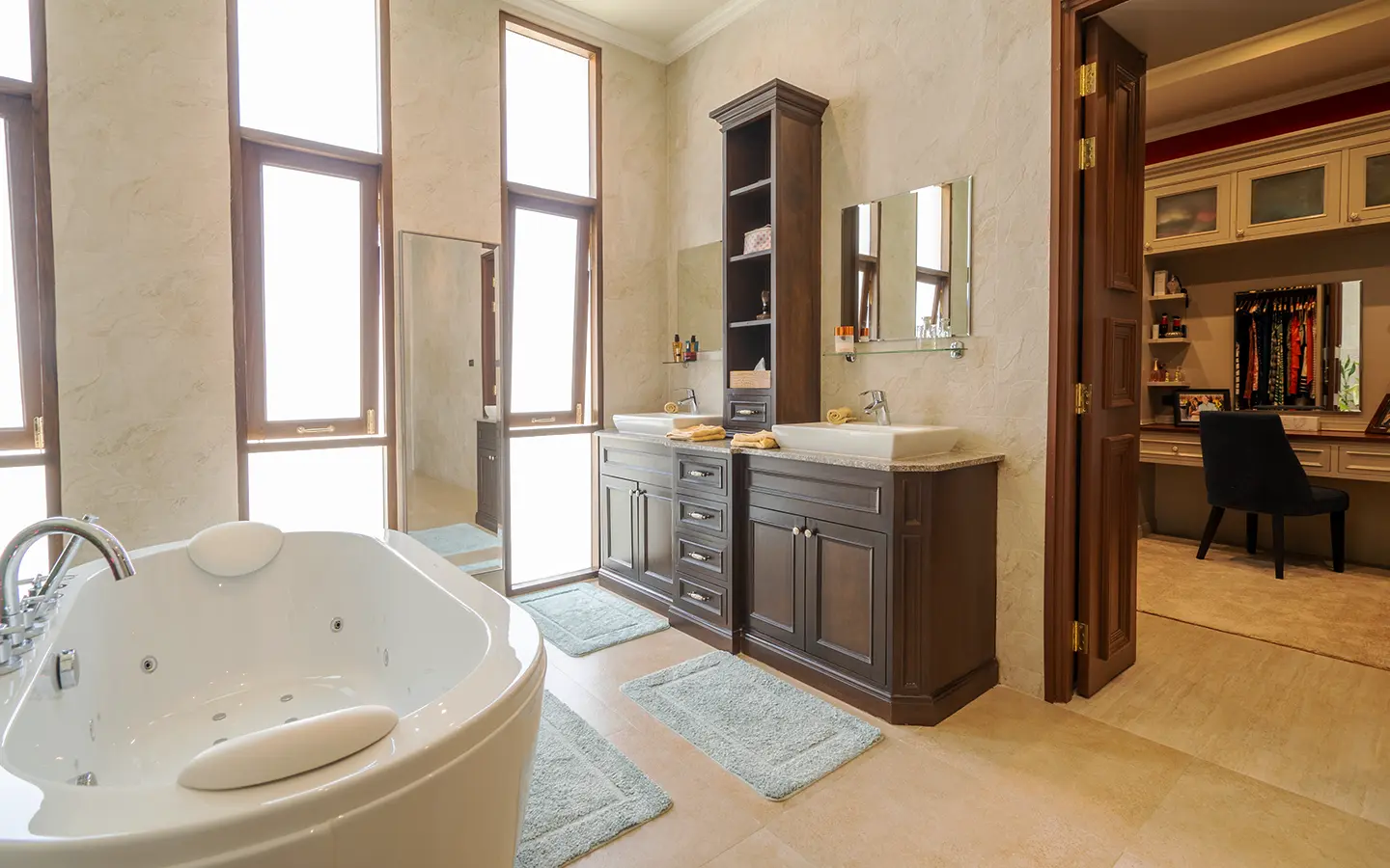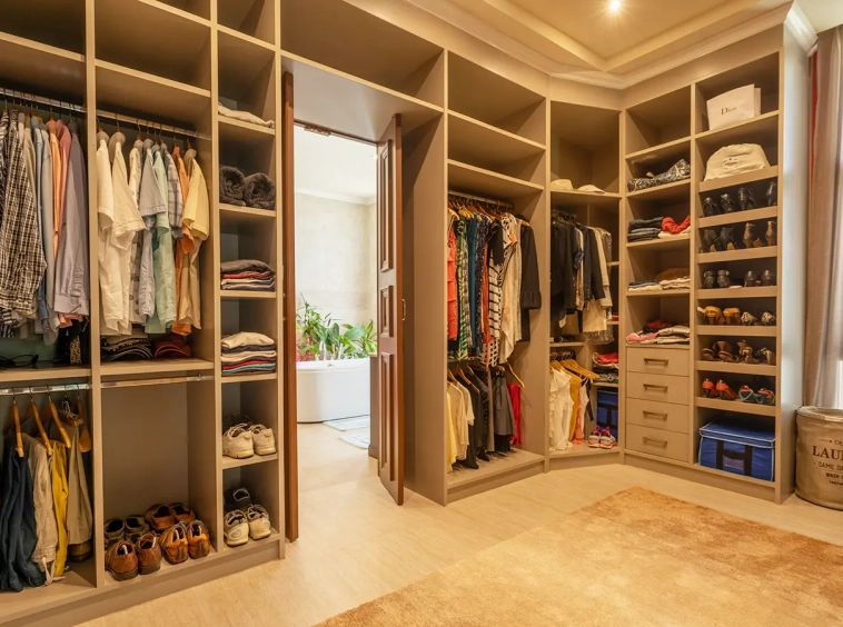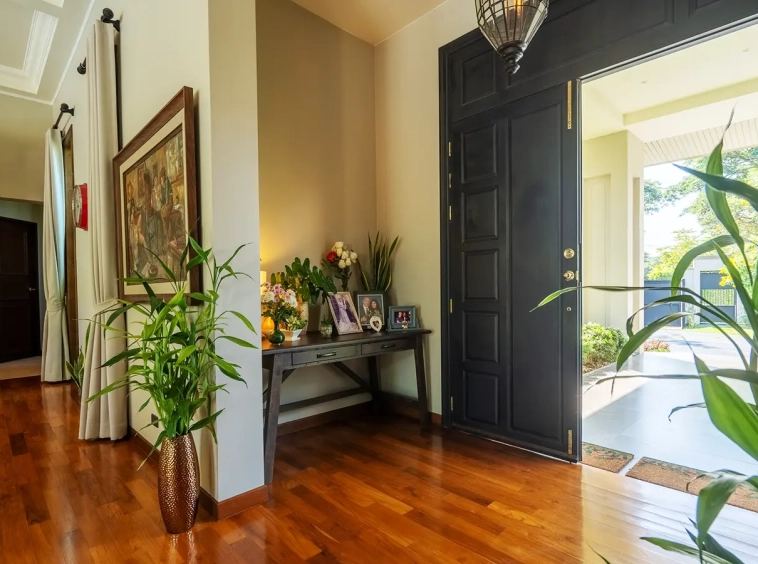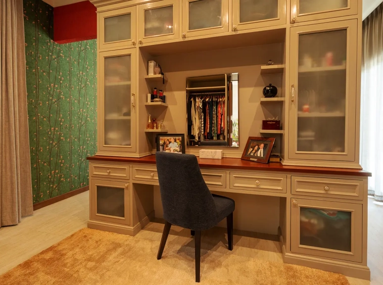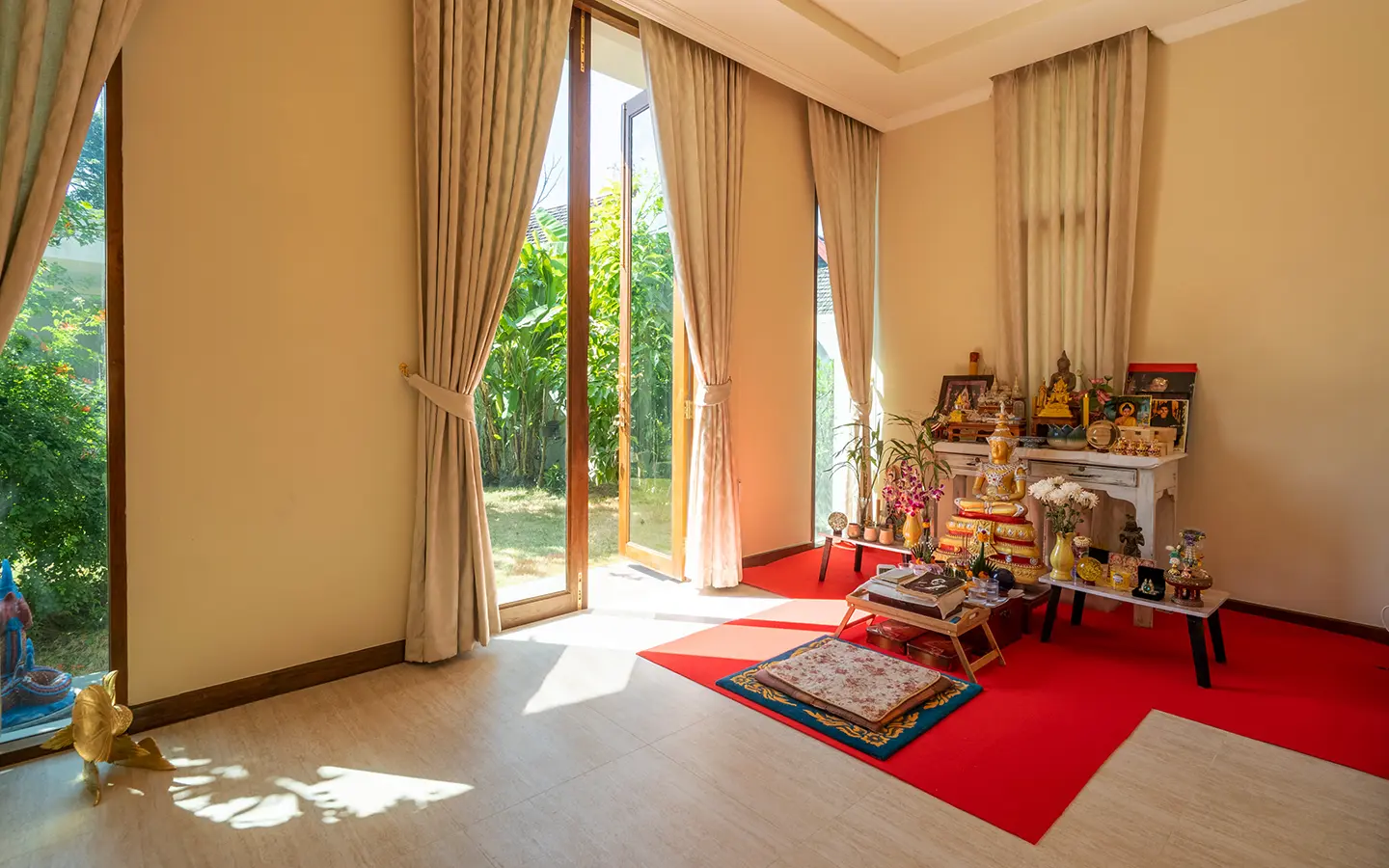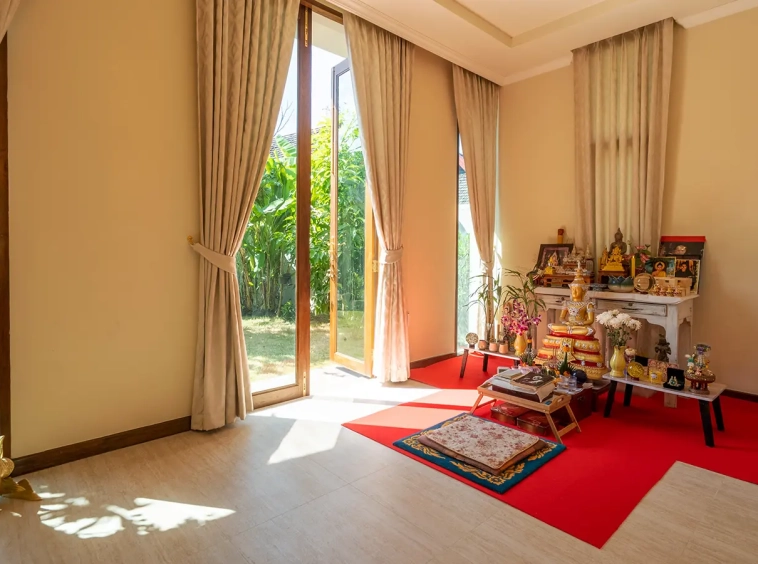 To the left of the living area is a dedicated Buddha room, which may also serve as a private study or multi-purpose room or the fourth bedroom. The master suite features a fully built-in teak walk-in wardrobe, a dressing table, and a luxurious ensuite bathroom complete with a bathtub, natural light, premium sanitary fittings, a high-quality hot water system, and Italian-imported tiles.