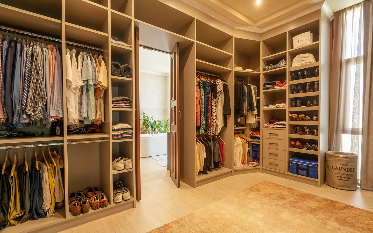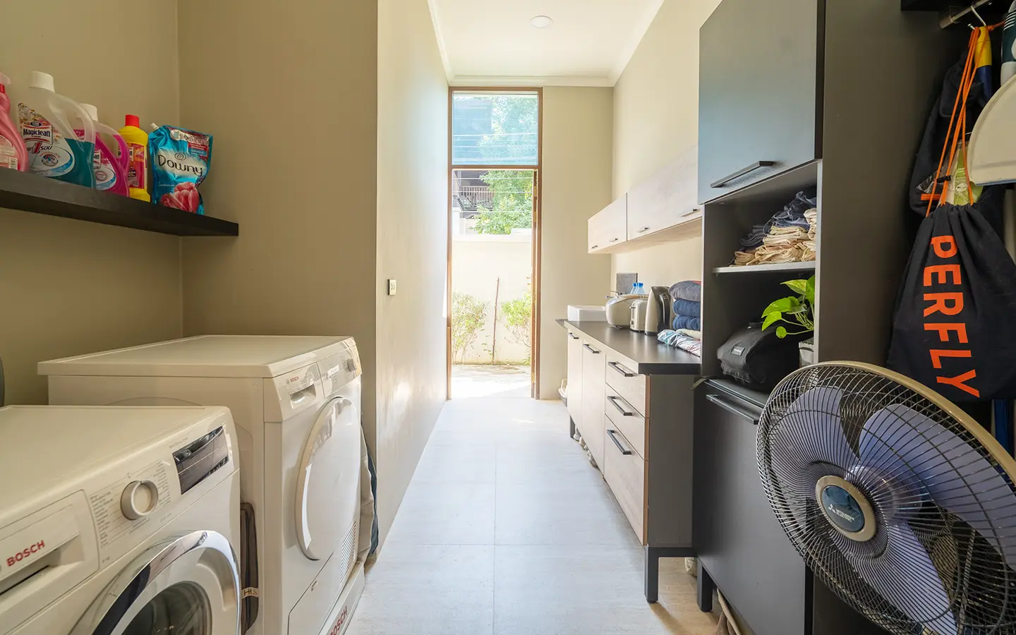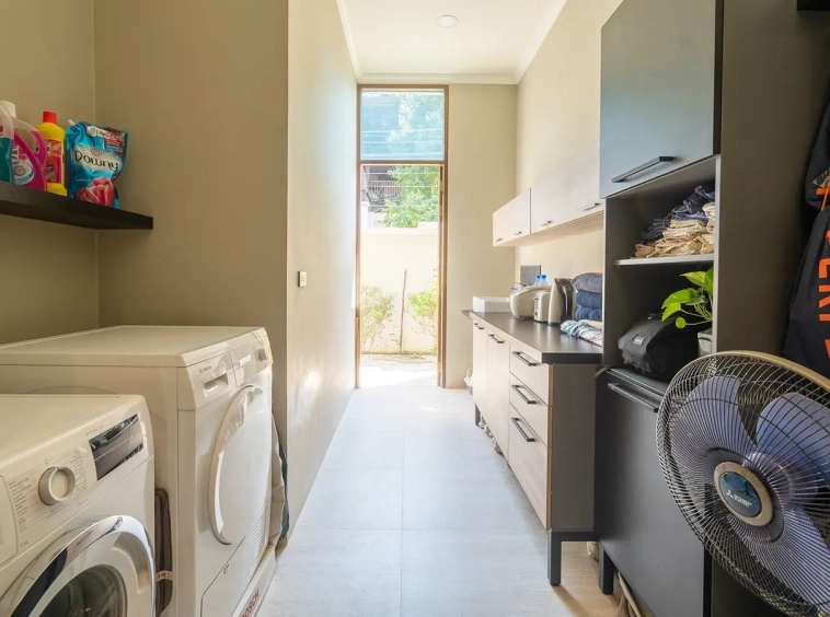 Behind the kitchen area are two additional bedrooms, each with a private ensuite bathroom, along with a well-designed laundry room and storage space.