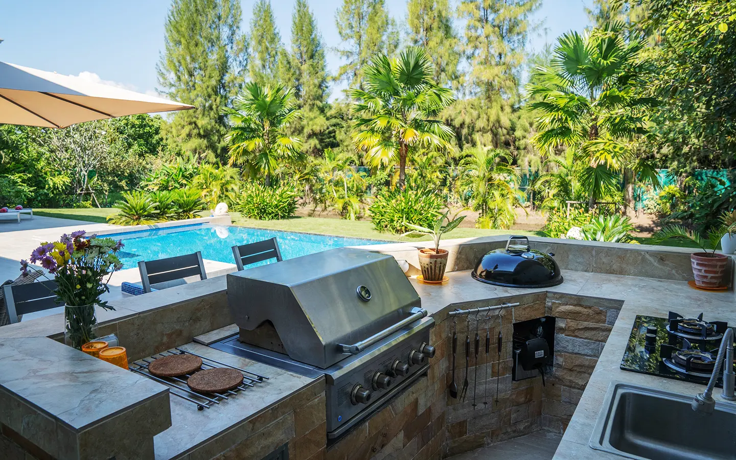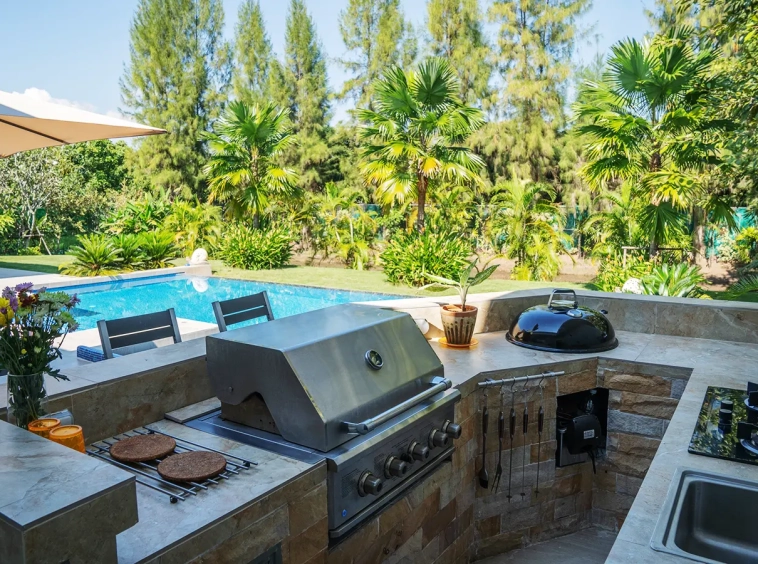 The outdoor terrace is thoughtfully designed for both relaxation and entertaining, featuring an imported barbecue grill, an alfresco dining area, and comfortable lounge spaces. The 5 x 15-meter swimming pool utilizes a UV system without chemical treatment, ensuring a clean and safe swimming environment. The rainwater drainage system is discreetly concealed along the roof edges and flows underground to a hidden rear water feature. Beyond the pool lies a landscaped garden and a natural pond. The house faces north, reducing heat exposure, and is surrounded by lush greenery that enhances privacy.
