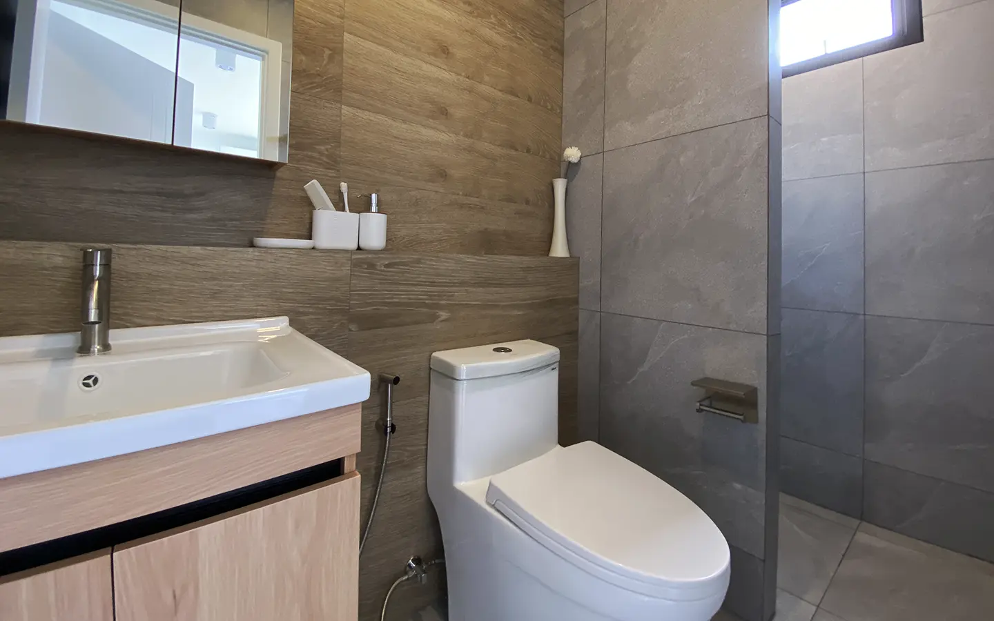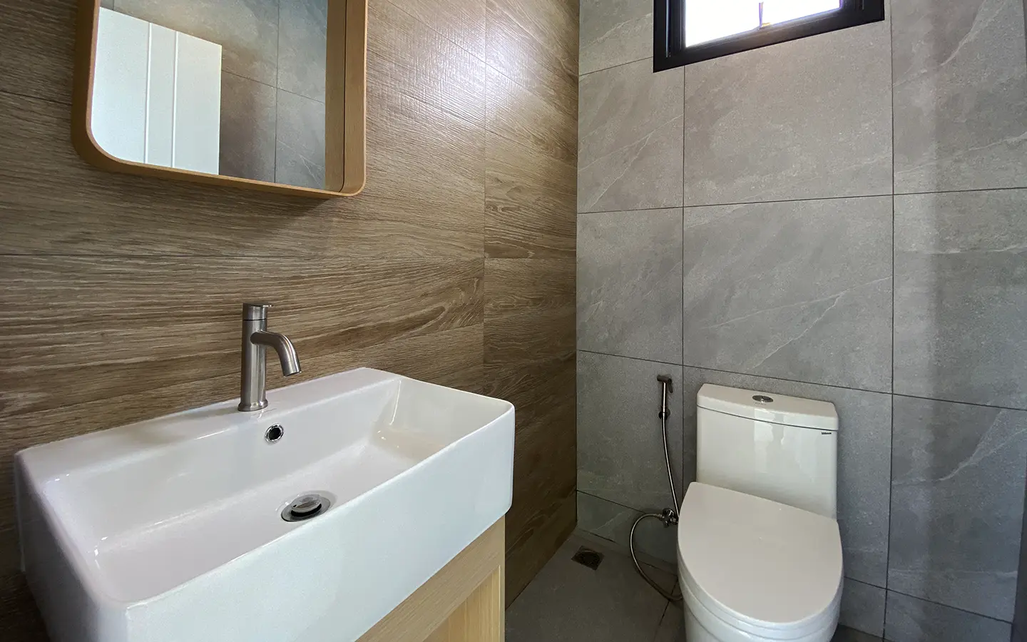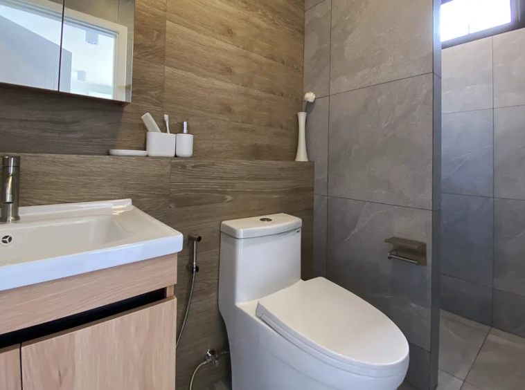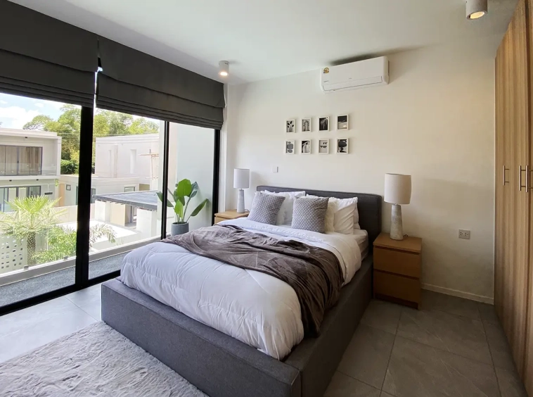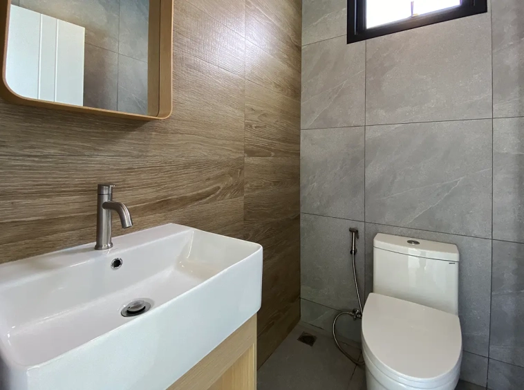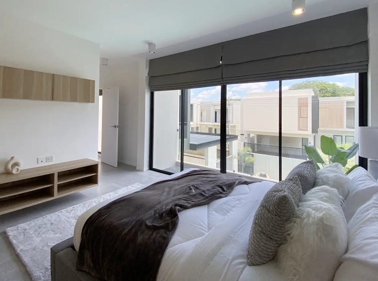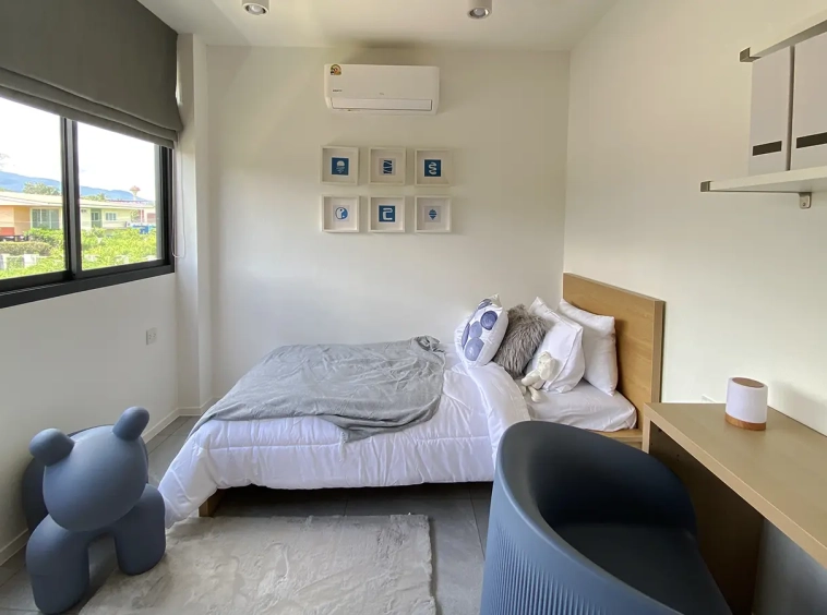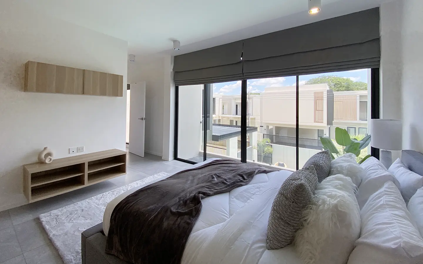 Upstairs, you’ll find three bedrooms. The master bedroom comes with its own living area, a walk-in closet, a private bathroom with a bathtub, and a balcony. The second and third bedrooms both have ensuite bathrooms. The second bedroom also features a wide balcony, perfect for setting up an outdoor sitting area or enjoying your morning coffee.