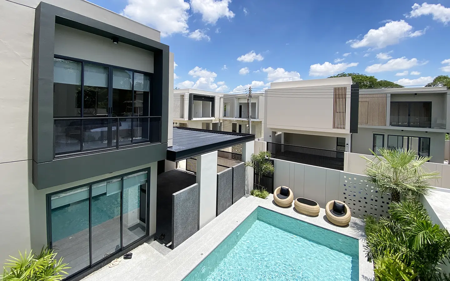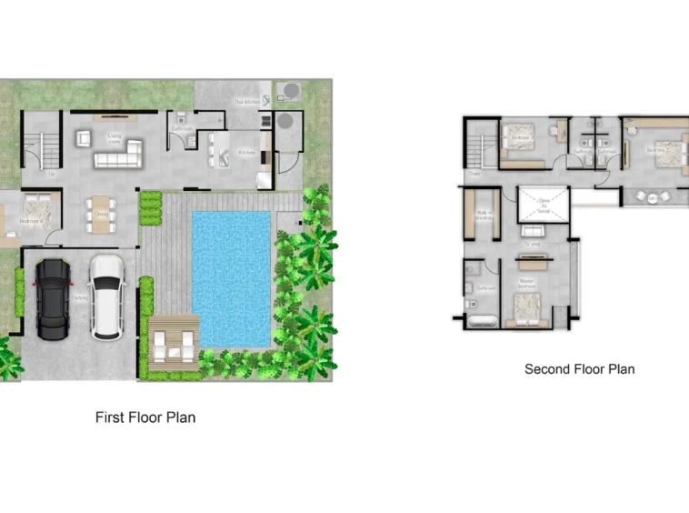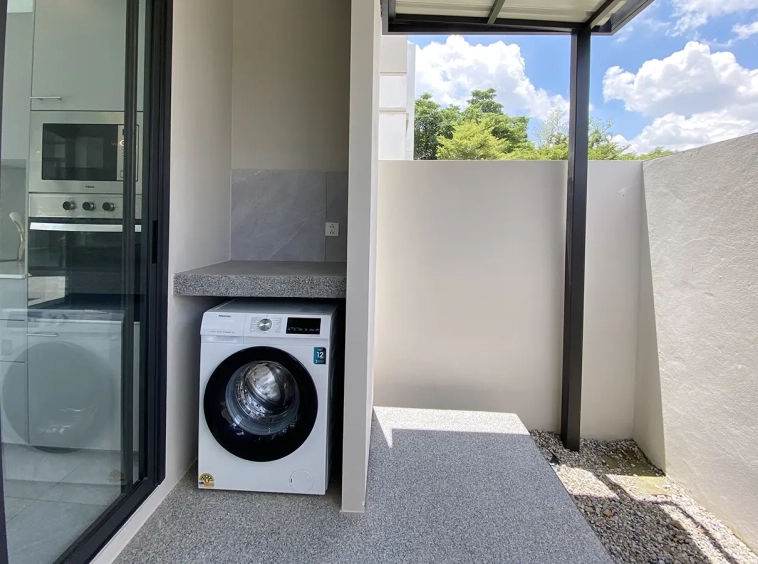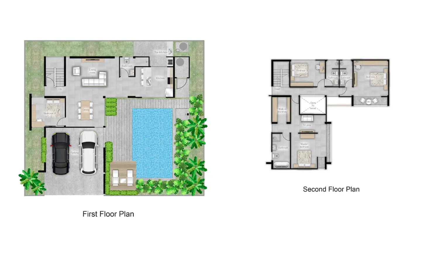 As you walk in, there is parking space for two cars. The ground floor includes a guest bedroom—perfect for elderly family members or as a home office—a spacious living area, a guest bathroom, and a dining area with a stunning double-volume ceiling that opens to the second floor. The Western-style kitchen is beautifully designed and fully equipped, with an additional Thai kitchen and laundry area at the back for convenience.