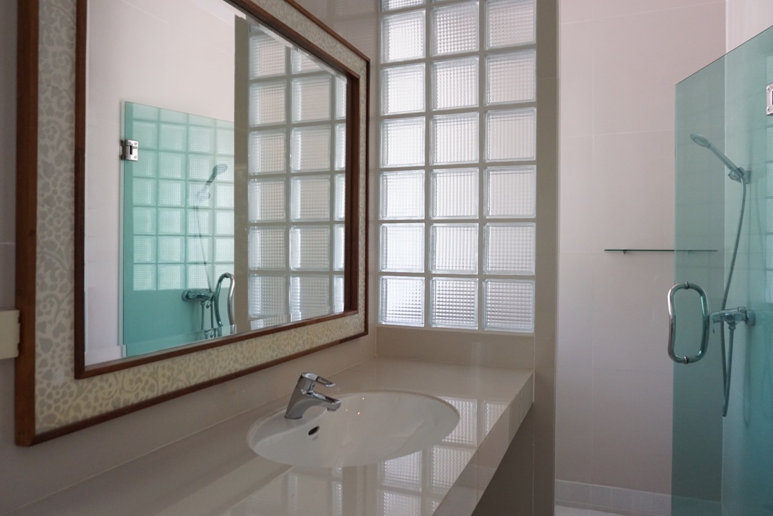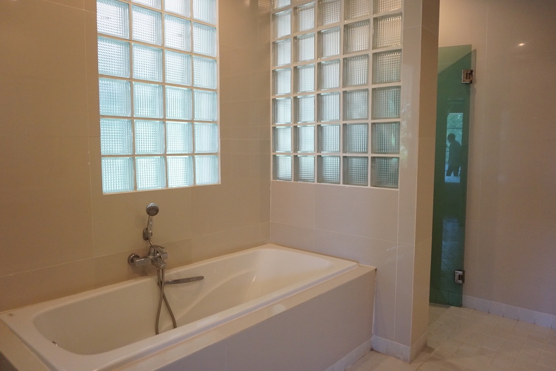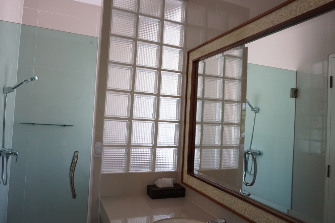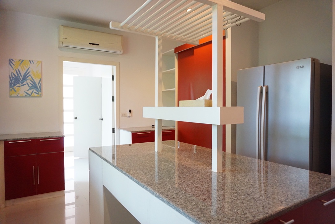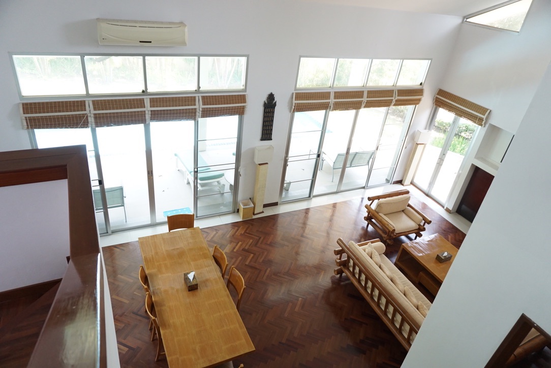 On the first floor, there is an open plan living and dining area, there are high ceilings and many full lengths glazed sliding doors. It is a light, airy property and allows a cool breeze to gently blow through the house which negates the use of the air conditioning units during the daytime. There is a storage room, a guest bathroom, and a study room which can be used as another guest bedroom with an en-suite bathroom, there is also a glazed sliding door to a covered terrace. There is a spacious Western-style kitchen which is fully equipped, with plenty of drawers and storage cabinets and a large preparation island which has a granite work surface.
