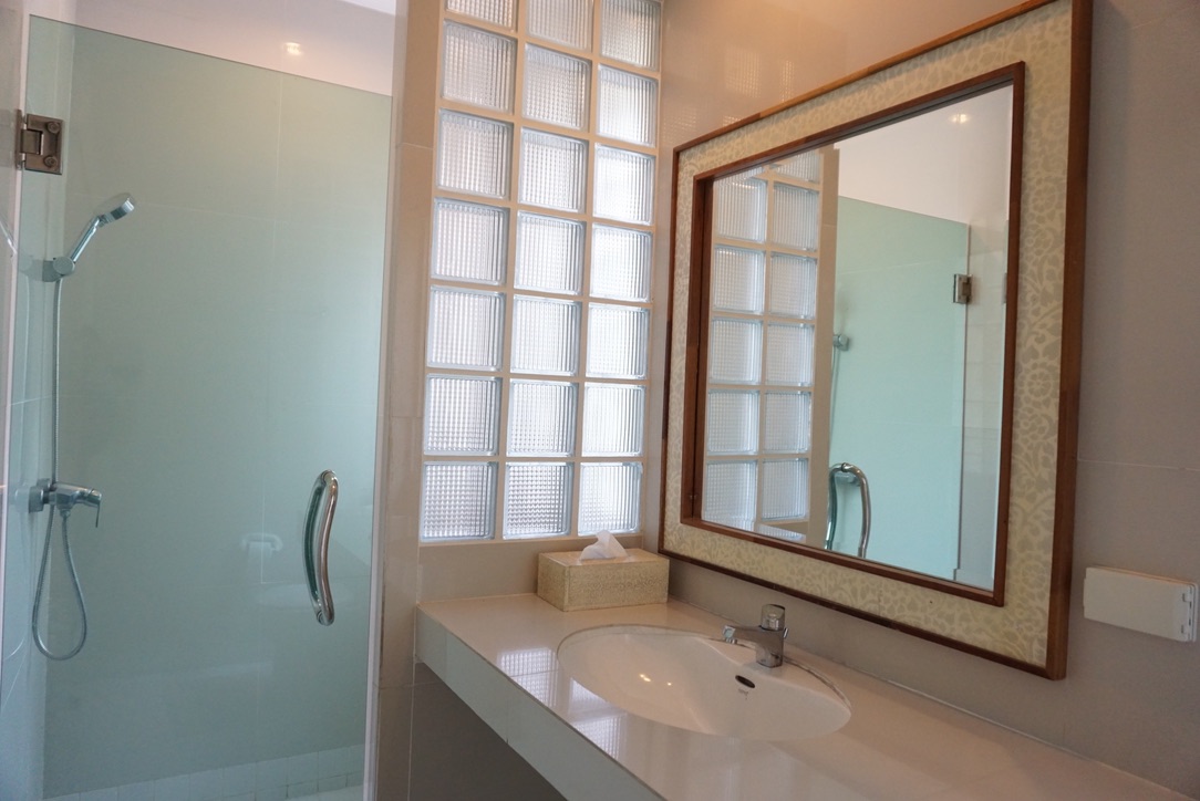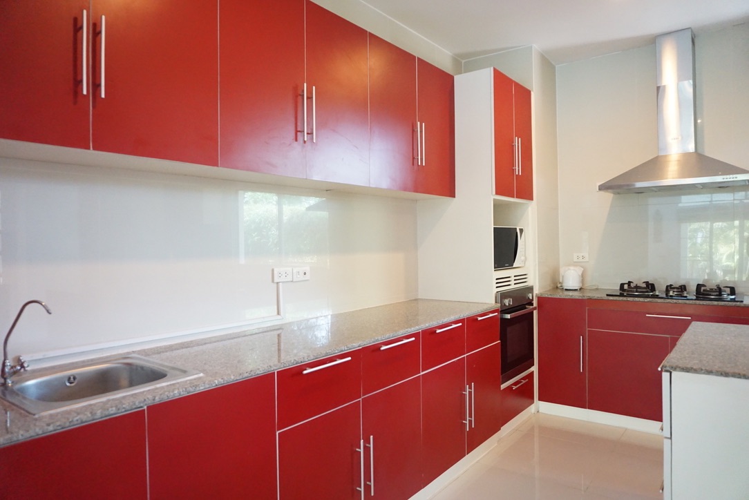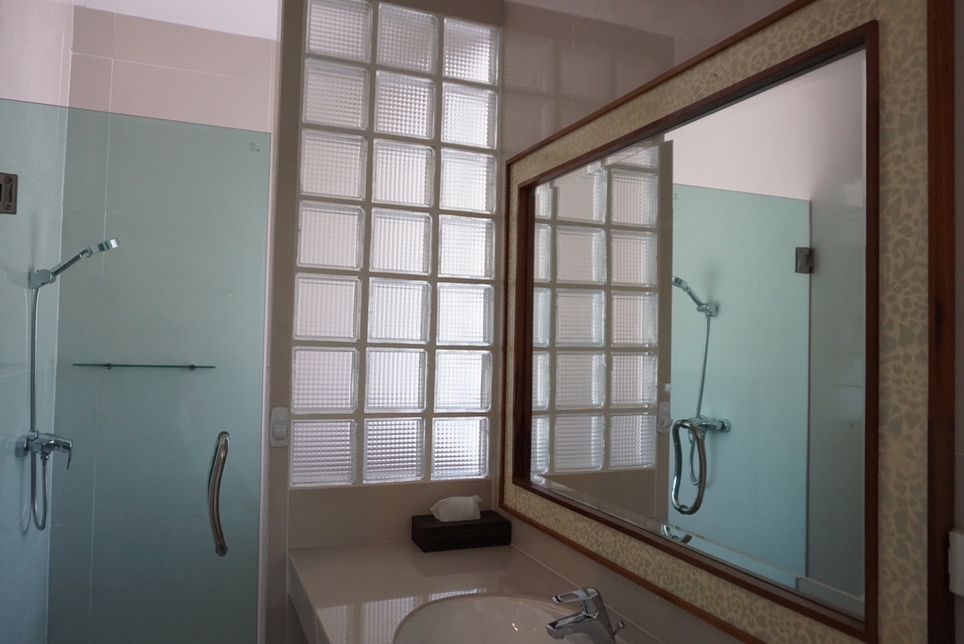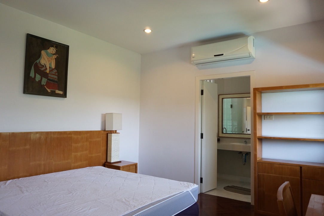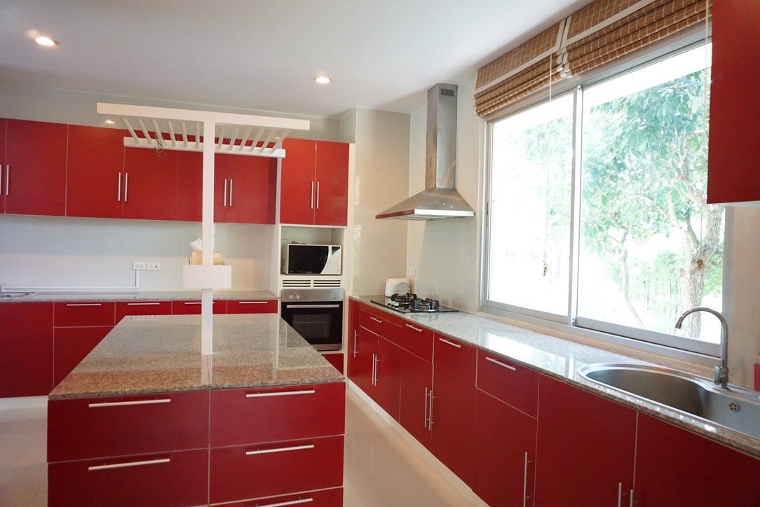 On the first floor, there is an open plan living and dining area, there are high ceilings and many full lengths glazed sliding doors. It is a light, airy property and allows a cool breeze to gently blow through the house which negates the use of the air conditioning units during the daytime. There is a storage room, a guest bathroom, and a study room which can be used as another guest bedroom with an en-suite bathroom, there is also a glazed sliding door to a covered terrace. There is a spacious Western-style kitchen which is fully equipped, with plenty of drawers and storage cabinets and a large preparation island which has a granite work surface.