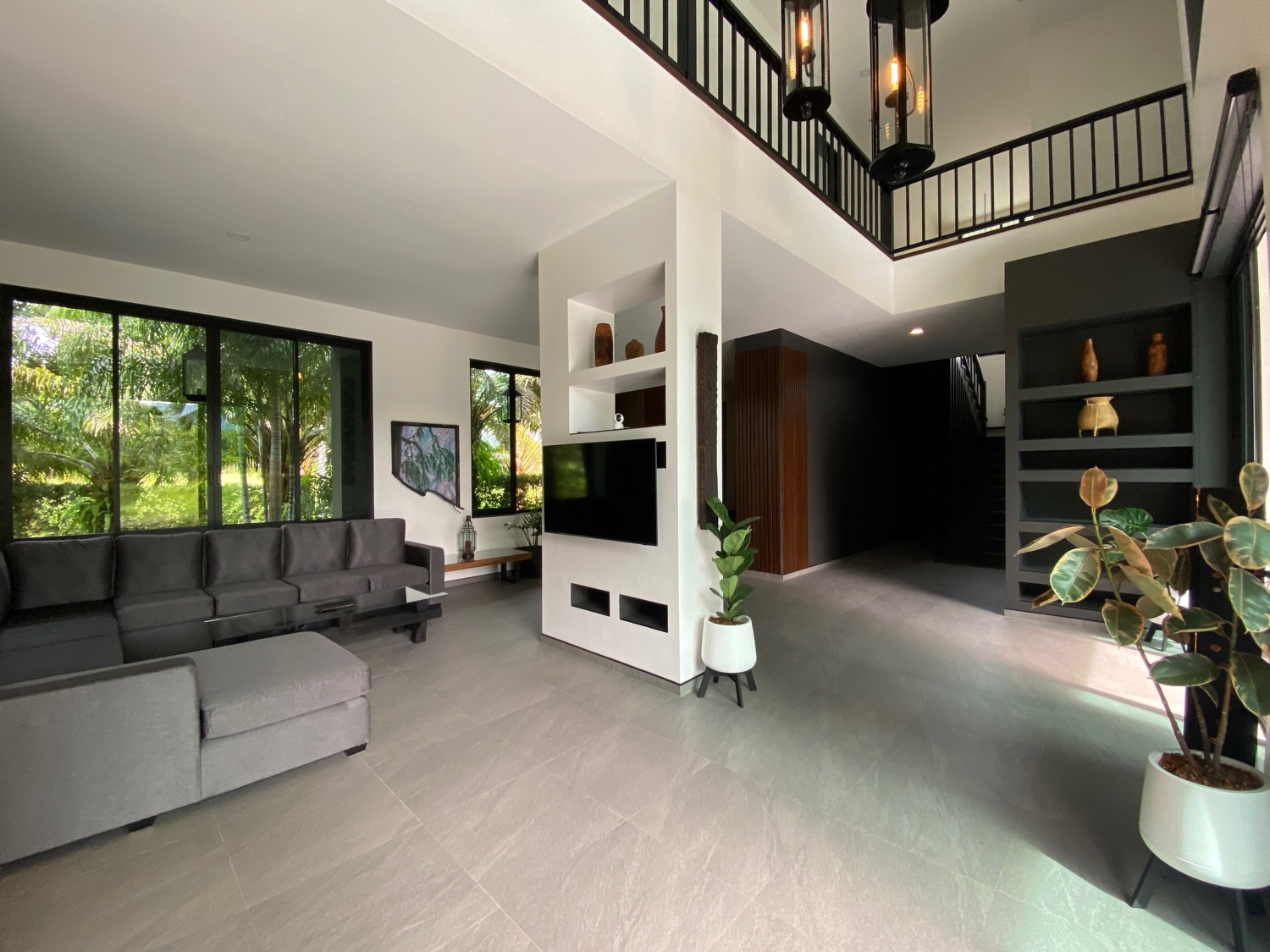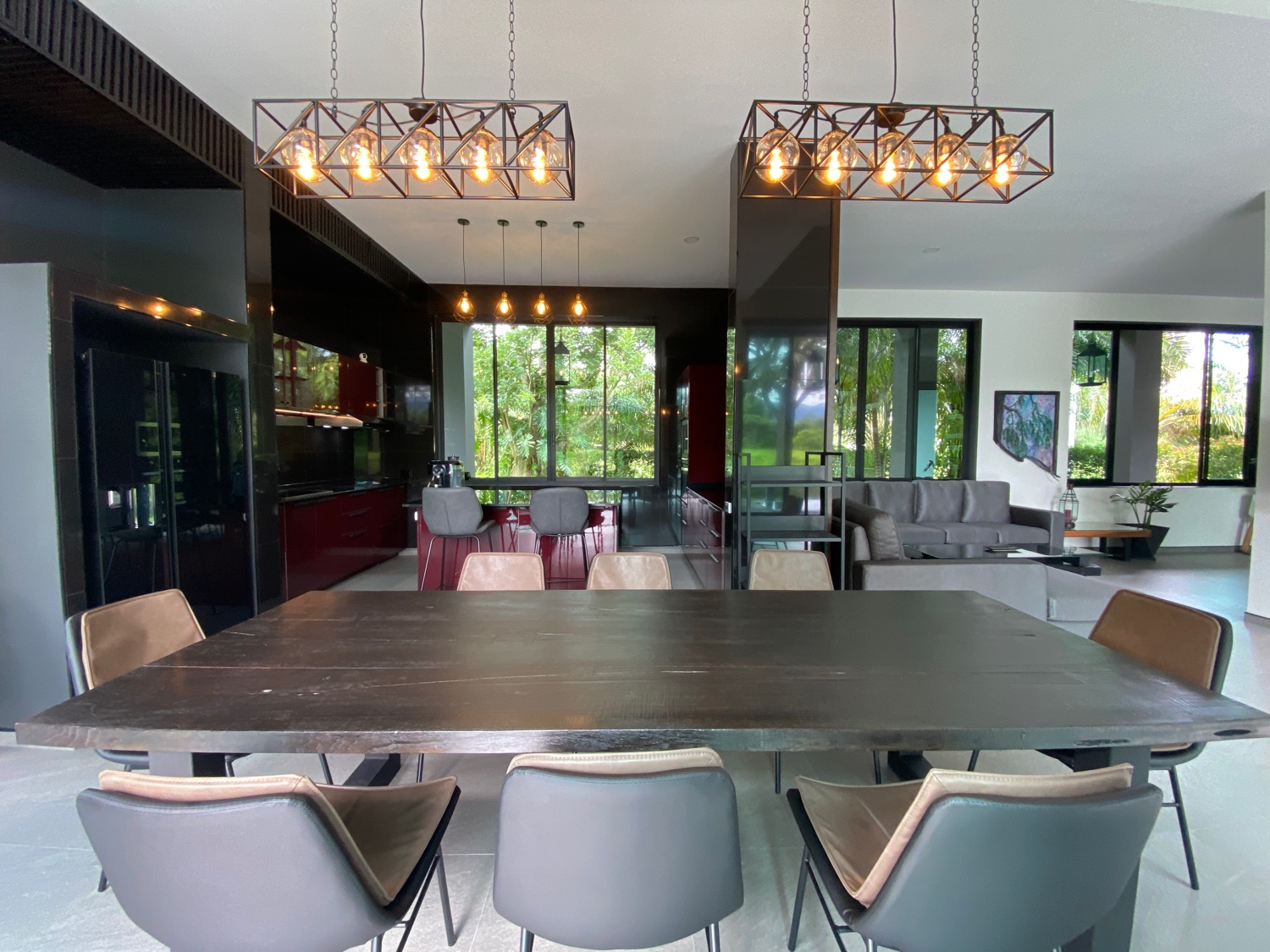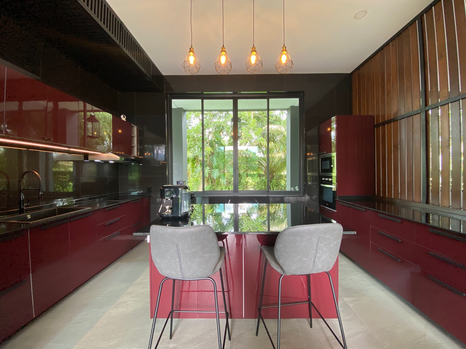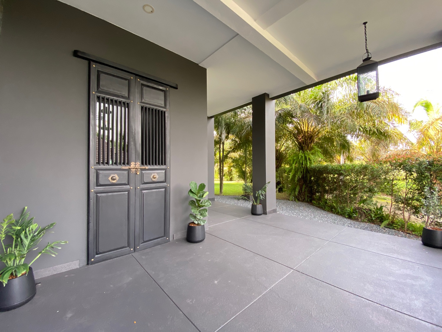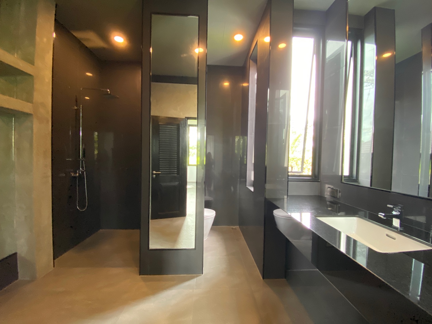 From the entrance, there is a small building containing the carport and maid's quarter. Further on is the main house which is built in modern Colonial style with tall ceilings and wrapped around terraces. On the ground floor, there is an en-suite guest bedroom, a large open-plan living and dining area and a fully fitted Western kitchen with built-in appliances and a large breakfast island. The entire ground floor is enveloping and has access to the pool.
