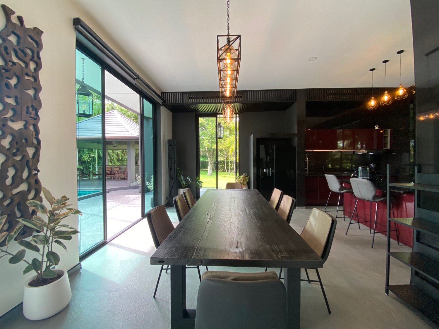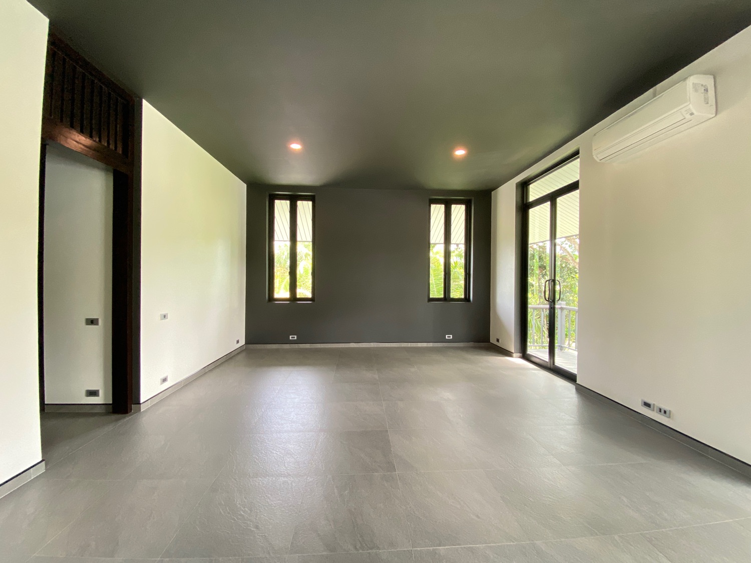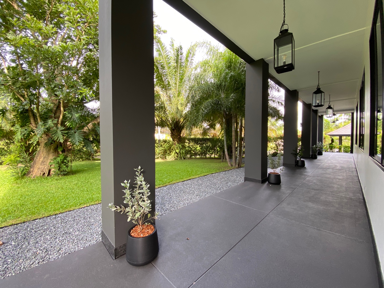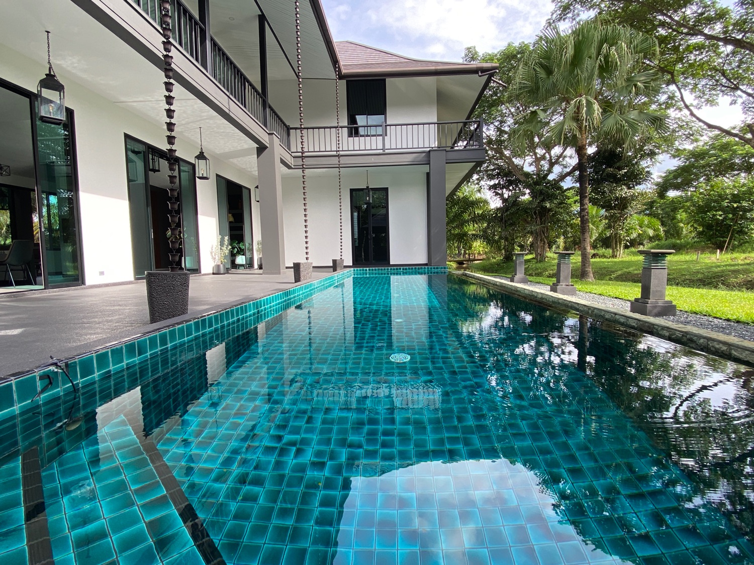 From the entrance, there is a small building containing the carport and maid's quarter. Further on is the main house which is built in modern Colonial style with tall ceilings and wrapped around terraces. On the ground floor, there is an en-suite guest bedroom, a large open-plan living and dining area and a fully fitted Western kitchen with built-in appliances and a large breakfast island. The entire ground floor is enveloping and has access to the pool.