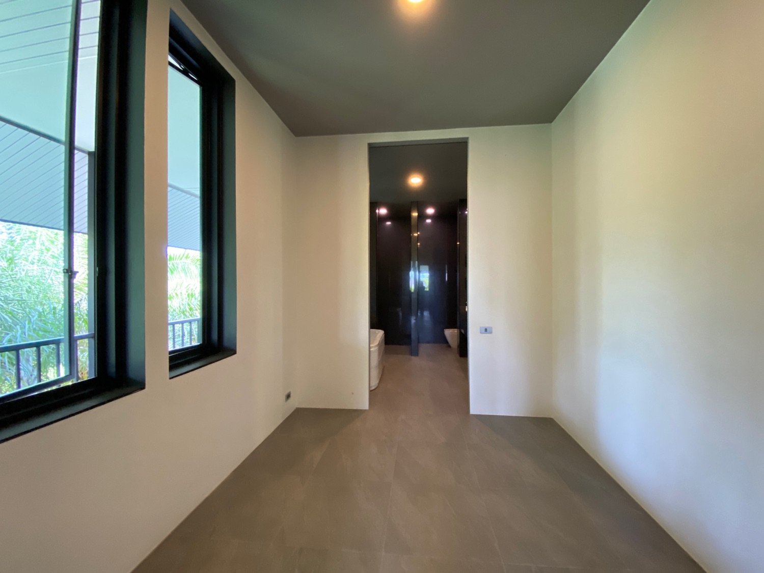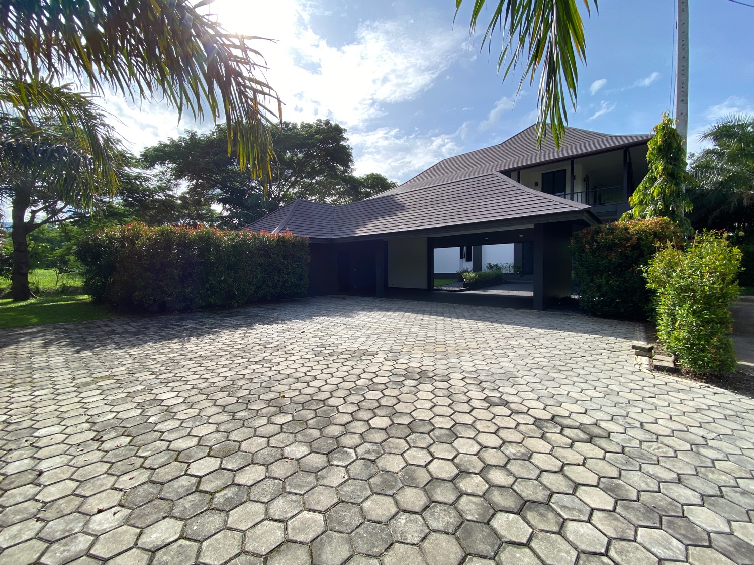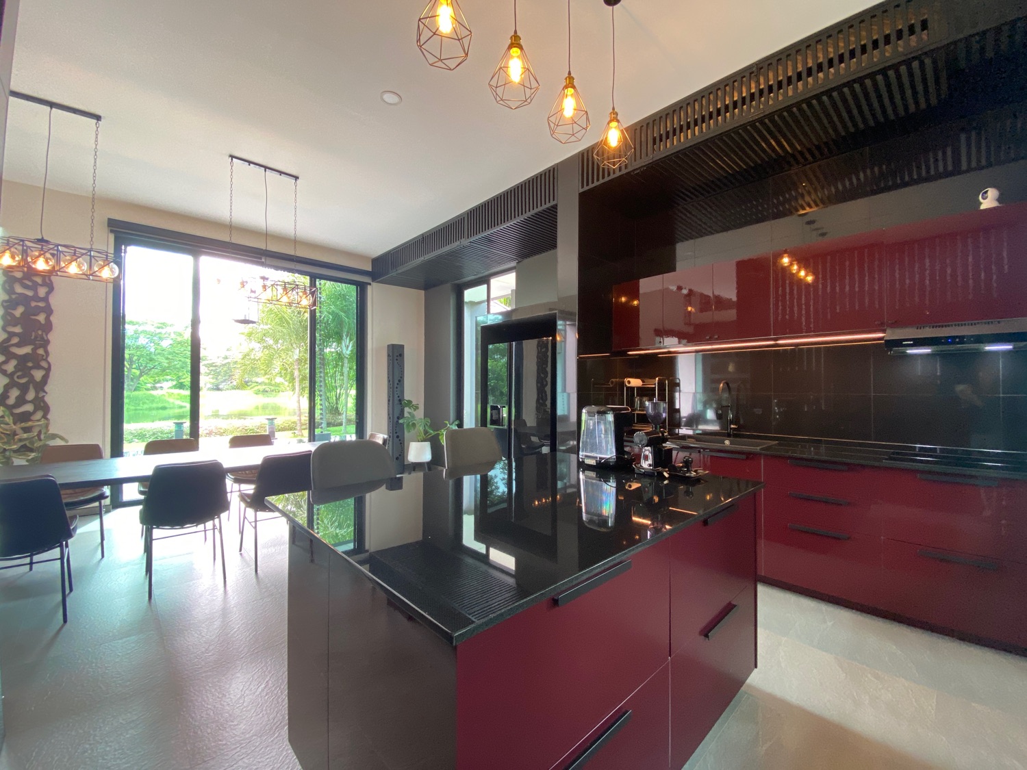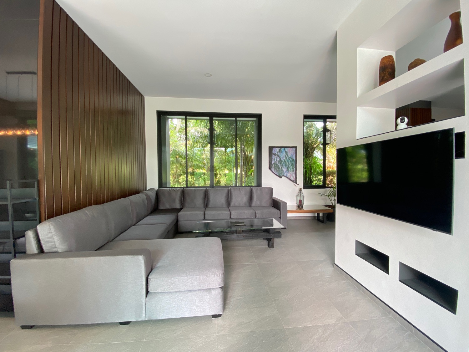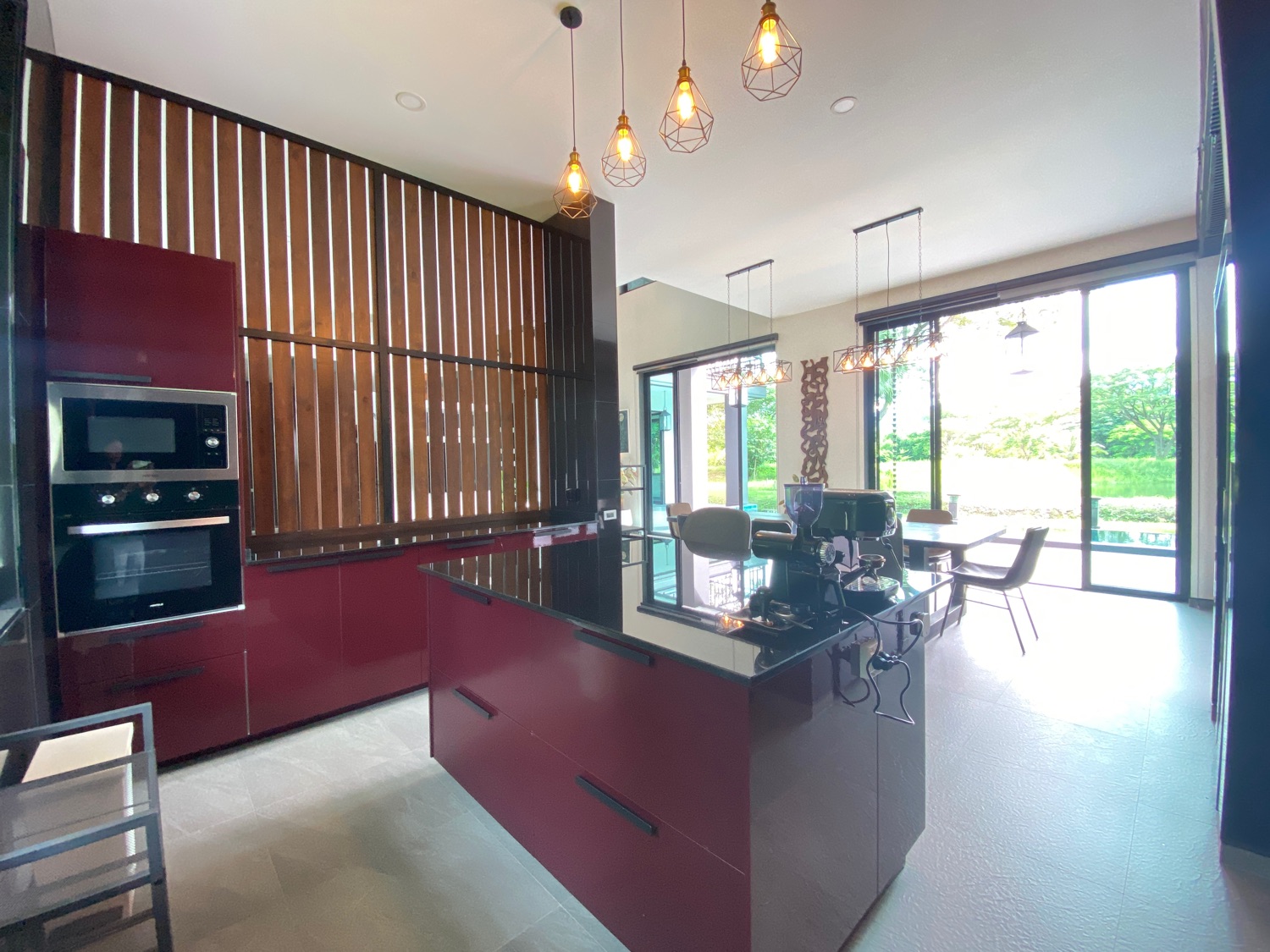 From the entrance, there is a small building containing the carport and maid's quarter. Further on is the main house which is built in modern Colonial style with tall ceilings and wrapped around terraces. On the ground floor, there is an en-suite guest bedroom, a large open-plan living and dining area and a fully fitted Western kitchen with built-in appliances and a large breakfast island. The entire ground floor is enveloping and has access to the pool.
