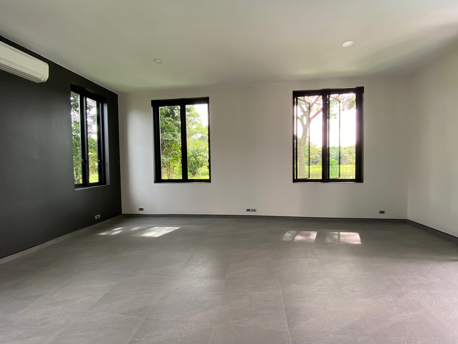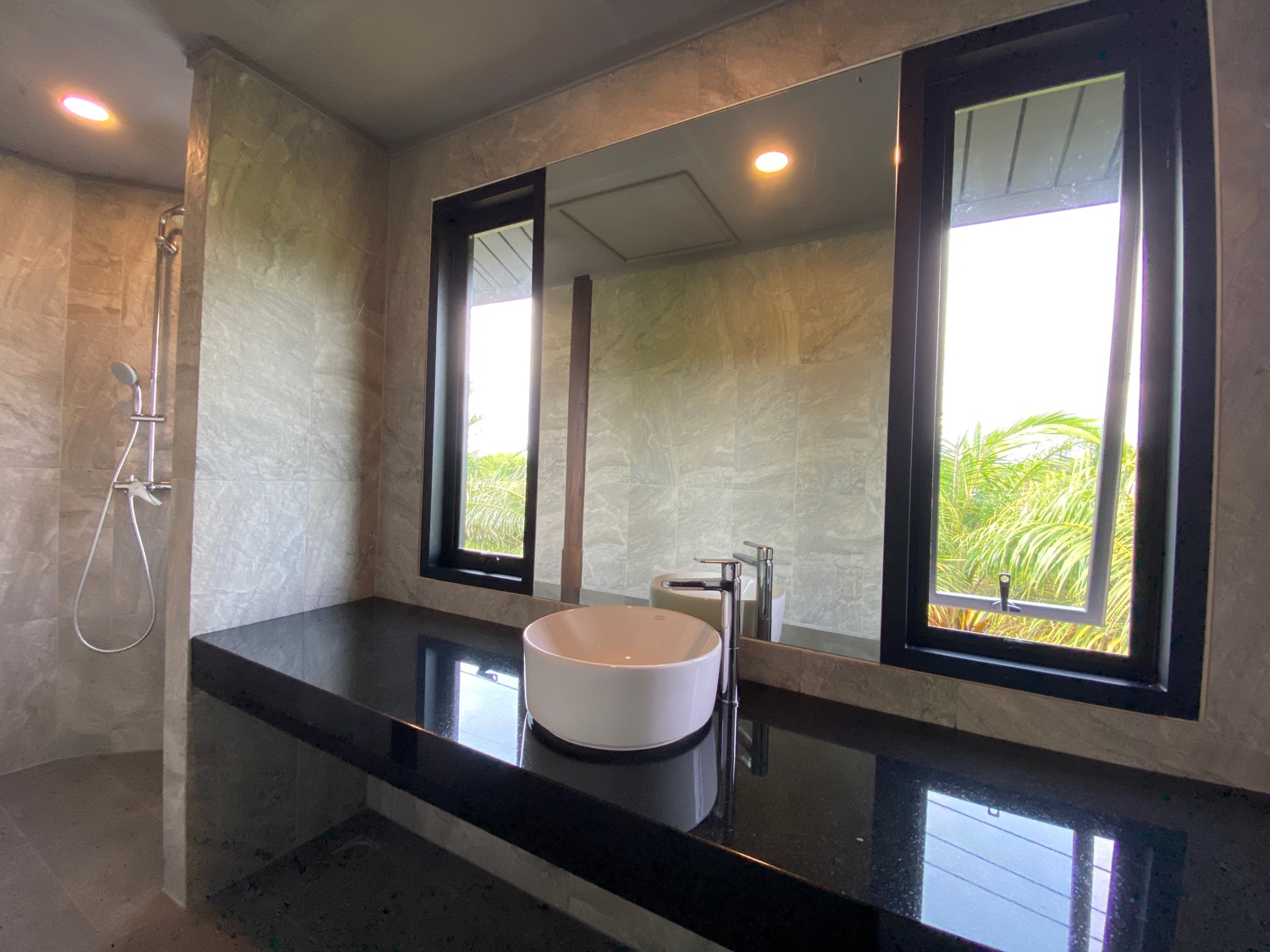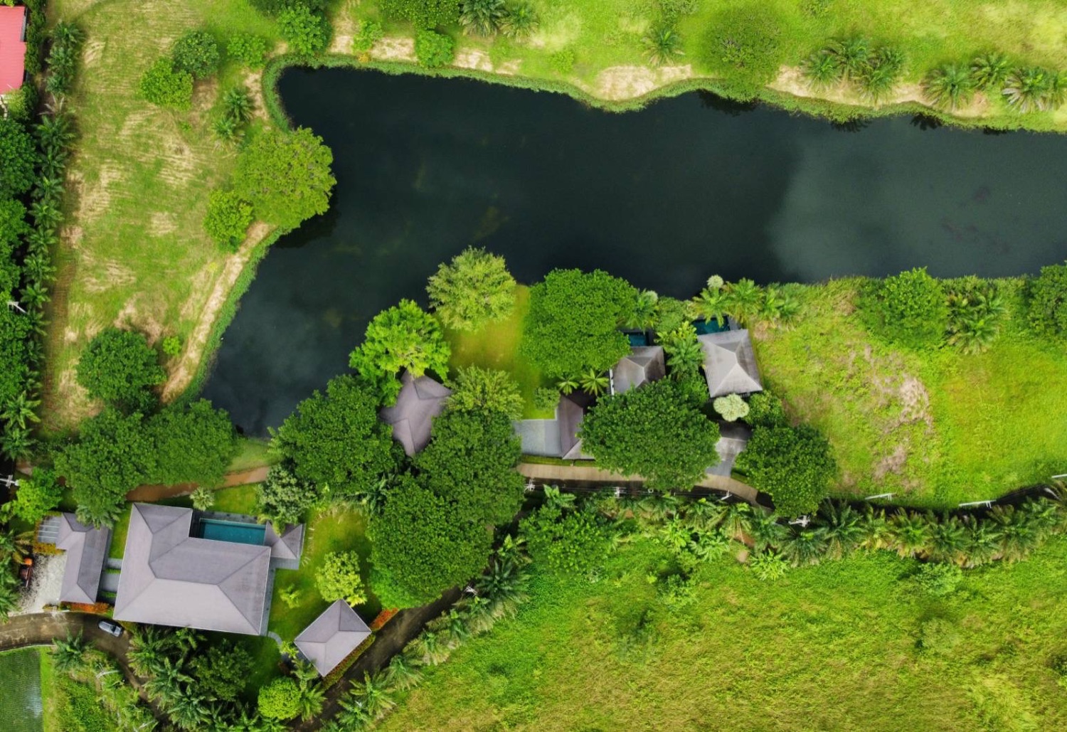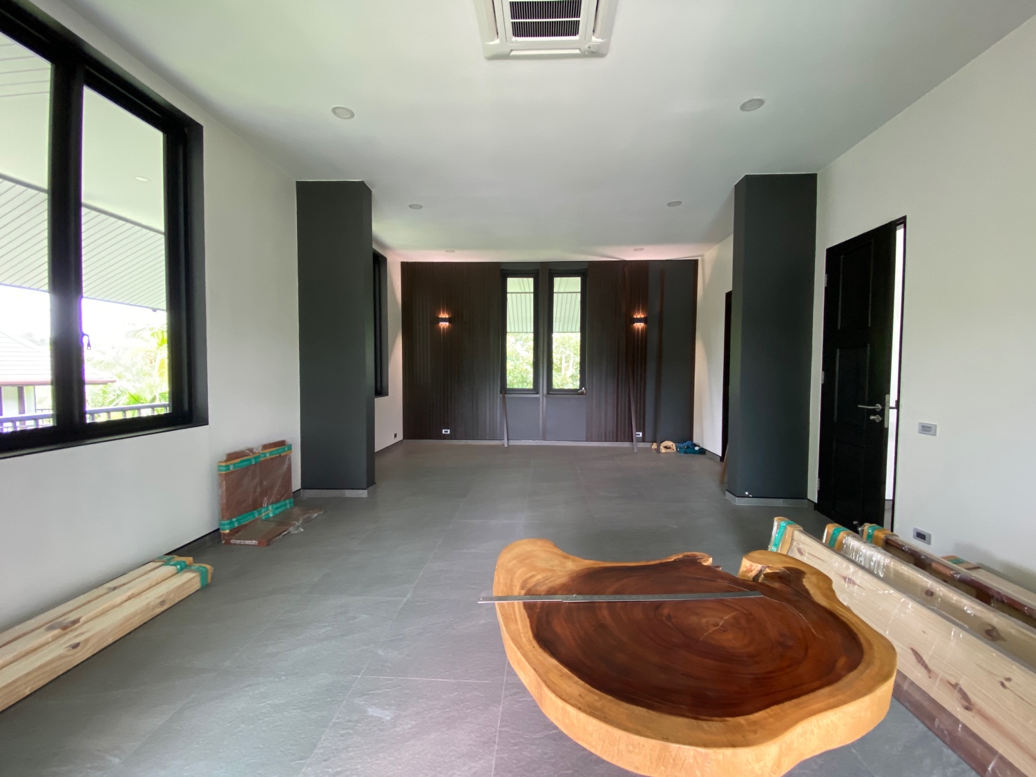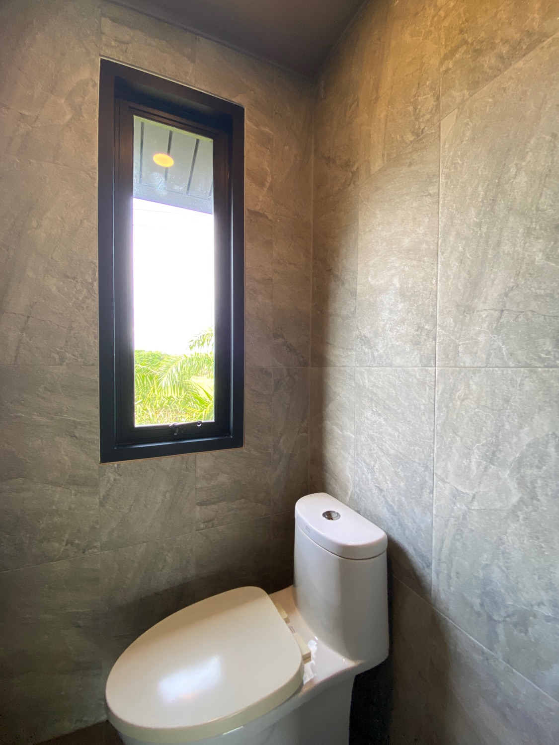 From the entrance, there is a small building containing the carport and maid's quarter. Further on is the main house which is built in modern Colonial style with tall ceilings and wrapped around terraces. On the ground floor, there is an en-suite guest bedroom, a large open-plan living and dining area and a fully fitted Western kitchen with built-in appliances and a large breakfast island. The entire ground floor is enveloping and has access to the pool.