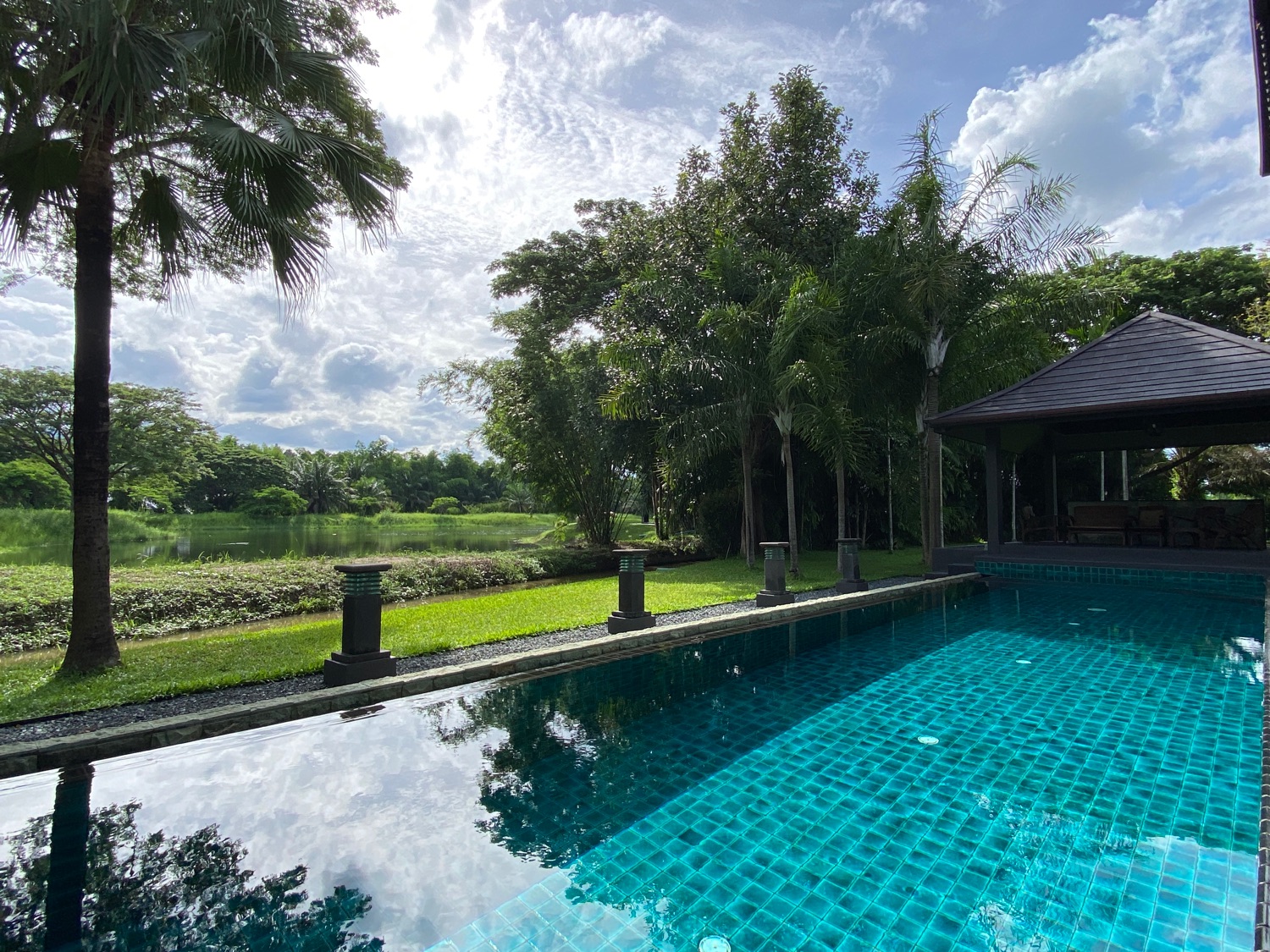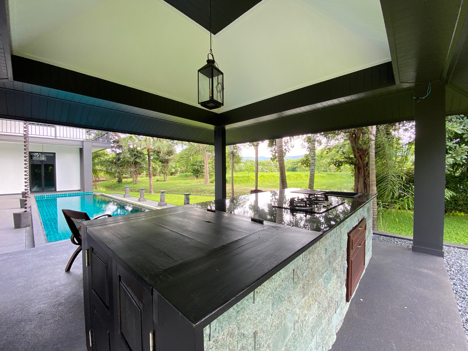 The pool area has a beautiful deck and a gazebo at the end with an installed BBQ and sitting area for entertaining. Behind this is the wooden Lanna-style rice barn which can be used as a sitting area, exercise, meditation etc.