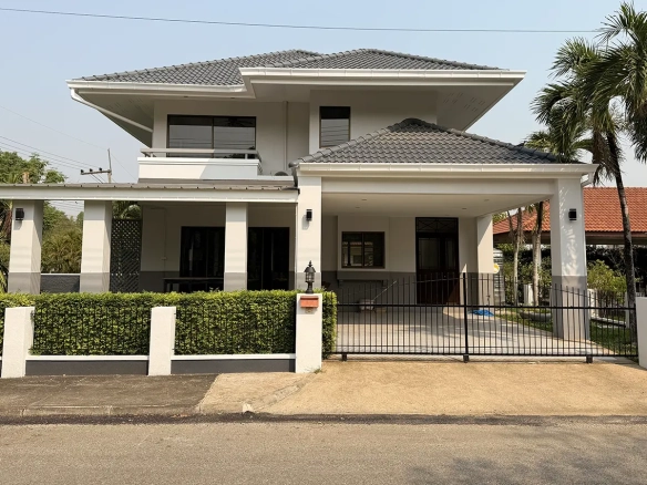 Brand new and beautiful custom built 3 bedroom one storey home on a large plot of land for sale semi furnished in Mae Rim area of Chiang Mai. Occupying just short of one rai of land, the property is less than 10 10-minute drive to Prem Intl School and, a 15-20 minute drive to Mae Rim Plaza, Makro and the upcoming Kad Farang. Hospitals, restaurants and other services are all within easy driving distance. This contemporary English country home welcomes you with a large gate and a cosy gravel driveway. A few steps lead up to the main entrance where to the right is a built-in Western kitchen with a breakfast table, plenty of built-in cupboard spaces and a door access to the side of the house. Further on is the dining area which opens up to the large covered terrace outside for outdoor dining, entertaining or simply enjoying the garden. The sitting area features a working fireplace, a tall alcove ceiling, and a charming brick wall. Large glass windows on all sides provide natural light and good airflow. Lovely tile flooring throughout. There is another cosy sitting area from the dining area, which could be a library or study area. Then there is a guest bathroom and a laundry room with door access to the outside and it comes complete with a sink, a washing machine and a dryer. Two ensuite guest bedrooms, both come with matching beds and wardrobes. The master bedroom is spacious and has a sitting area, an ensuite with a Victorian bathtub, a separate rain shower and wash basins. The house is well-built, magnificently furnished and decorated with attention to detail. The property offers the opportunity to add another house or two and a swimming pool if one is wanted. ** There are 2 title deeds ( 392 sqw + 1 rai 59 sqw), approximately 2 rai 51 sqw. ** Sell with options: only a house with the land size of 392 sqw or the whole 2 plots. ** Or only one plot of land, size of 1 rai 59 sqw will be 2.7 M THB A must see definitely! Please do let us know and we can arrange a viewing for you.