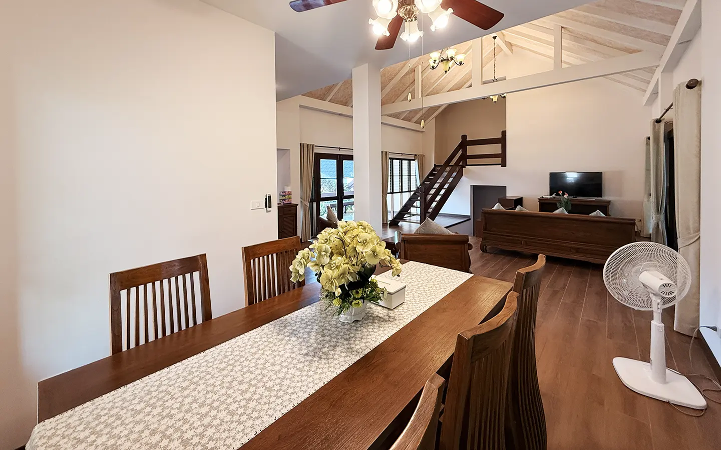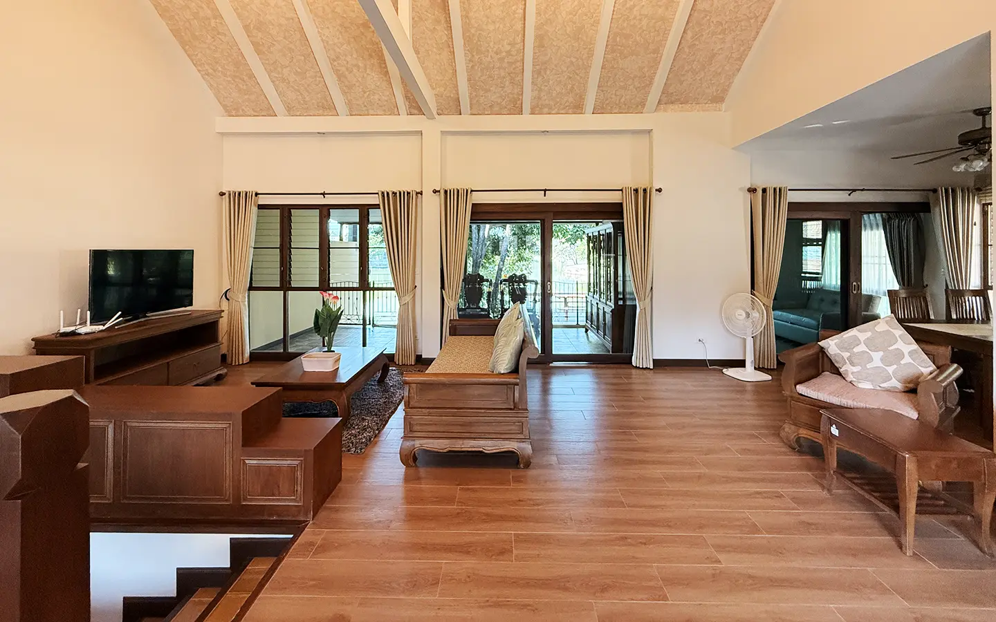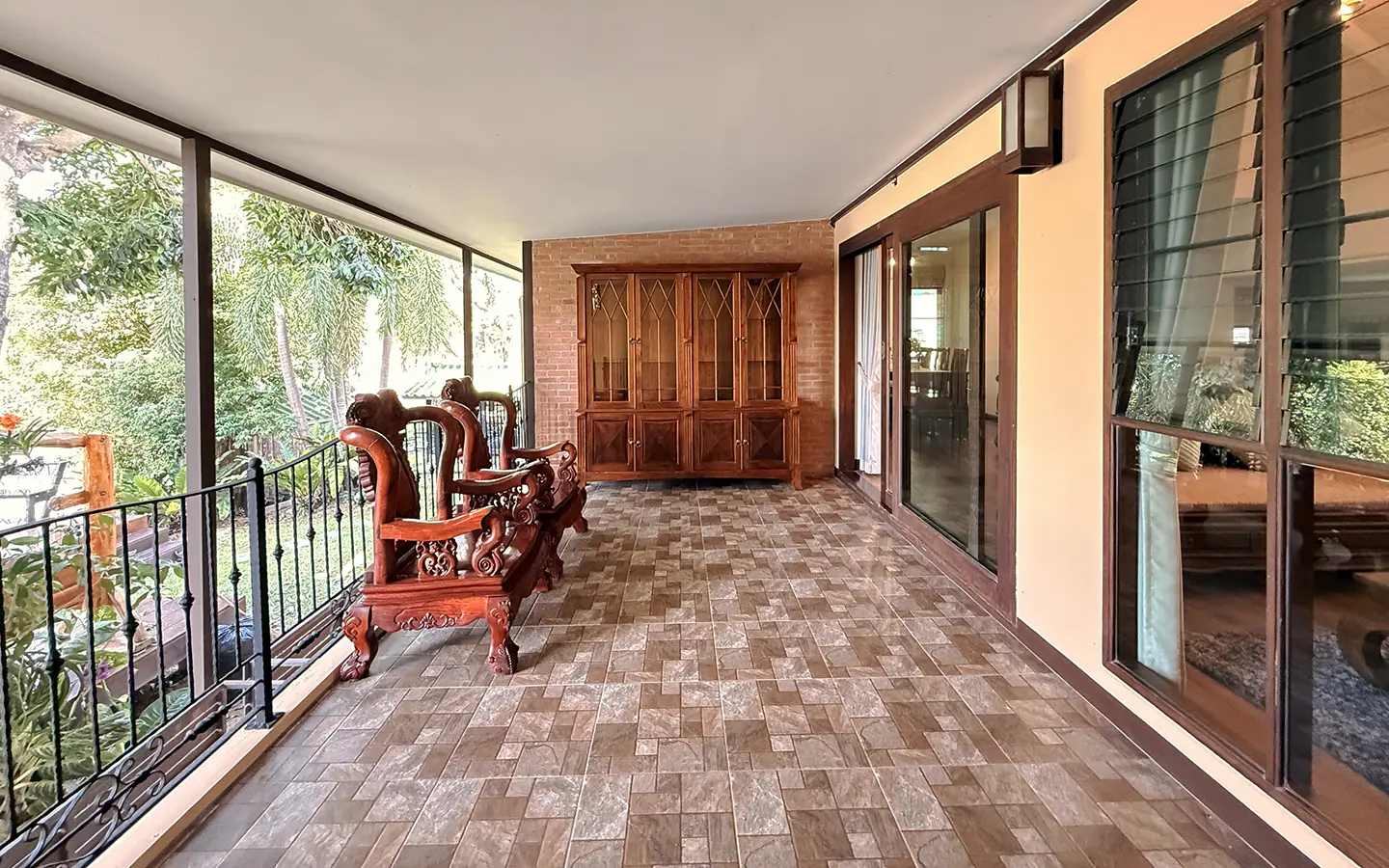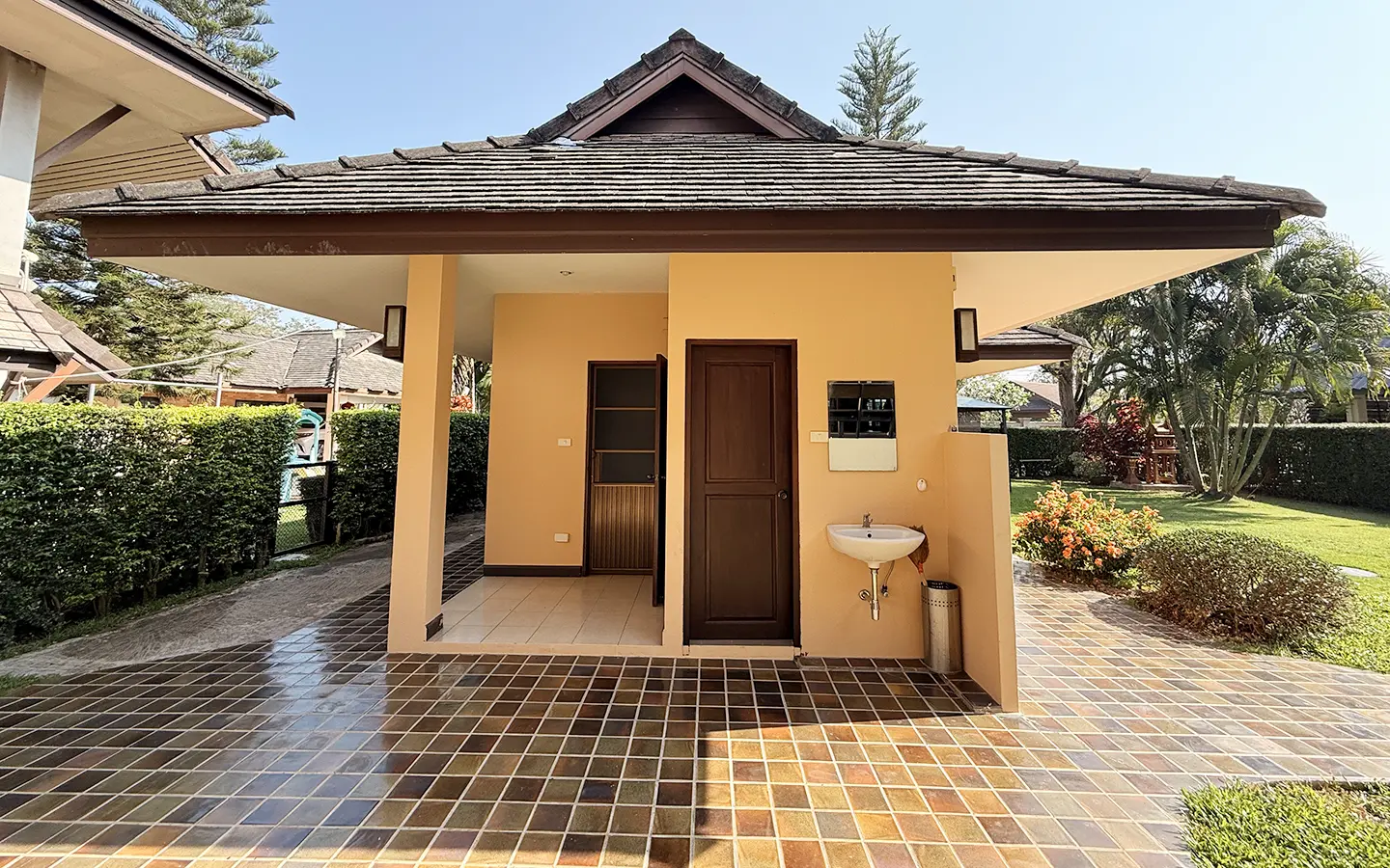 The house is in a charming chalet/Lanna style on a good size plot of land with big lawn and back onto the lake. From the carport, a few steps up is the veranda to sit and enjoy the garden. Inside the open living/dining room is airy with tall ceiling, terracotta flooring and teakwood furniture. Down a few steps are 2 guest bedrooms, both ensuite and fully furnished with teakwood beds and closet. One of the bedrooms has a terrace overlooking the lake.