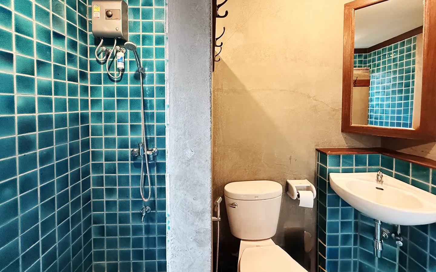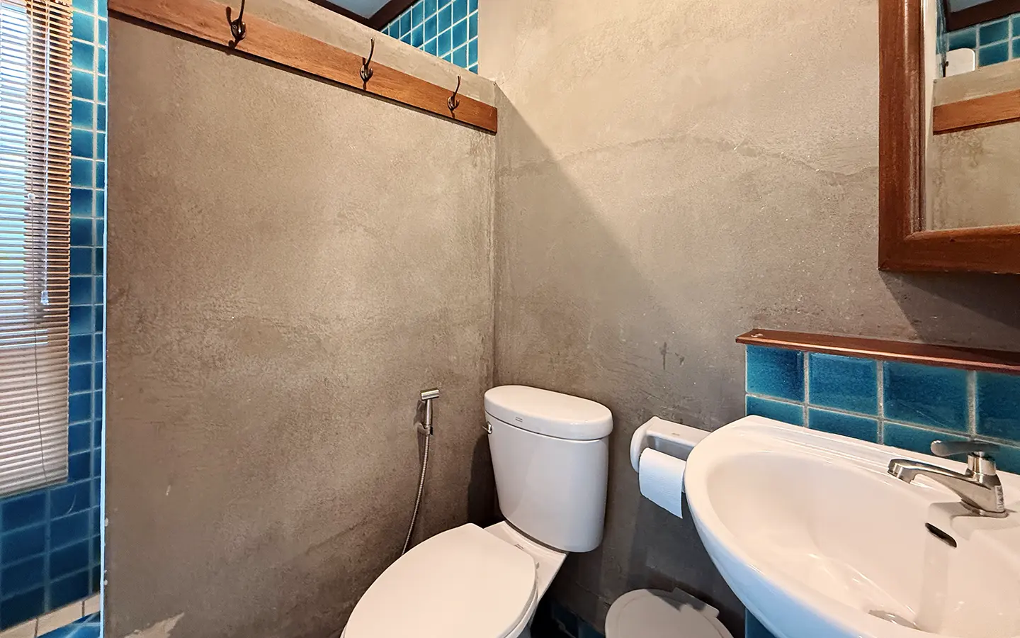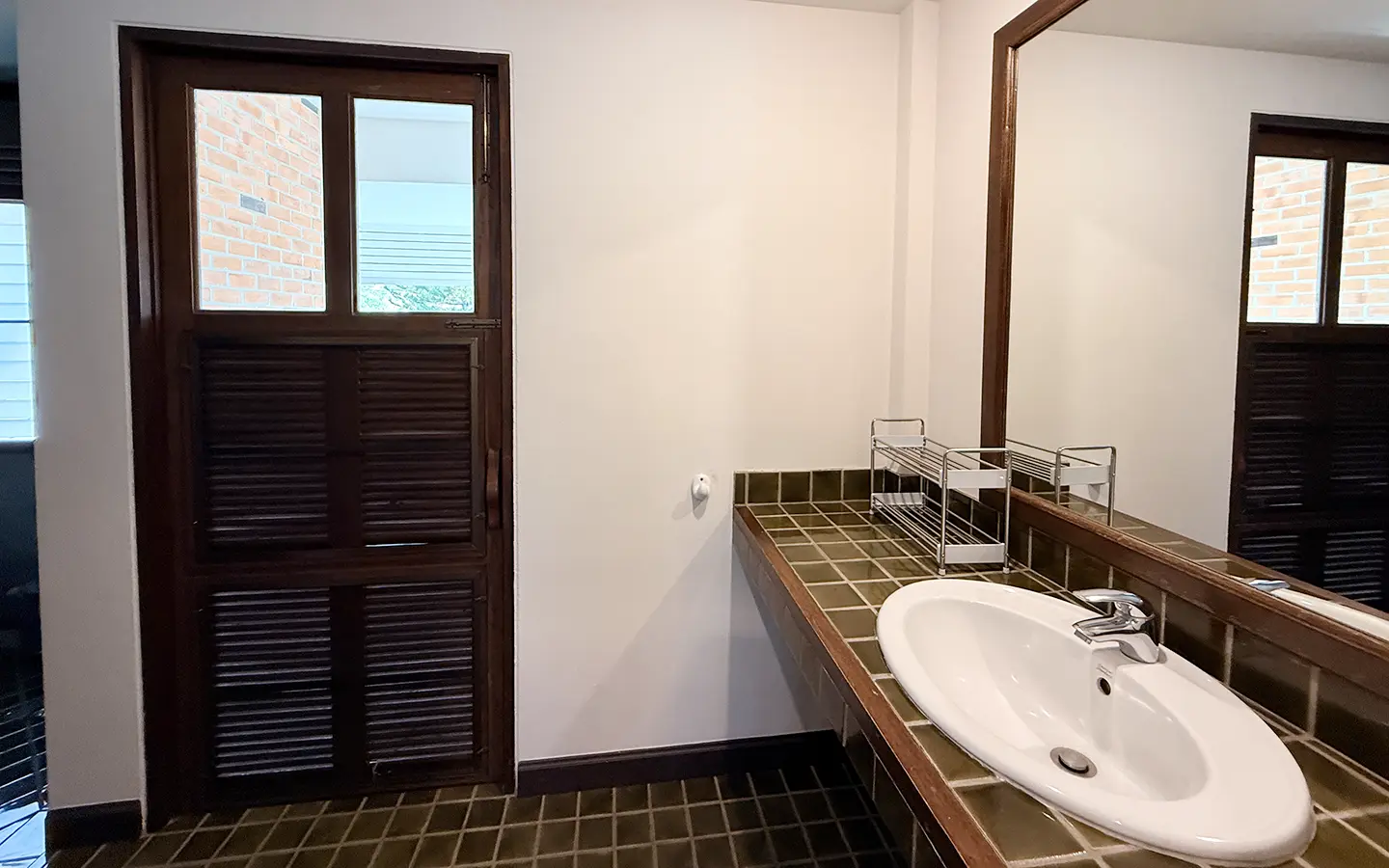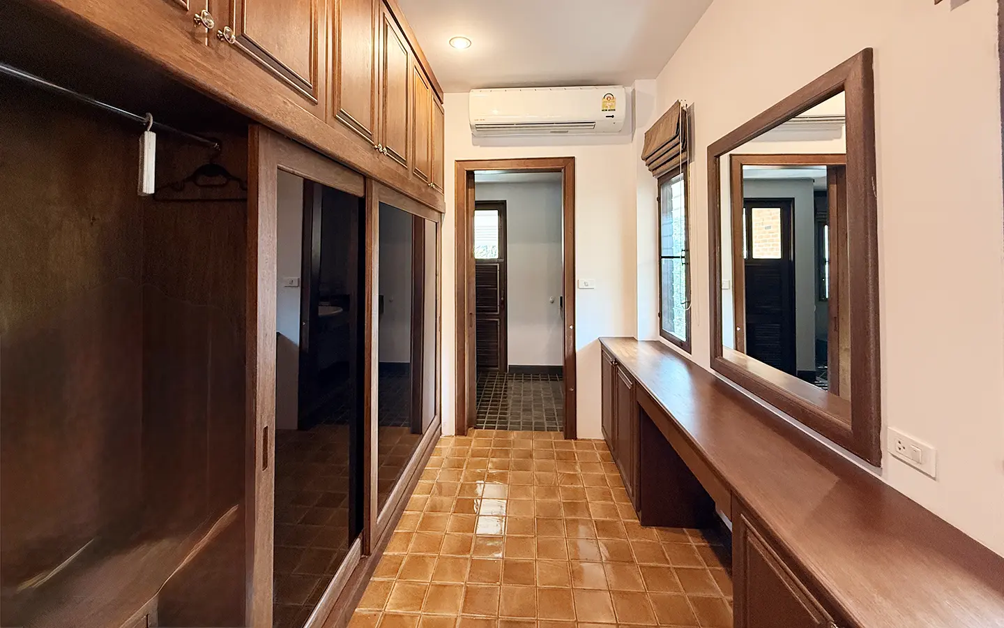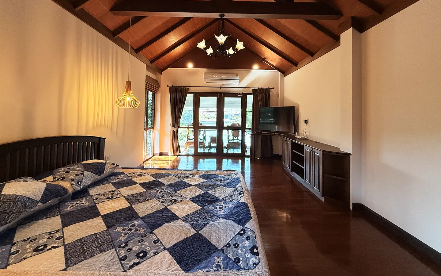 The house is in a charming chalet/Lanna style on a good size plot of land with big lawn and back onto the lake. From the carport, a few steps up is the veranda to sit and enjoy the garden. Inside the open living/dining room is airy with tall ceiling, terracotta flooring and teakwood furniture. Down a few steps are 2 guest bedrooms, both ensuite and fully furnished with teakwood beds and closet. One of the bedrooms has a terrace overlooking the lake.
