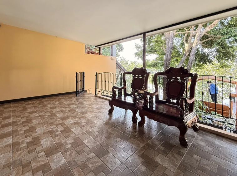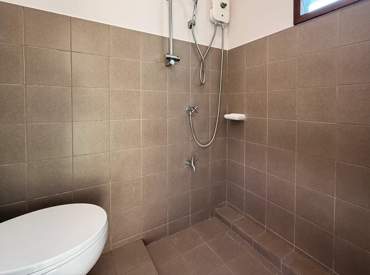 From the living room, there is an office, a few steps down is the fully fitted Western kitchen with built in oven and door access to washing area outside. Another staircase from the living room leads to the second floor where the spacious master bedroom is. It has beautiful loft style wood panel ceiling, walk-in closet, ensuite and a terrace overlooking the lake.