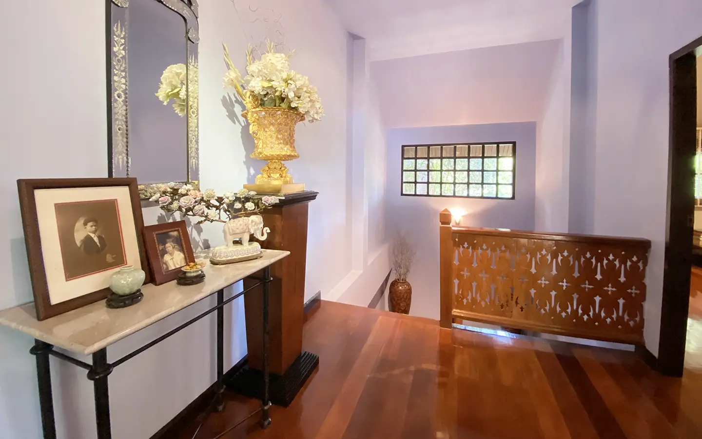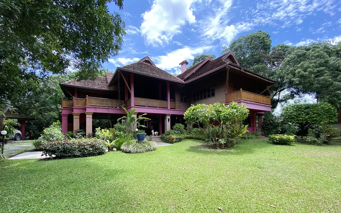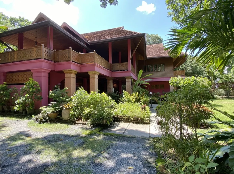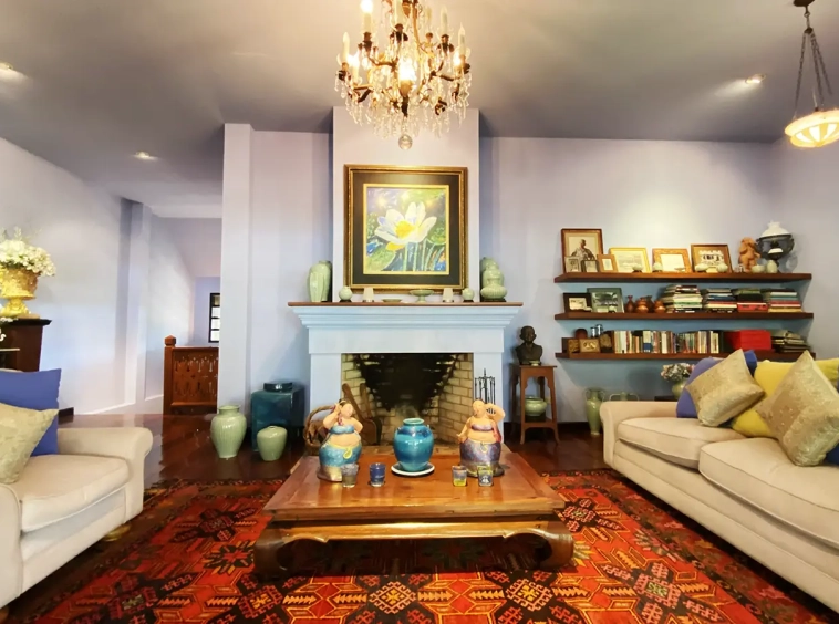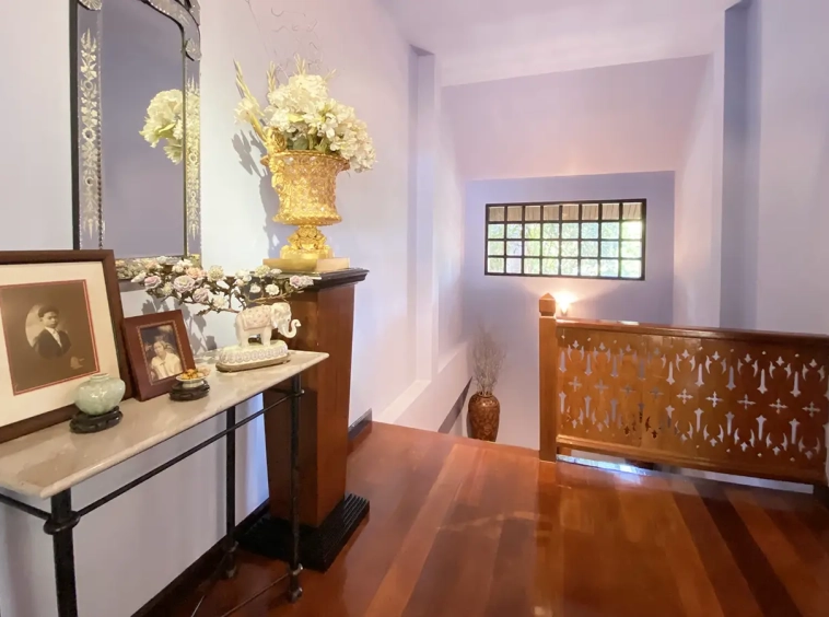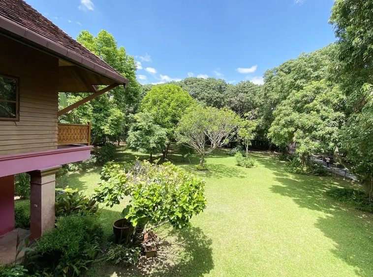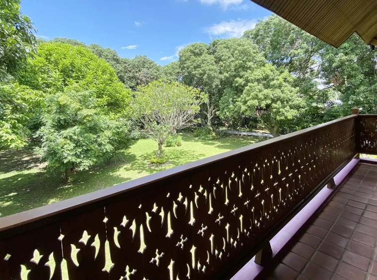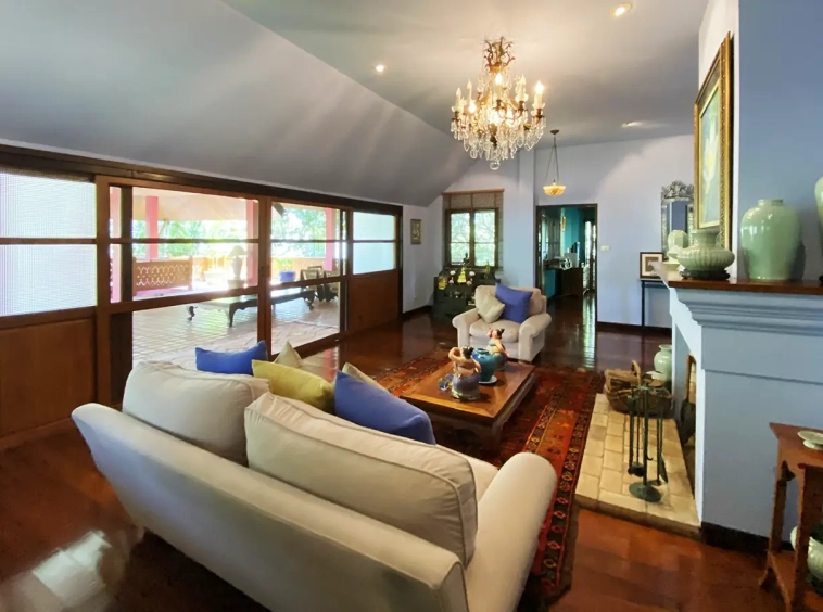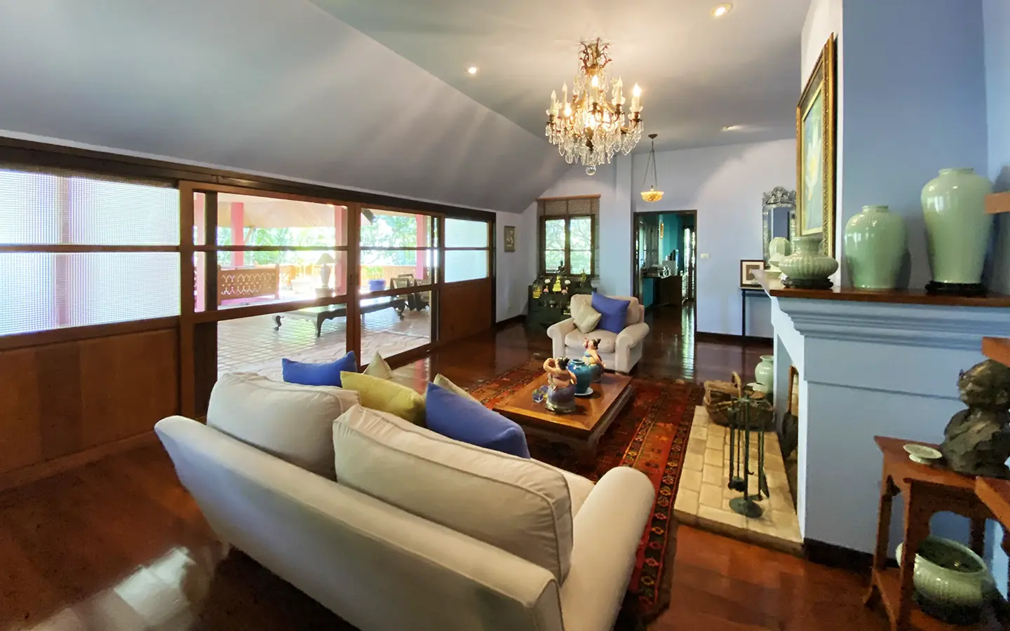 Upstairs there is a large terrace featuring an all teakwood ceiling and terracotta flooring. This area is for entertaining, dining or relaxing. A sliding door leads to the formal sitting room with a working fireplace. There is an ensuite guest bedroom which has access to a terrace. The master bedroom is also ensuite and comes with a dressing room and access to its spacious terrace. All the floor inside is of teakwood. The interior gives out a classic Colonial vibe and still has the charm of Lanna feel to it. Everything is well looked after and is in tip-top shape. On the ground is also the worker's quarter containing 2 bedrooms and 2 bathrooms as well as a covered car park with spaces for 2 cars.