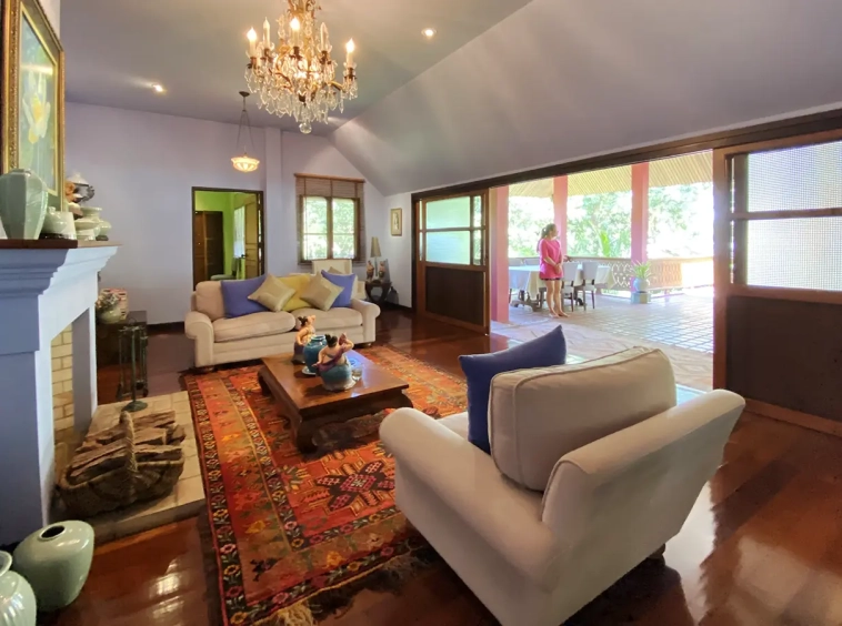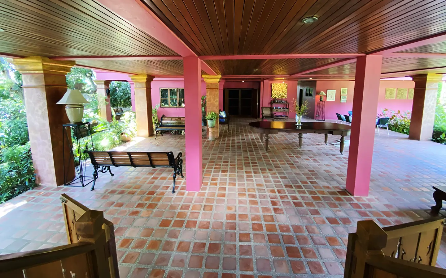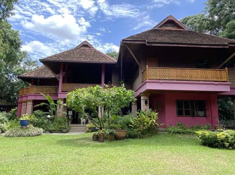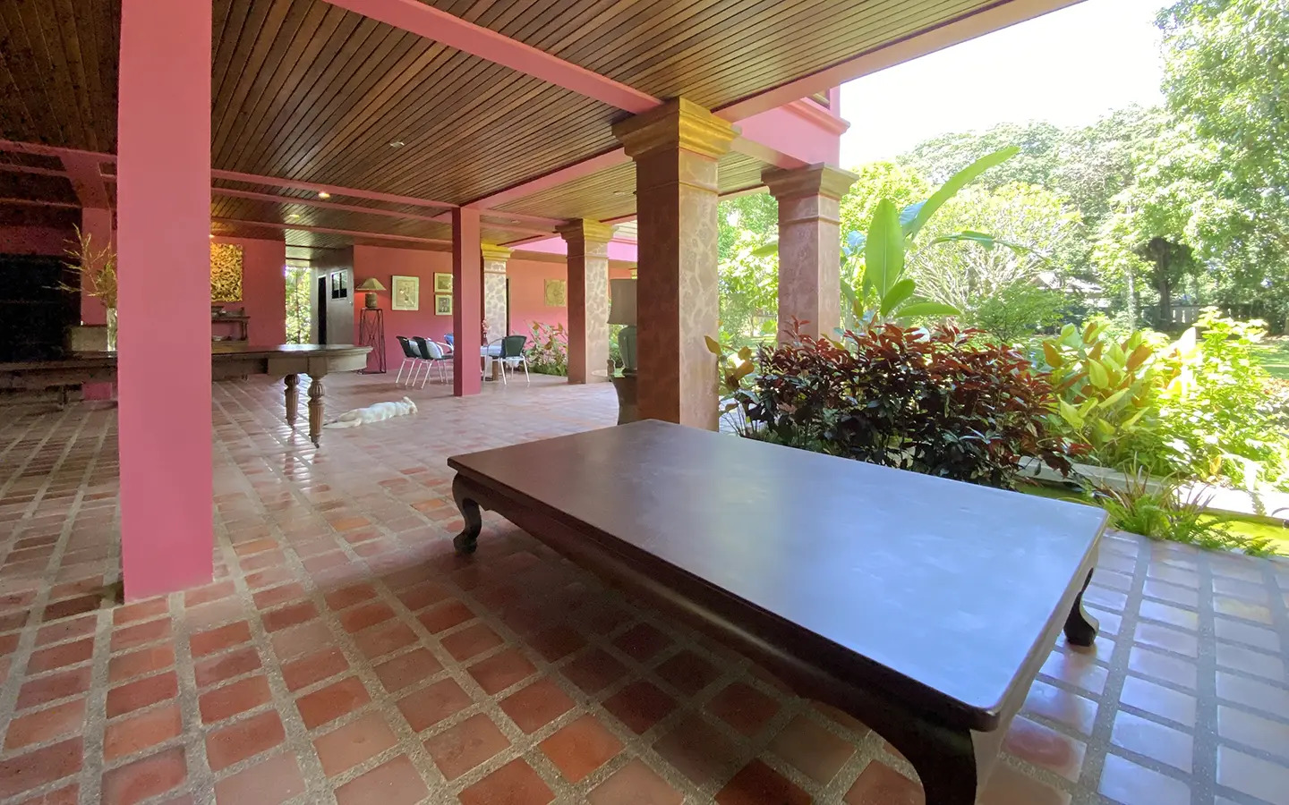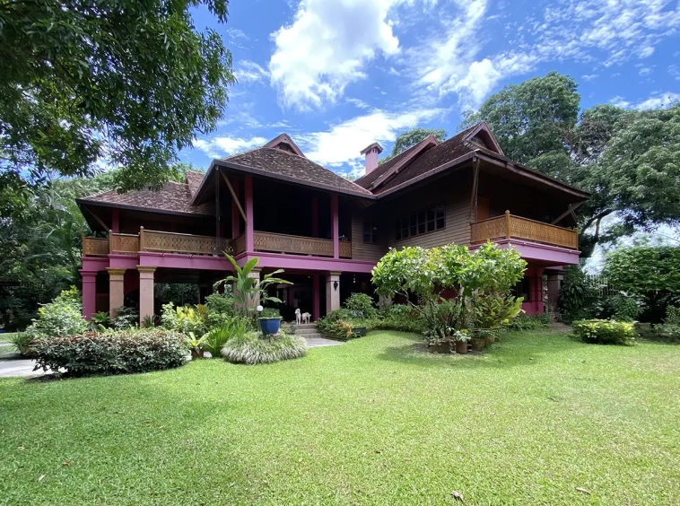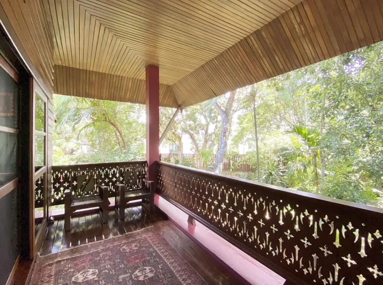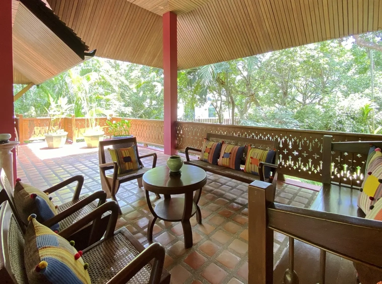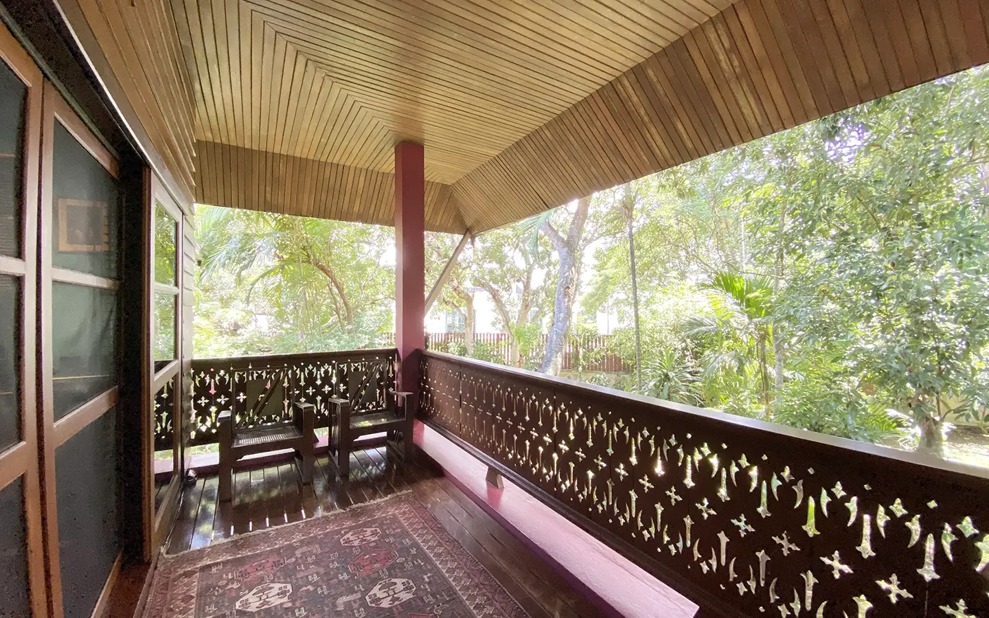 Upstairs there is a large terrace featuring an all teakwood ceiling and terracotta flooring. This area is for entertaining, dining or relaxing. A sliding door leads to the formal sitting room with a working fireplace. There is an ensuite guest bedroom which has access to a terrace. The master bedroom is also ensuite and comes with a dressing room and access to its spacious terrace. All the floor inside is of teakwood. The interior gives out a classic Colonial vibe and still has the charm of Lanna feel to it. Everything is well looked after and is in tip-top shape. On the ground is also the worker's quarter containing 2 bedrooms and 2 bathrooms as well as a covered car park with spaces for 2 cars.