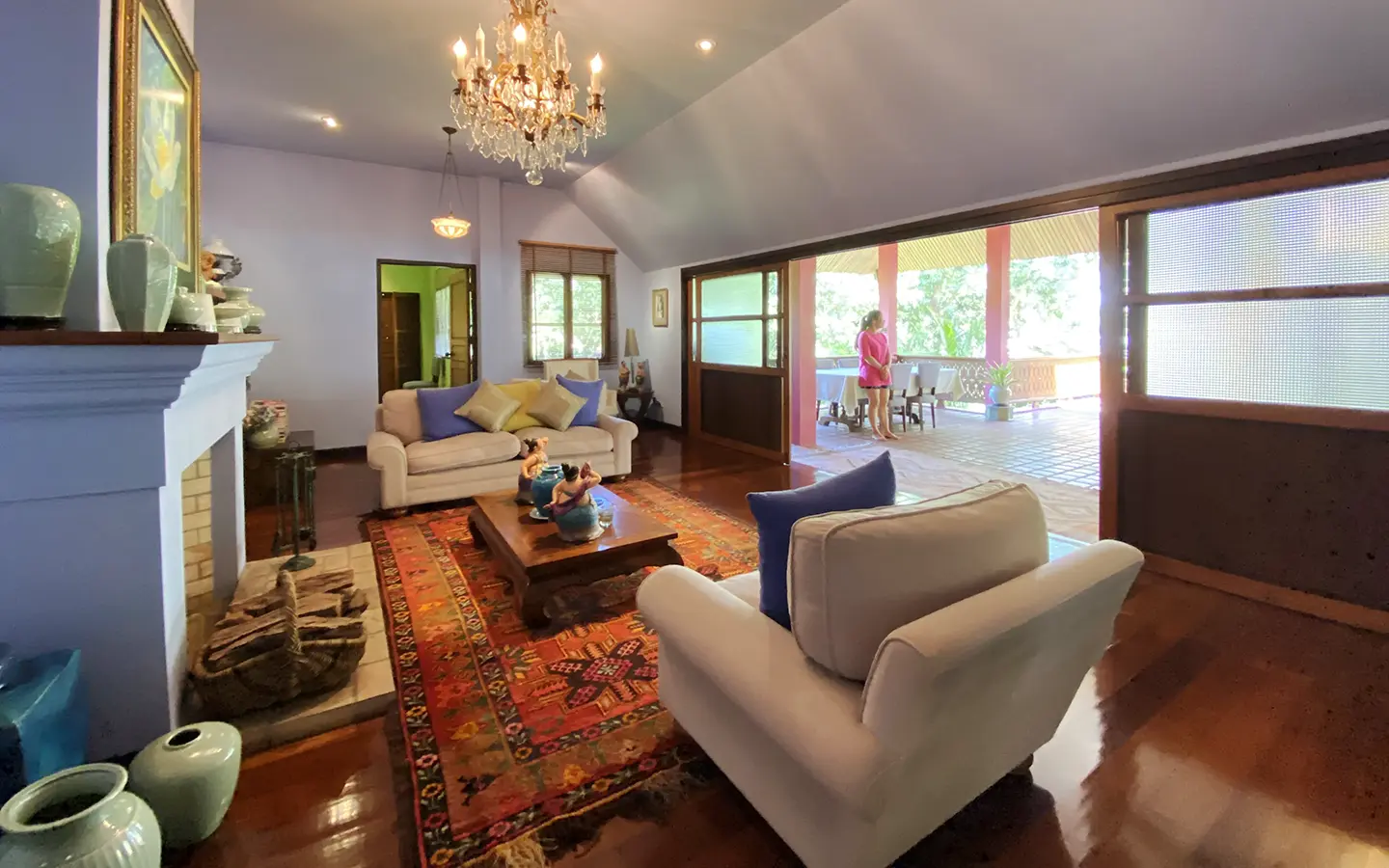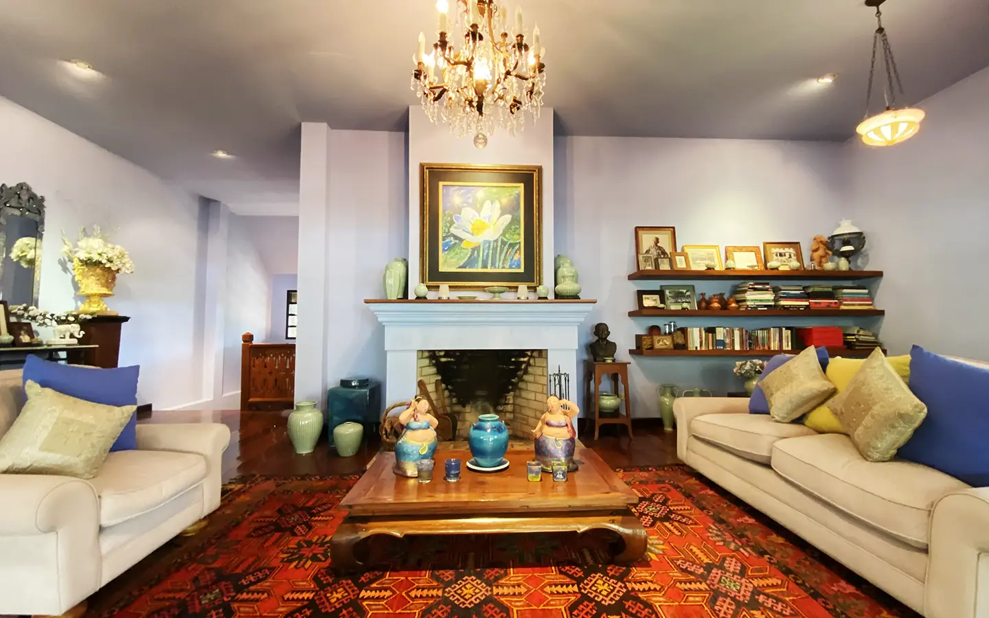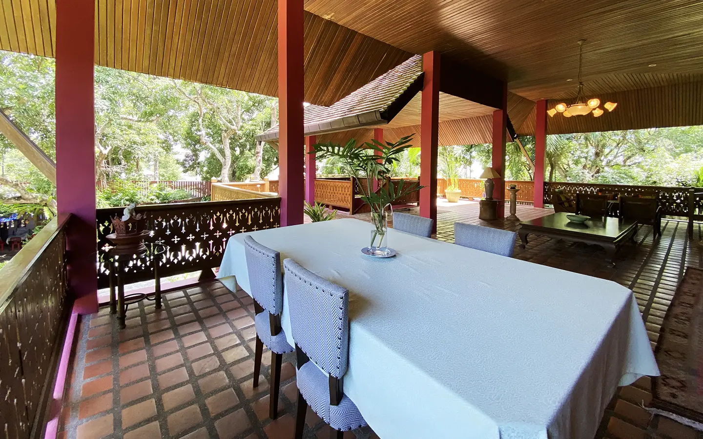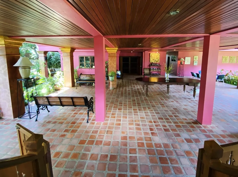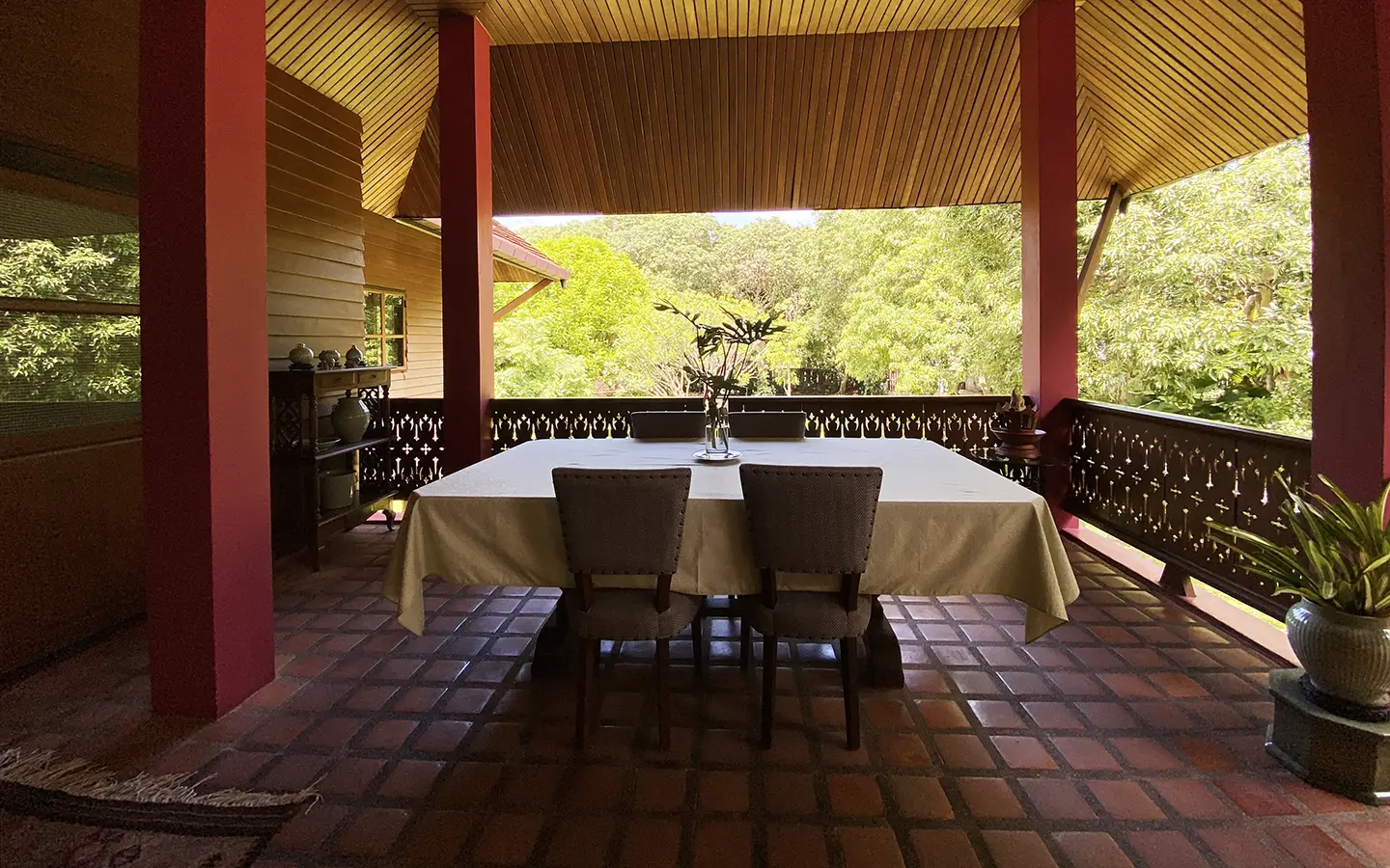 Upstairs there is a large terrace featuring an all teakwood ceiling and terracotta flooring. This area is for entertaining, dining or relaxing. A sliding door leads to the formal sitting room with a working fireplace. There is an ensuite guest bedroom which has access to a terrace. The master bedroom is also ensuite and comes with a dressing room and access to its spacious terrace. All the floor inside is of teakwood. The interior gives out a classic Colonial vibe and still has the charm of Lanna feel to it. Everything is well looked after and is in tip-top shape. On the ground is also the worker's quarter containing 2 bedrooms and 2 bathrooms as well as a covered car park with spaces for 2 cars.