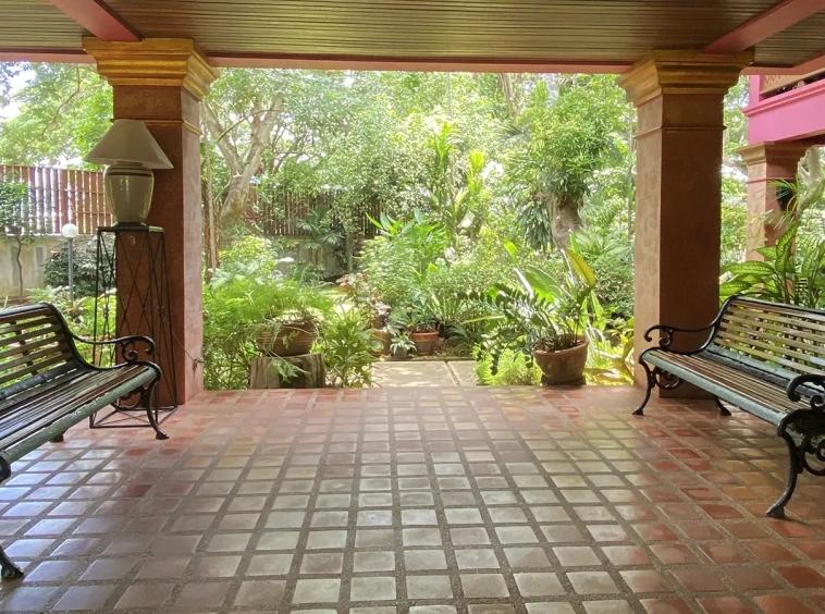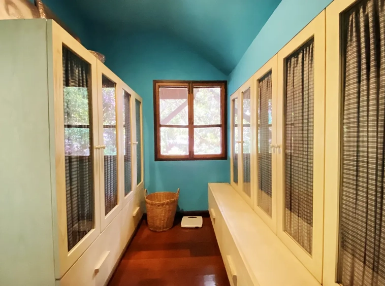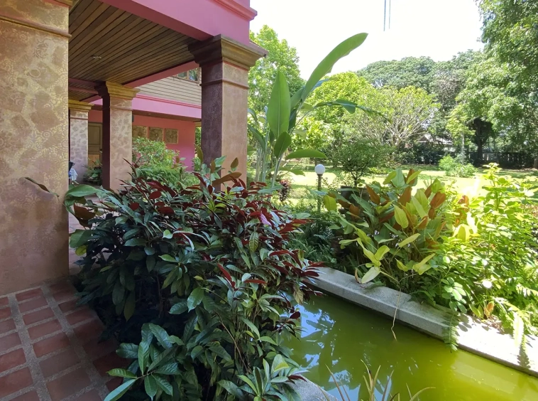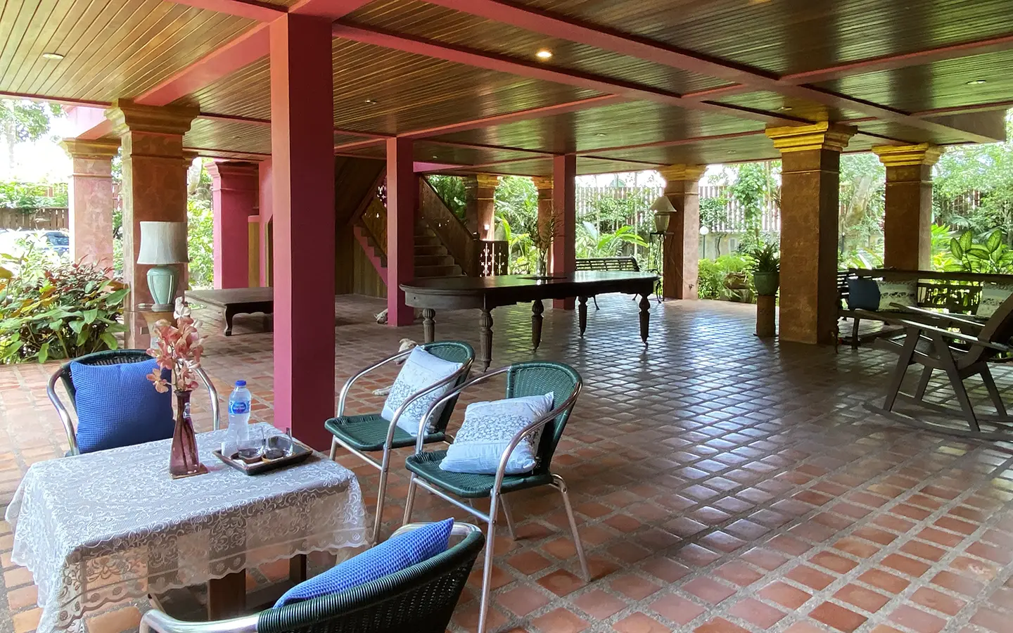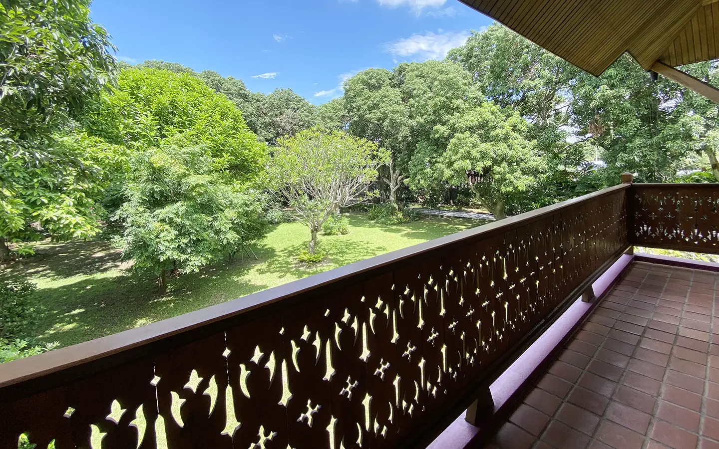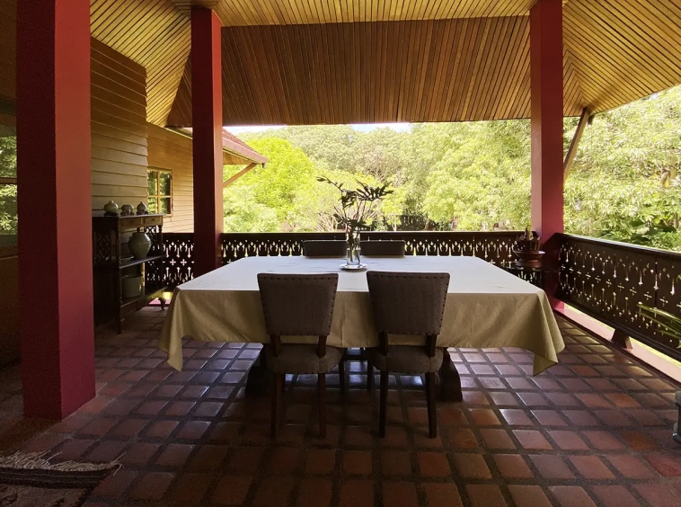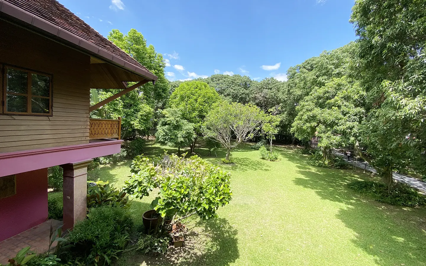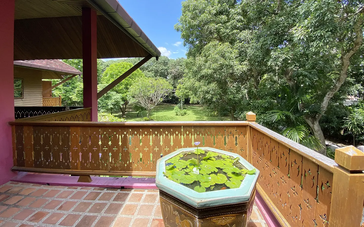 Upstairs there is a large terrace featuring an all teakwood ceiling and terracotta flooring. This area is for entertaining, dining or relaxing. A sliding door leads to the formal sitting room with a working fireplace. There is an ensuite guest bedroom which has access to a terrace. The master bedroom is also ensuite and comes with a dressing room and access to its spacious terrace. All the floor inside is of teakwood. The interior gives out a classic Colonial vibe and still has the charm of Lanna feel to it. Everything is well looked after and is in tip-top shape. On the ground is also the worker's quarter containing 2 bedrooms and 2 bathrooms as well as a covered car park with spaces for 2 cars.