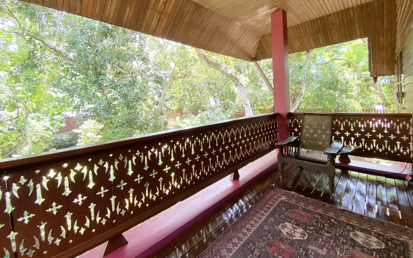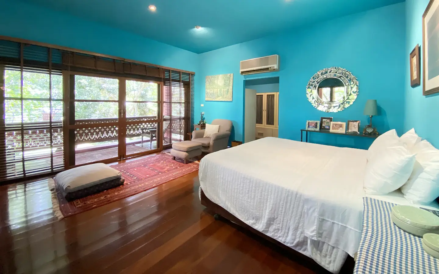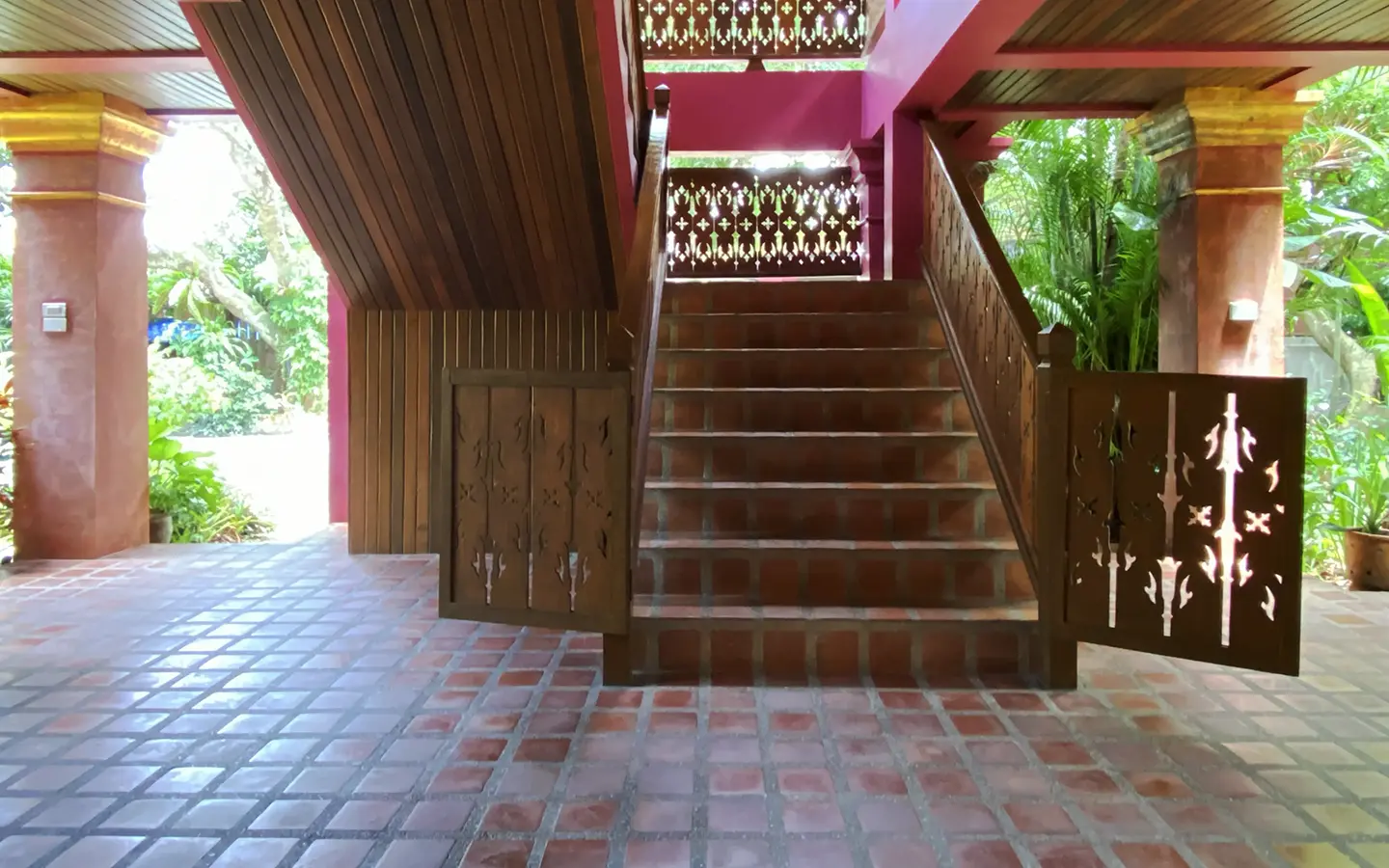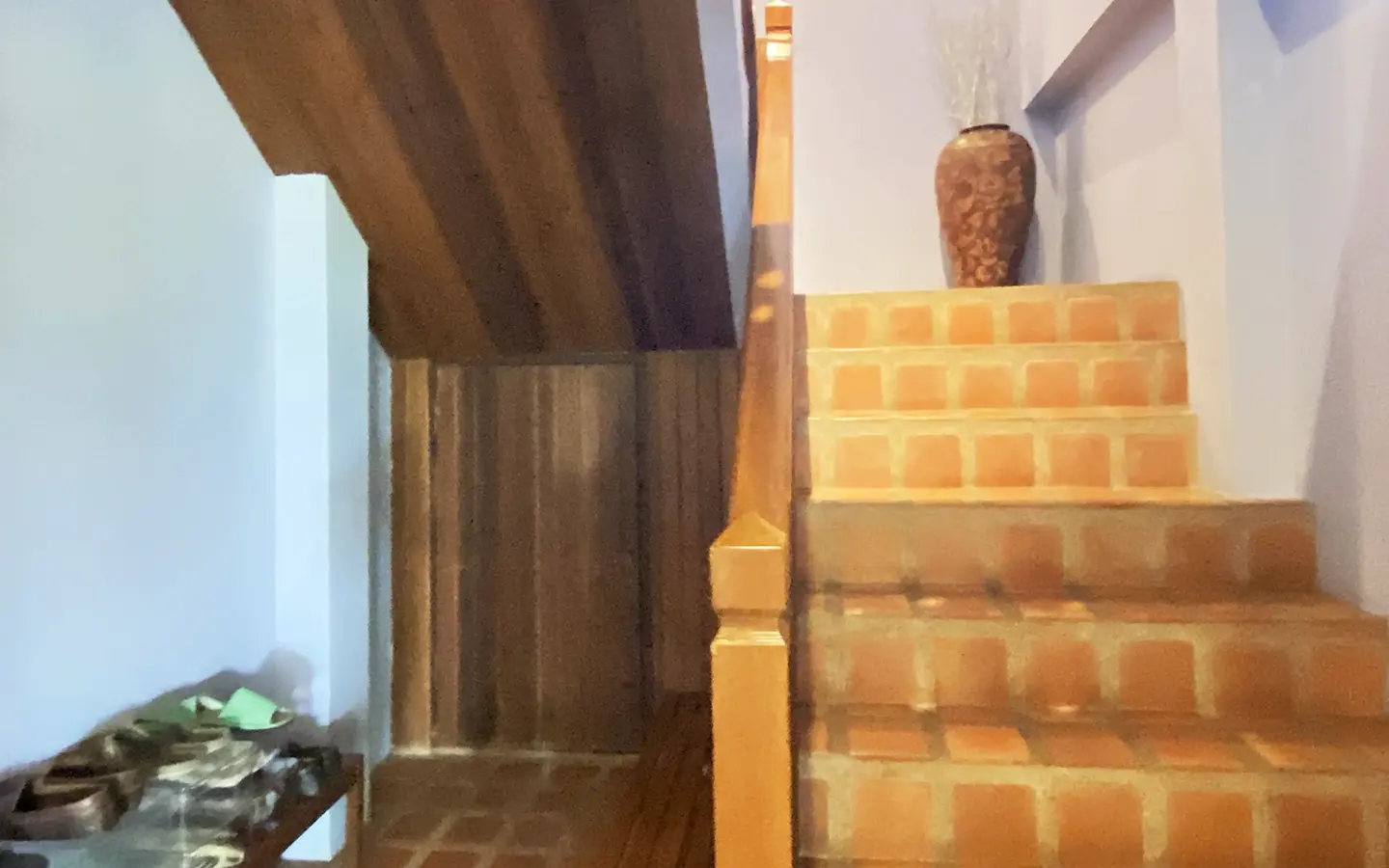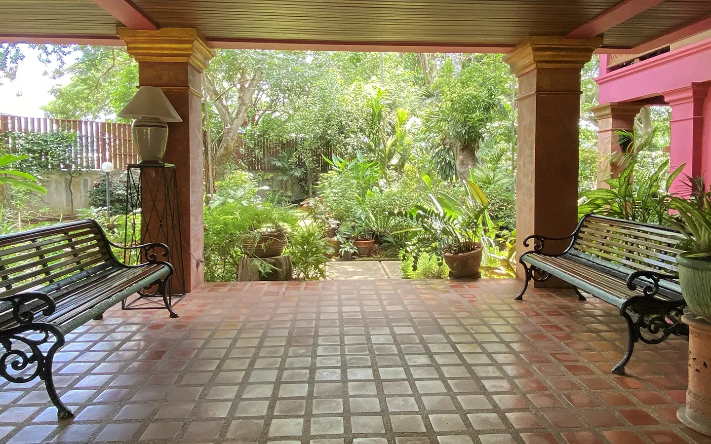 Upstairs there is a large terrace featuring an all teakwood ceiling and terracotta flooring. This area is for entertaining, dining or relaxing. A sliding door leads to the formal sitting room with a working fireplace. There is an ensuite guest bedroom which has access to a terrace. The master bedroom is also ensuite and comes with a dressing room and access to its spacious terrace. All the floor inside is of teakwood. The interior gives out a classic Colonial vibe and still has the charm of Lanna feel to it. Everything is well looked after and is in tip-top shape. On the ground is also the worker's quarter containing 2 bedrooms and 2 bathrooms as well as a covered car park with spaces for 2 cars.