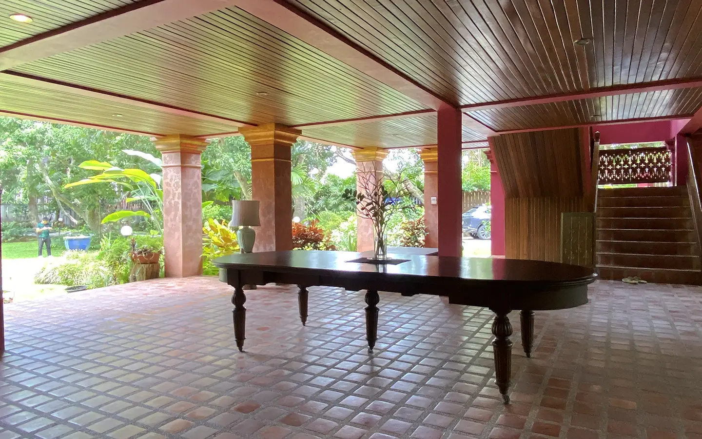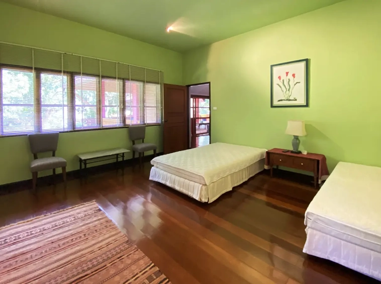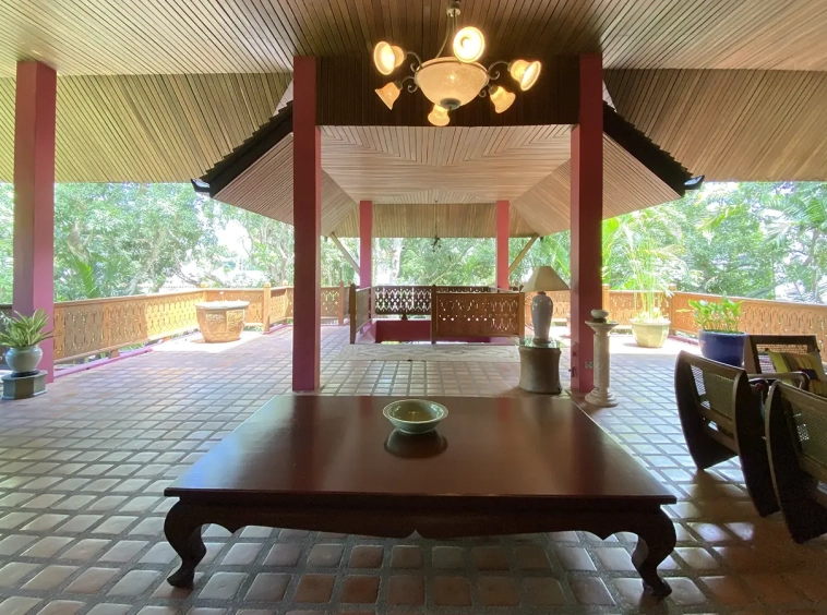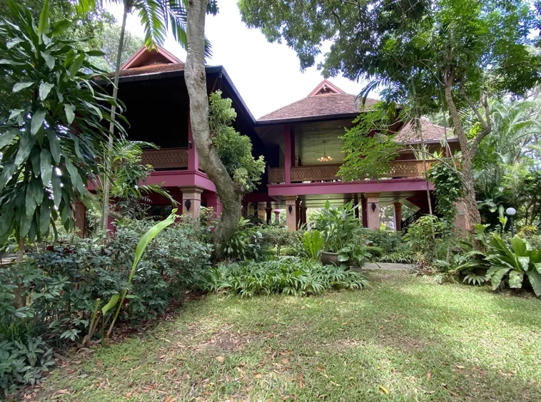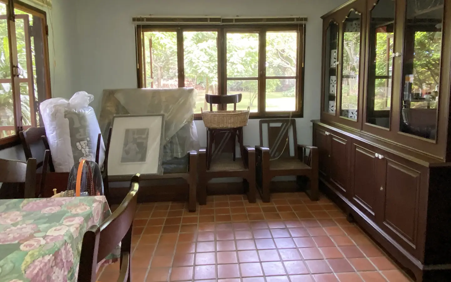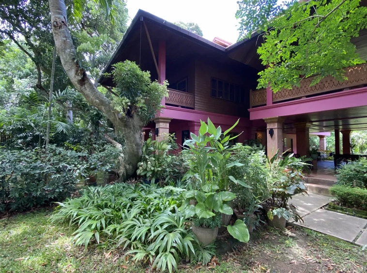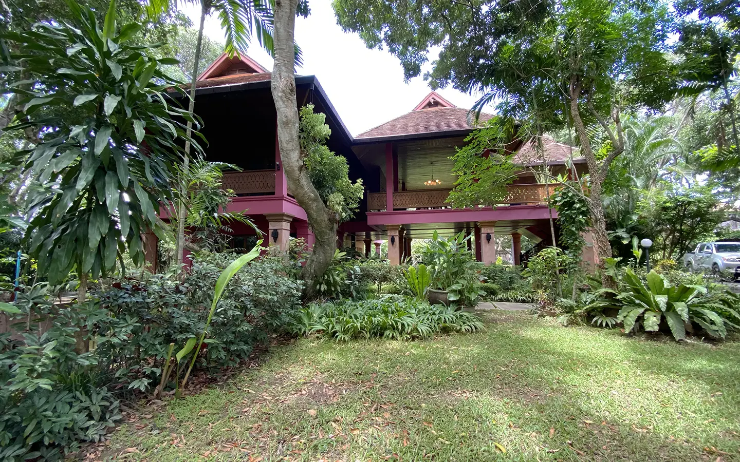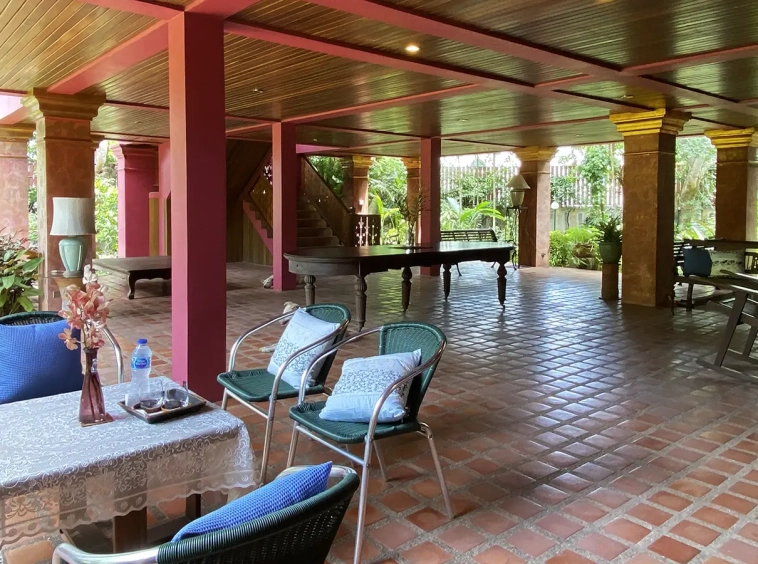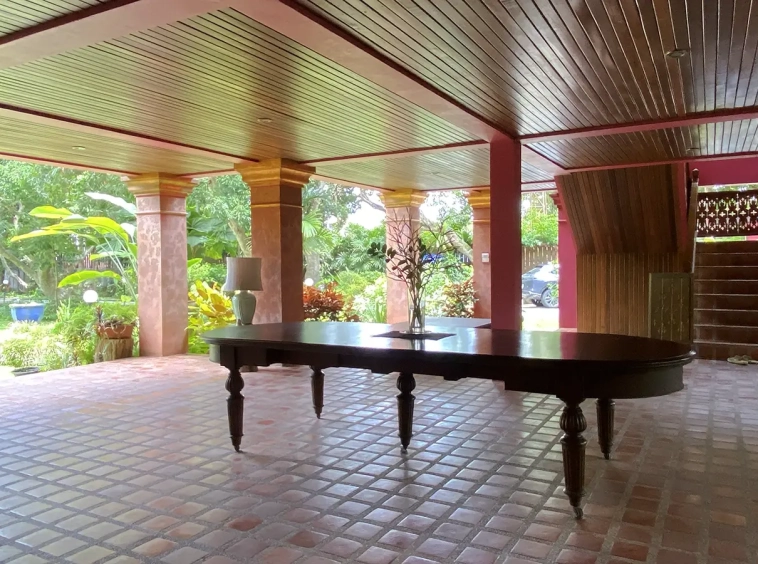 The property sits on a large 2 and a half rais of beautifully kept land. Lovely driveway from the gate to the all-teakwood house which is about 30 years old but is well maintained and in good condition. On the ground floor, it is all open plan in a contemporary Thai style with beams, wood ceilings and terracotta flooring. This is an area to informally receive guests, entertain or simply relax. There is a study room which can be turned into a third bedroom, a guest bathroom and a fully fitted Western kitchen with a built-in oven and a dining table.