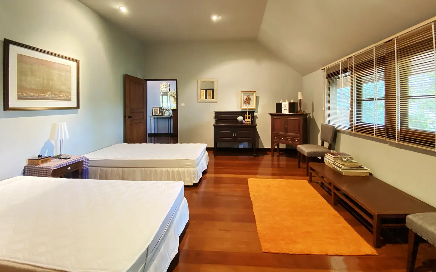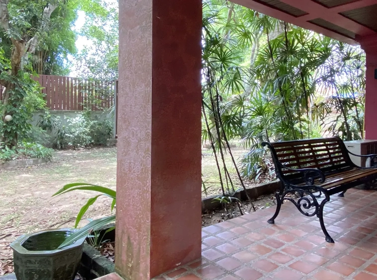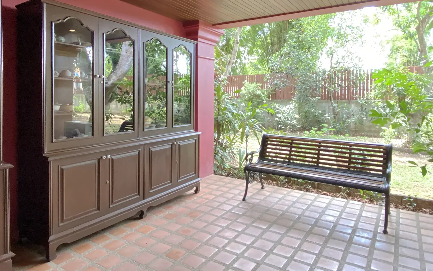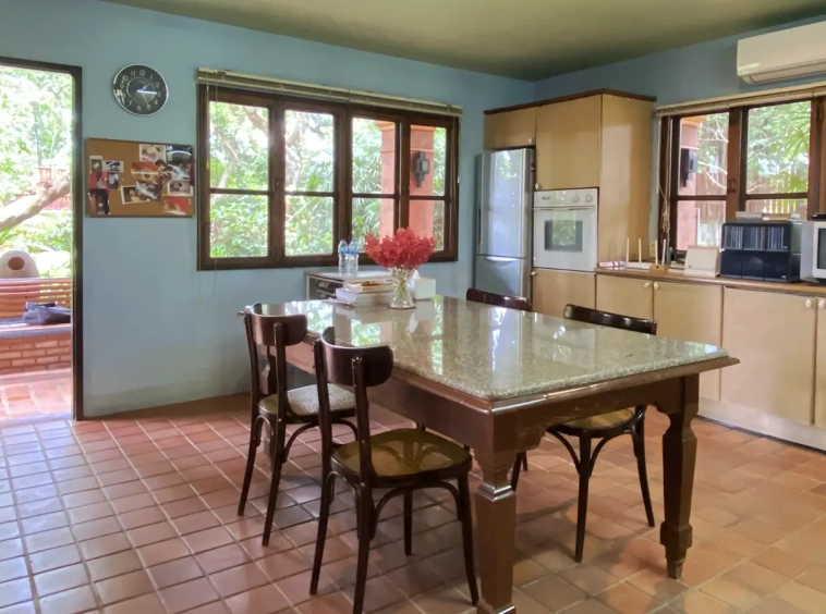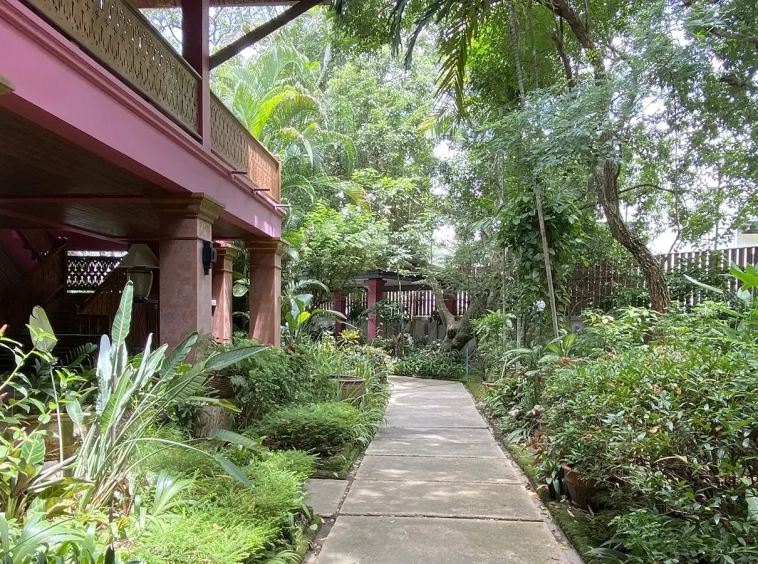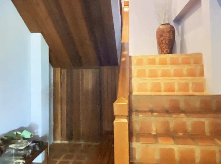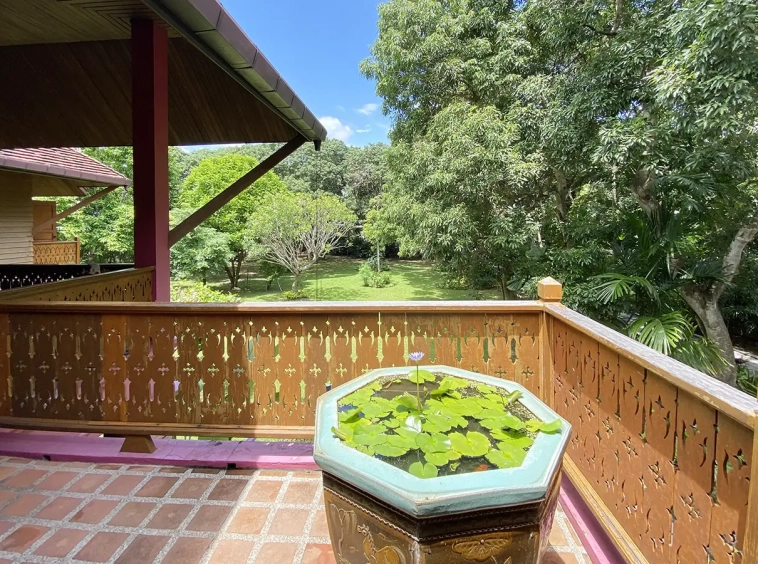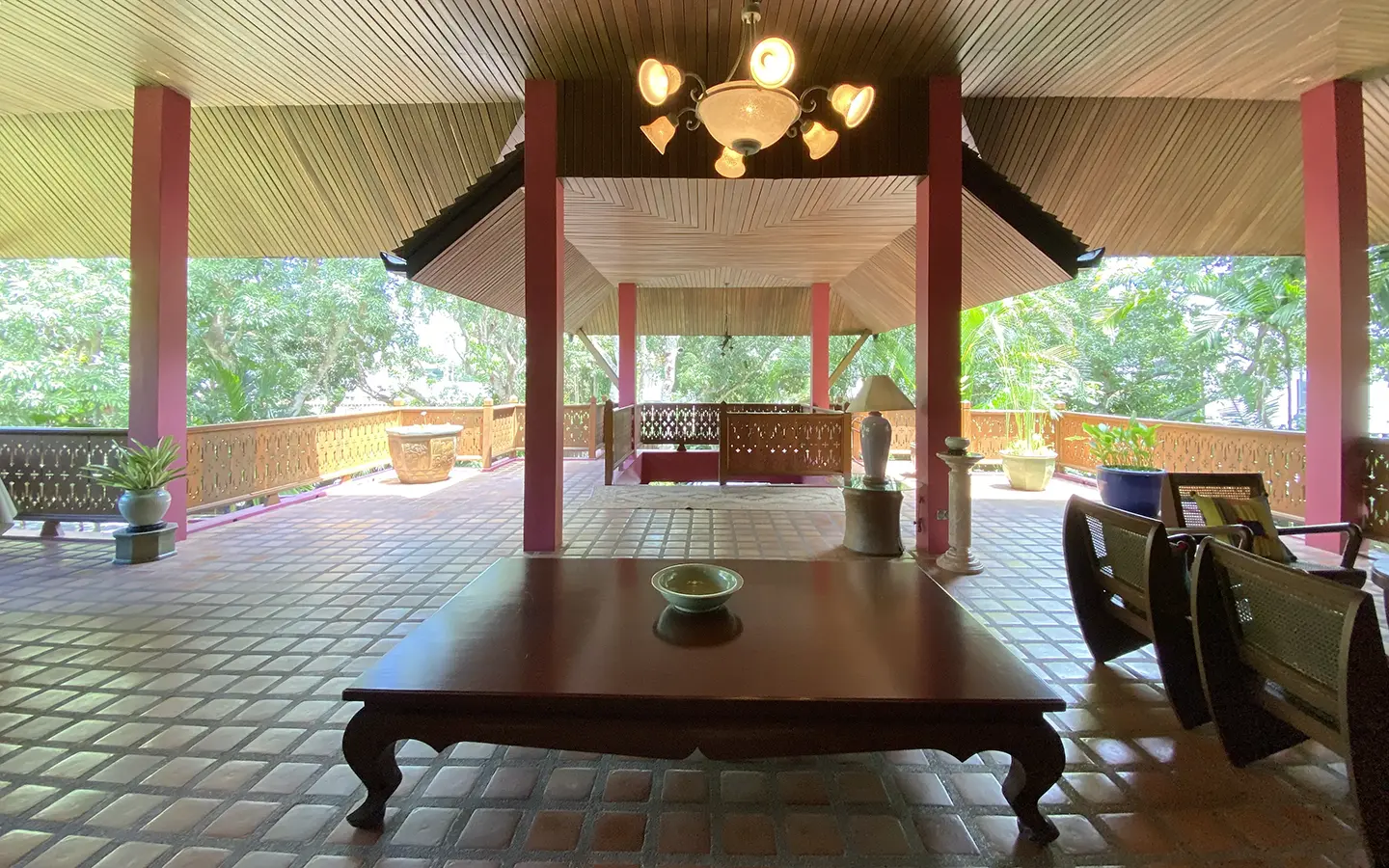 The property sits on a large 2 and a half rais of beautifully kept land. Lovely driveway from the gate to the all-teakwood house which is about 30 years old but is well maintained and in good condition. On the ground floor, it is all open plan in a contemporary Thai style with beams, wood ceilings and terracotta flooring. This is an area to informally receive guests, entertain or simply relax. There is a study room which can be turned into a third bedroom, a guest bathroom and a fully fitted Western kitchen with a built-in oven and a dining table.