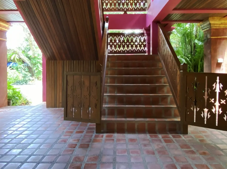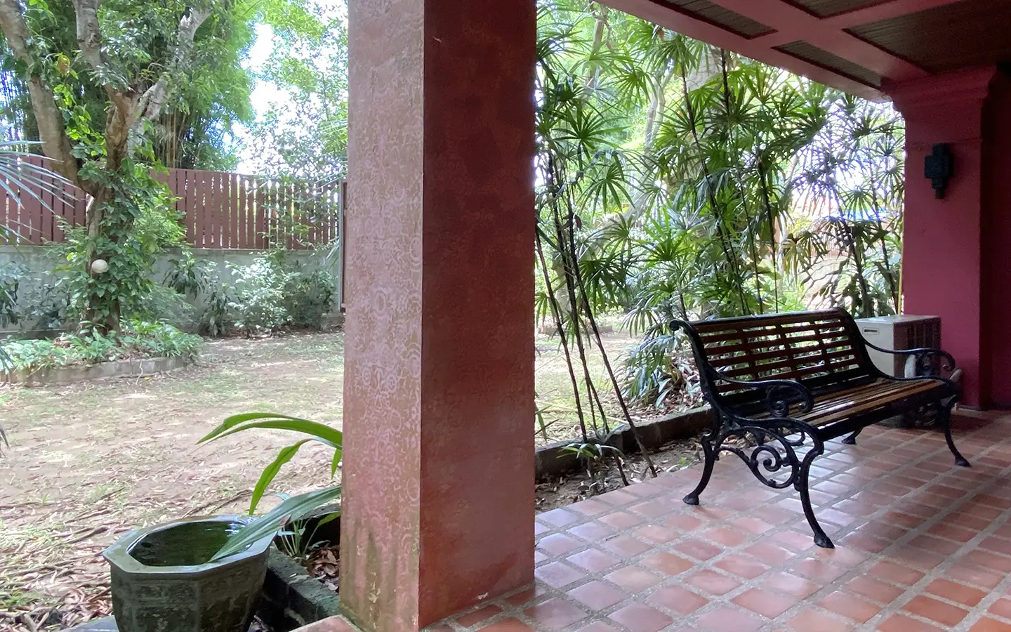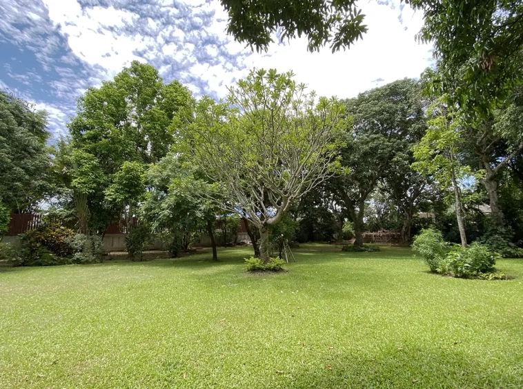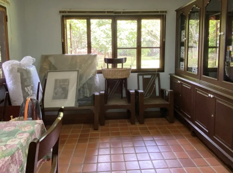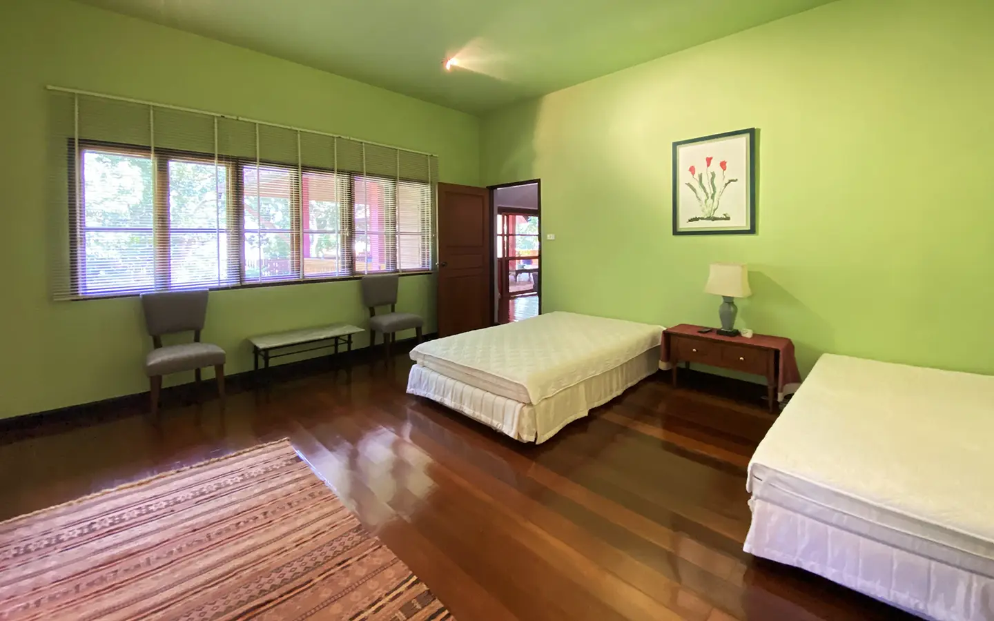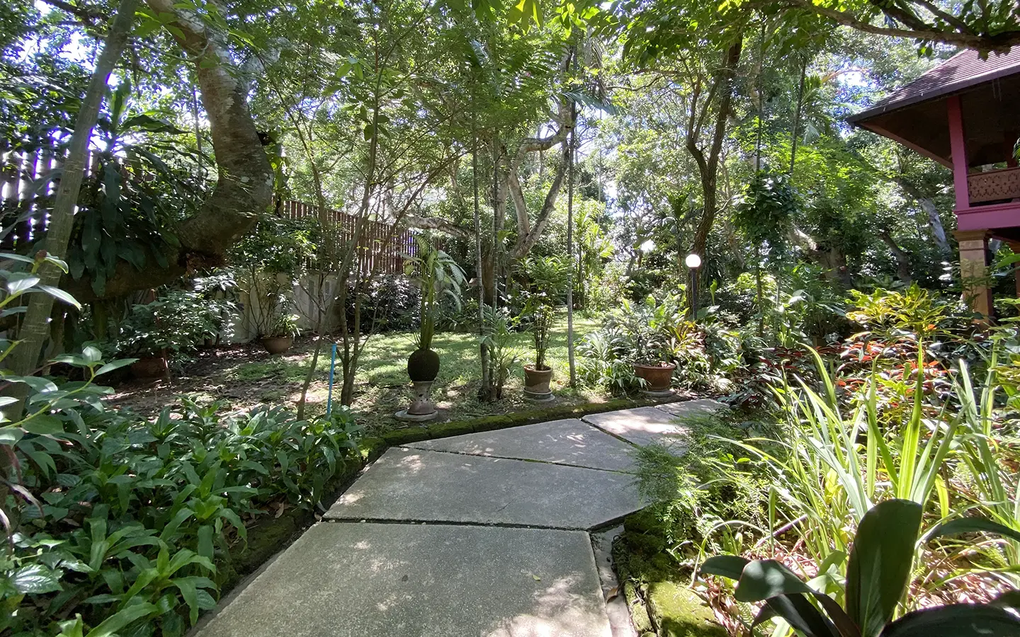 The property sits on a large 2 and a half rais of beautifully kept land. Lovely driveway from the gate to the all-teakwood house which is about 30 years old but is well maintained and in good condition. On the ground floor, it is all open plan in a contemporary Thai style with beams, wood ceilings and terracotta flooring. This is an area to informally receive guests, entertain or simply relax. There is a study room which can be turned into a third bedroom, a guest bathroom and a fully fitted Western kitchen with a built-in oven and a dining table.