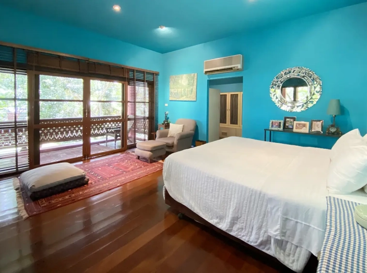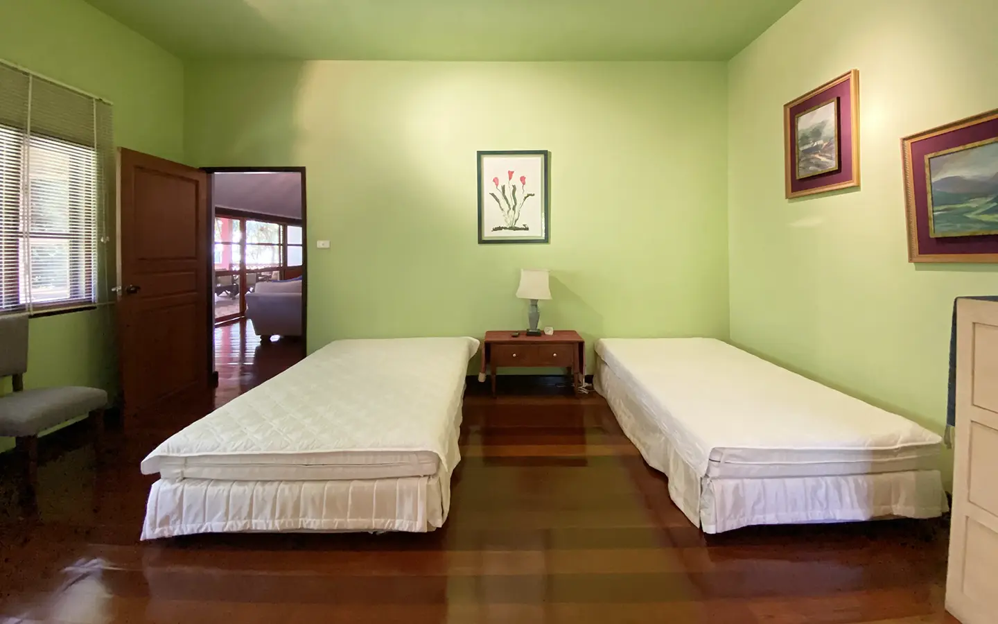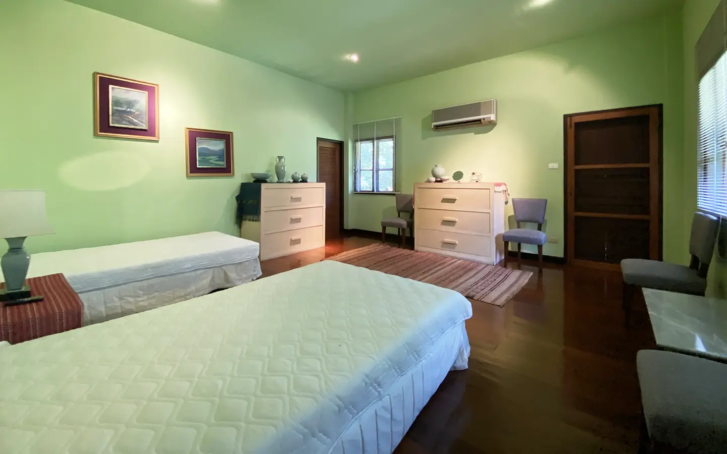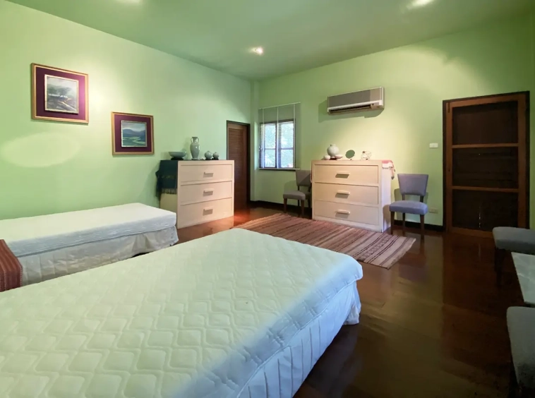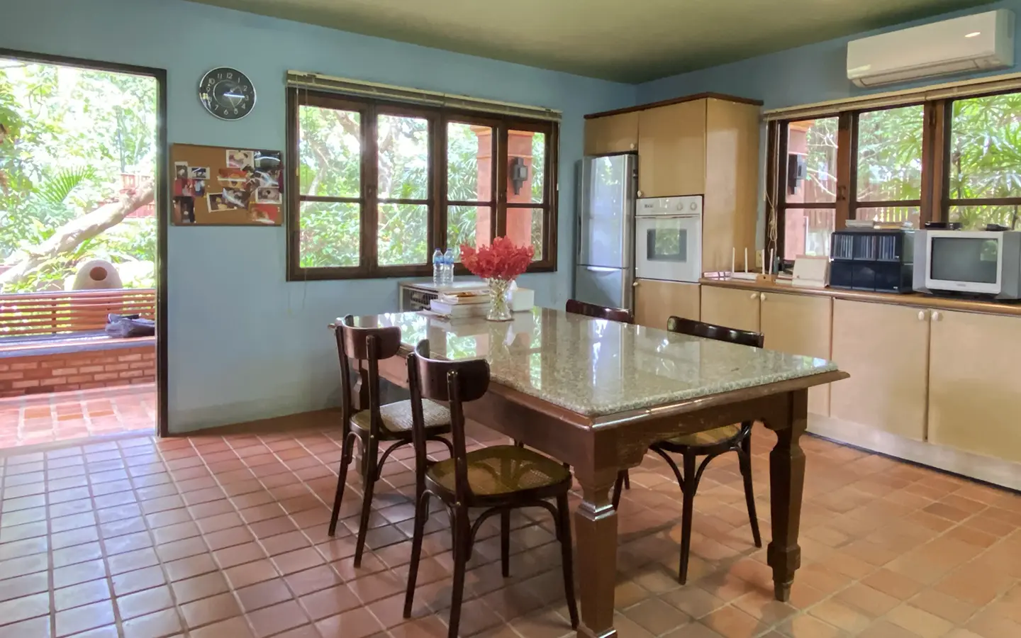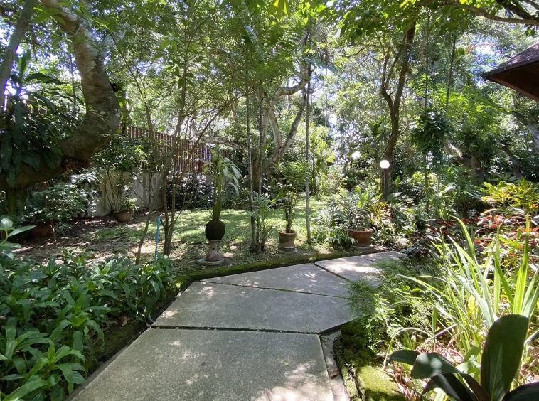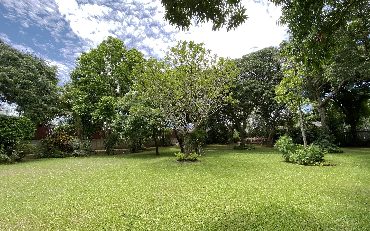 The property sits on a large 2 and a half rais of beautifully kept land. Lovely driveway from the gate to the all-teakwood house which is about 30 years old but is well maintained and in good condition. On the ground floor, it is all open plan in a contemporary Thai style with beams, wood ceilings and terracotta flooring. This is an area to informally receive guests, entertain or simply relax. There is a study room which can be turned into a third bedroom, a guest bathroom and a fully fitted Western kitchen with a built-in oven and a dining table.