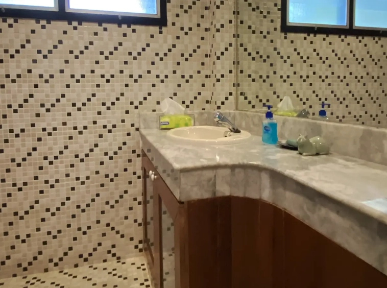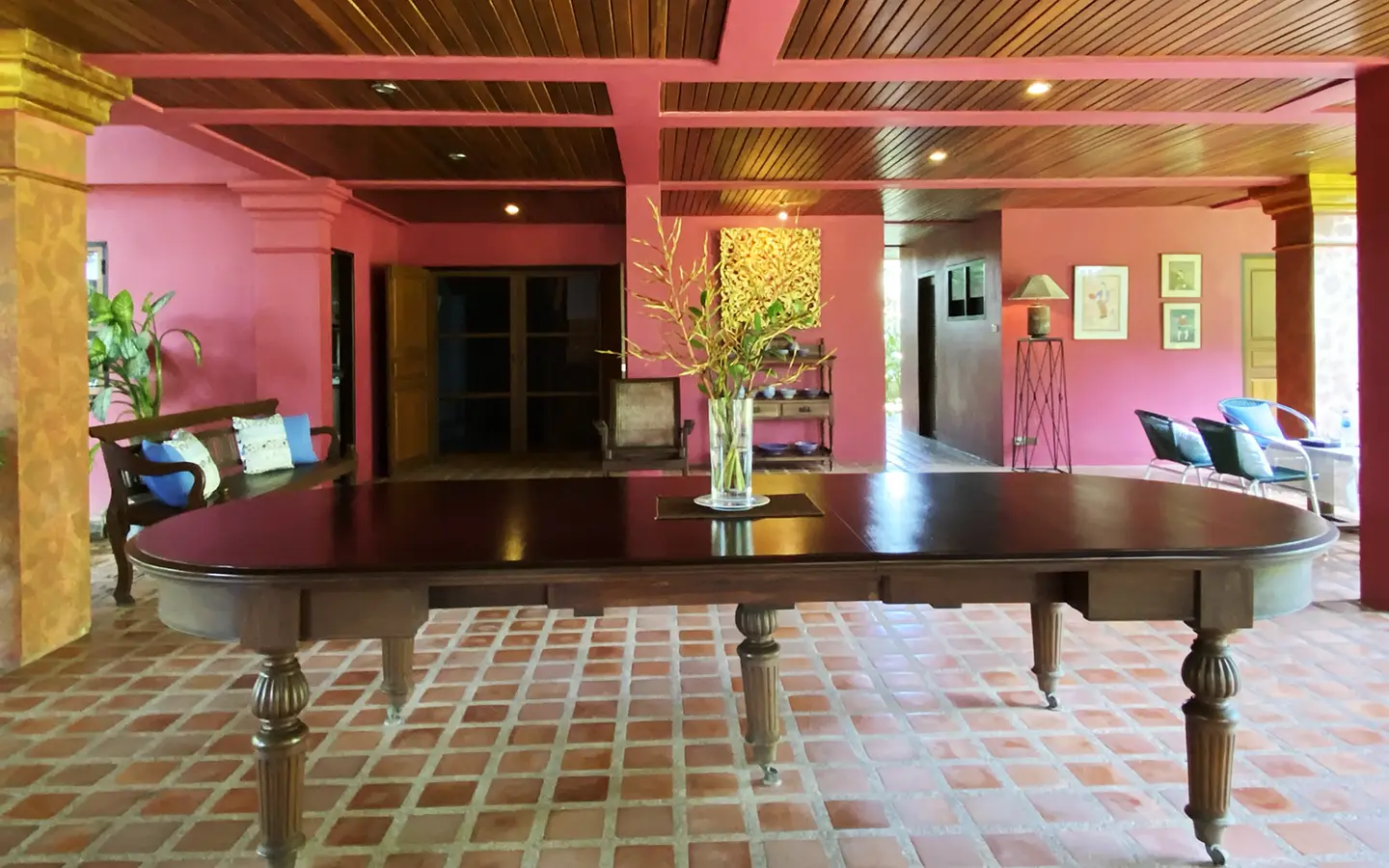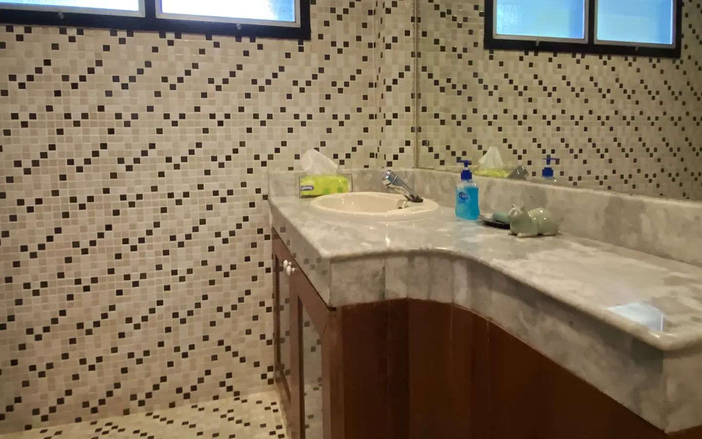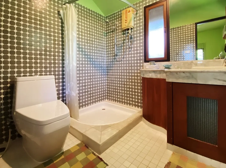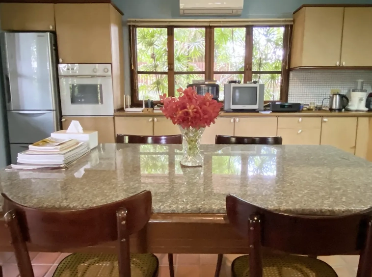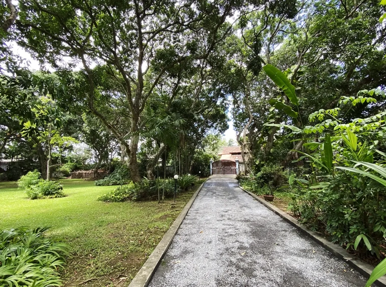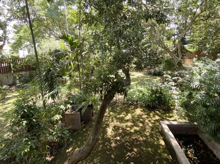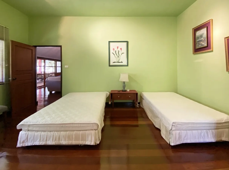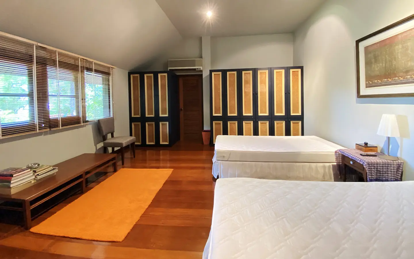 The property sits on a large 2 and a half rais of beautifully kept land. Lovely driveway from the gate to the all-teakwood house which is about 30 years old but is well maintained and in good condition. On the ground floor, it is all open plan in a contemporary Thai style with beams, wood ceilings and terracotta flooring. This is an area to informally receive guests, entertain or simply relax. There is a study room which can be turned into a third bedroom, a guest bathroom and a fully fitted Western kitchen with a built-in oven and a dining table.