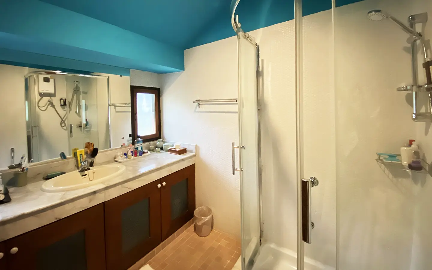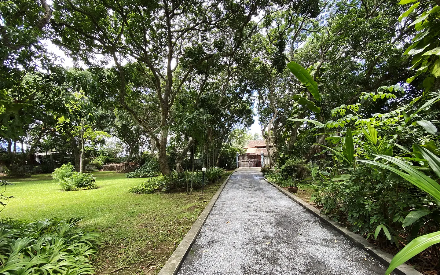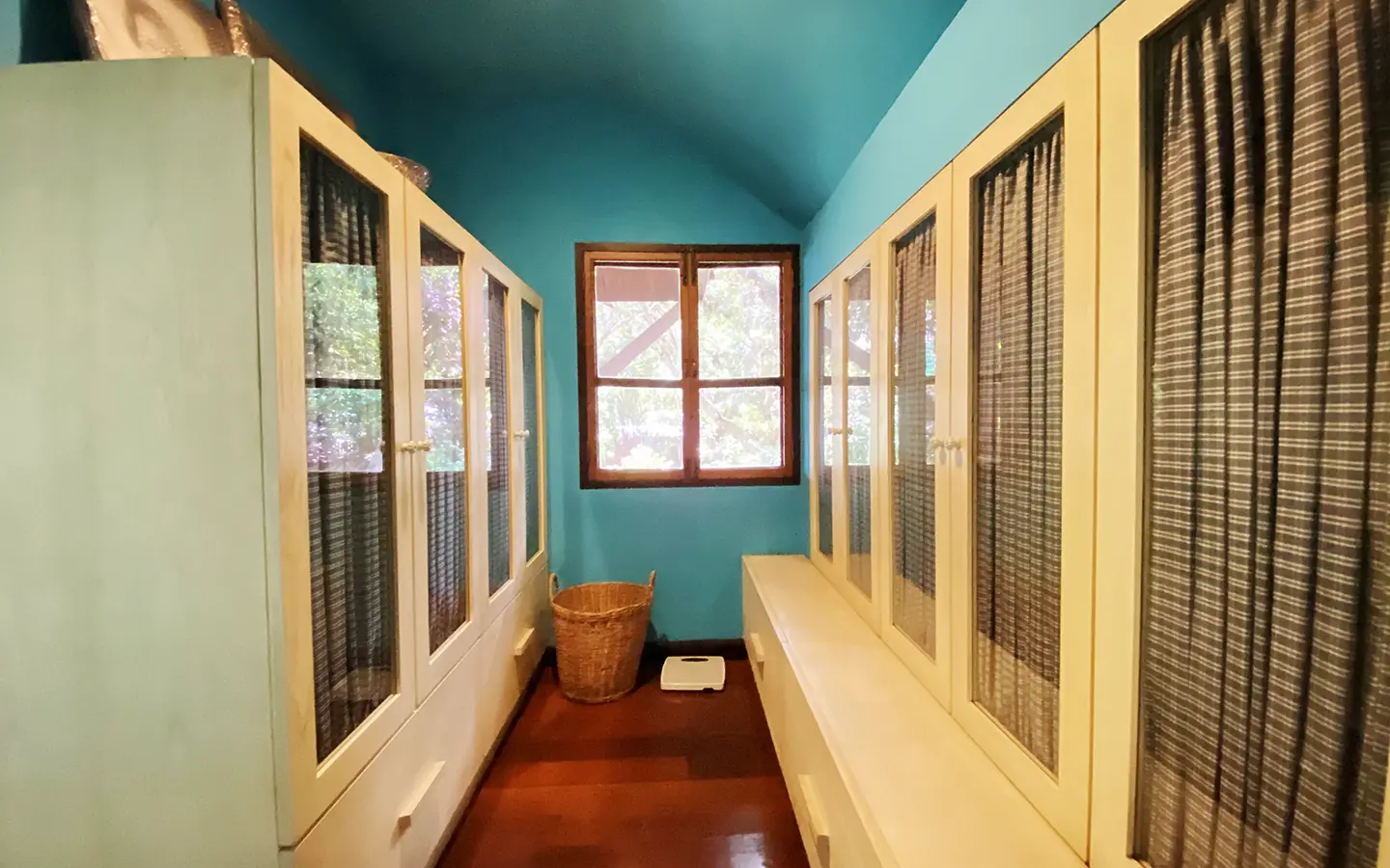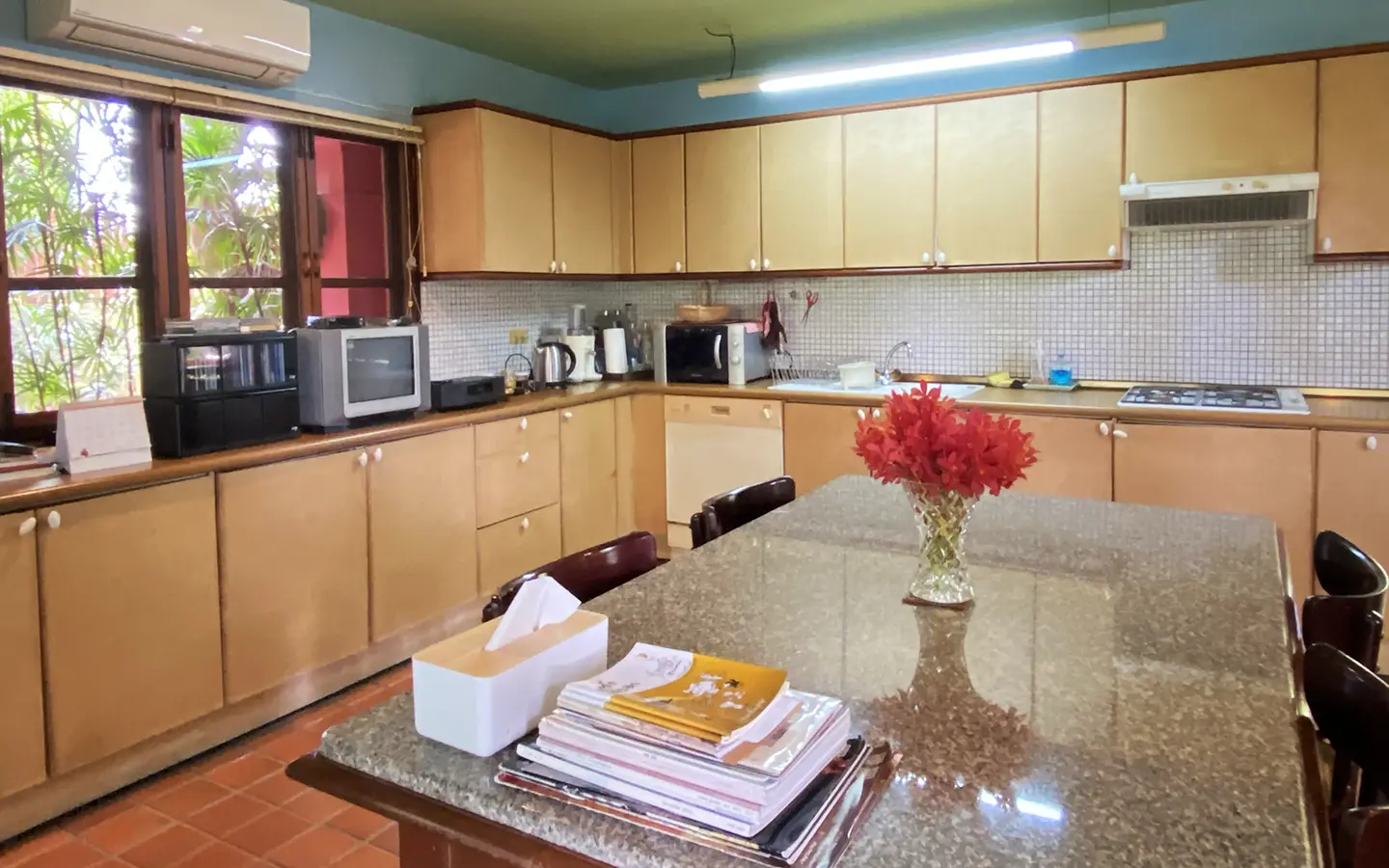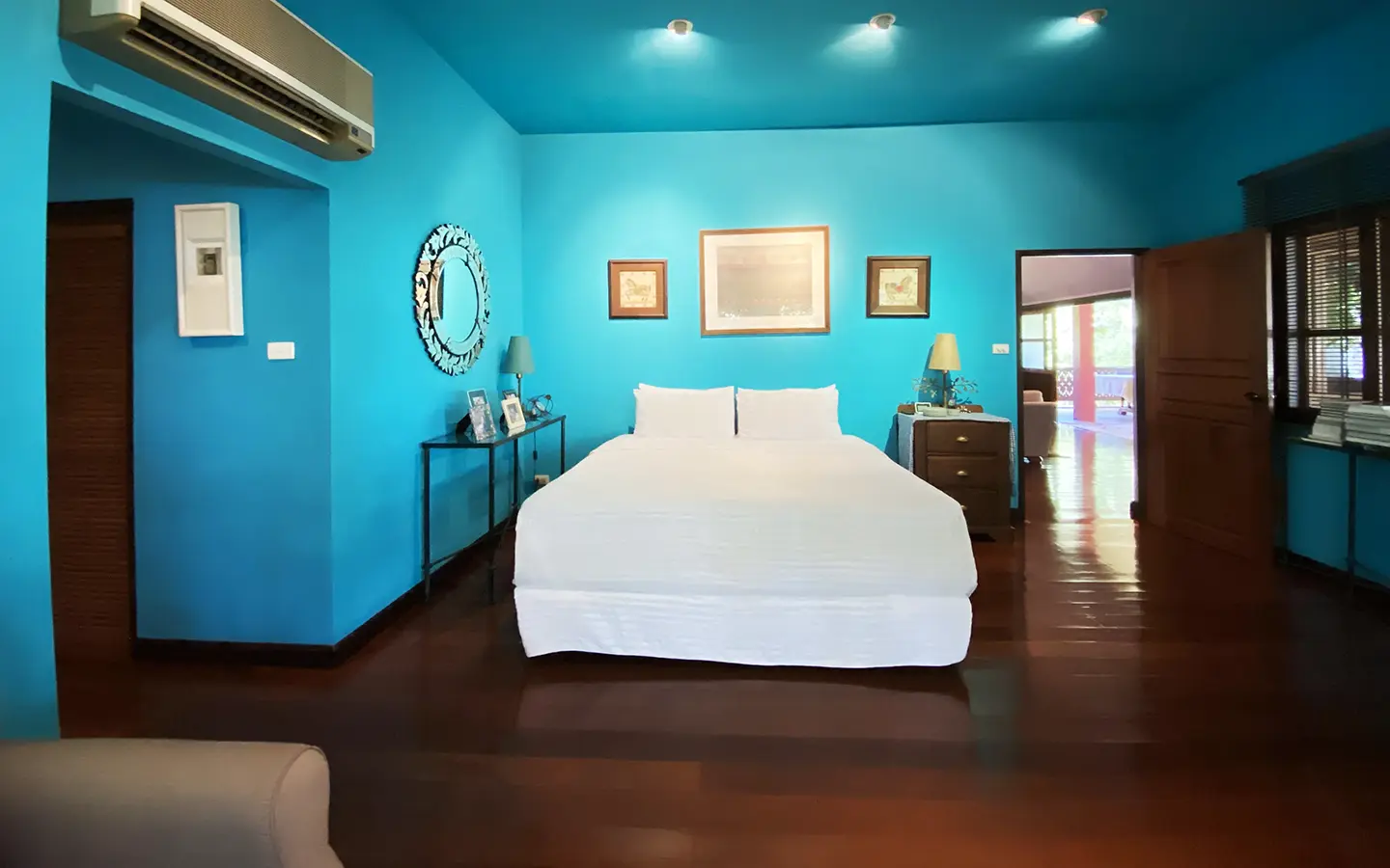 The property sits on a large 2 and a half rais of beautifully kept land. Lovely driveway from the gate to the all-teakwood house which is about 30 years old but is well maintained and in good condition. On the ground floor, it is all open plan in a contemporary Thai style with beams, wood ceilings and terracotta flooring. This is an area to informally receive guests, entertain or simply relax. There is a study room which can be turned into a third bedroom, a guest bathroom and a fully fitted Western kitchen with a built-in oven and a dining table.