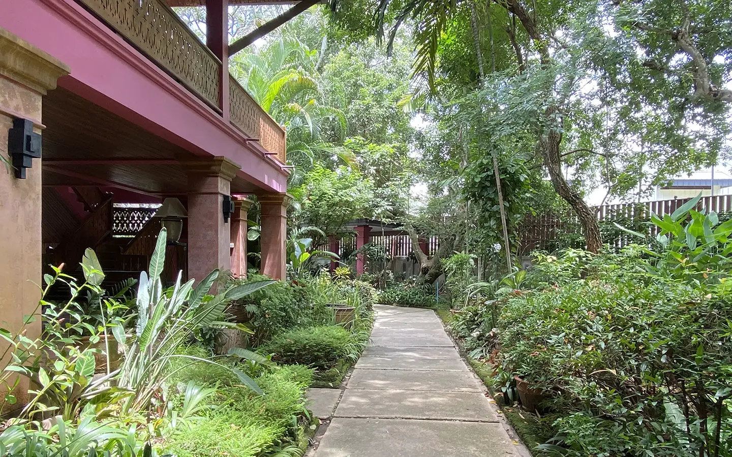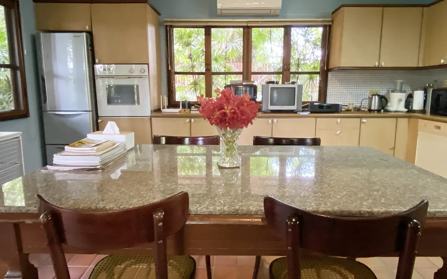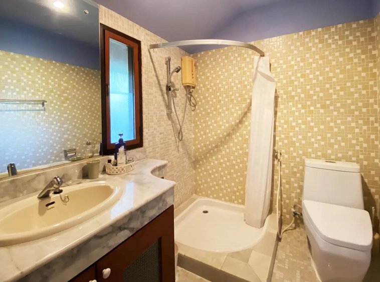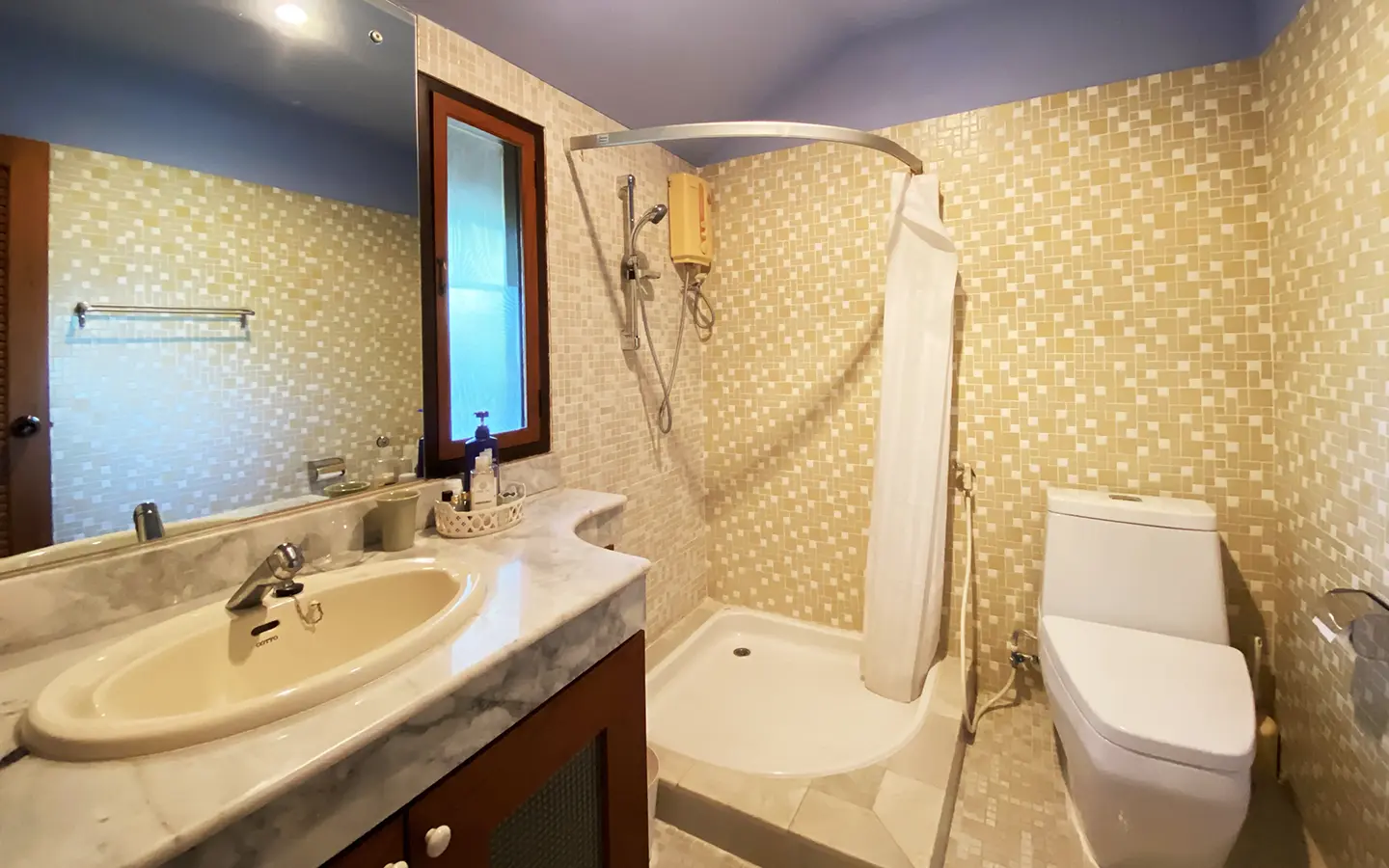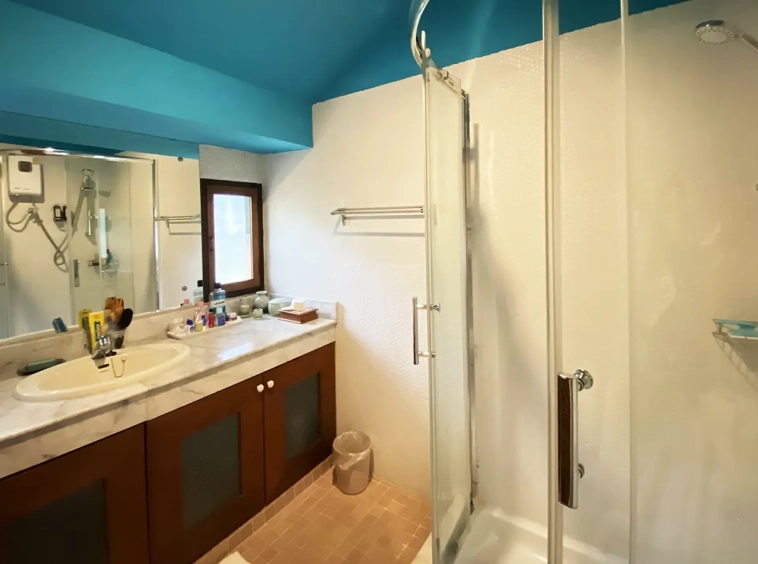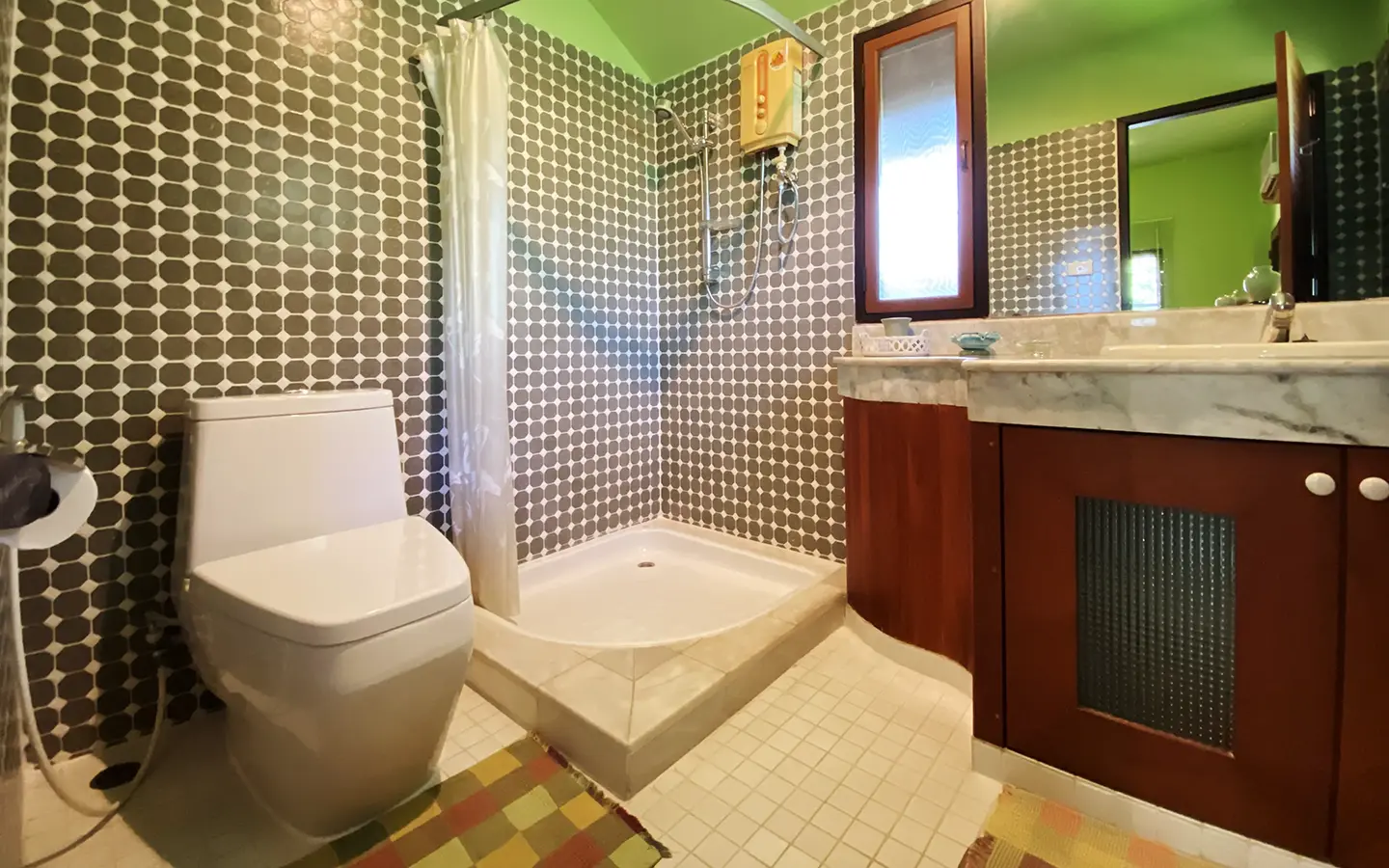 The property sits on a large 2 and a half rais of beautifully kept land. Lovely driveway from the gate to the all-teakwood house which is about 30 years old but is well maintained and in good condition. On the ground floor, it is all open plan in a contemporary Thai style with beams, wood ceilings and terracotta flooring. This is an area to informally receive guests, entertain or simply relax. There is a study room which can be turned into a third bedroom, a guest bathroom and a fully fitted Western kitchen with a built-in oven and a dining table.