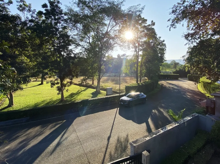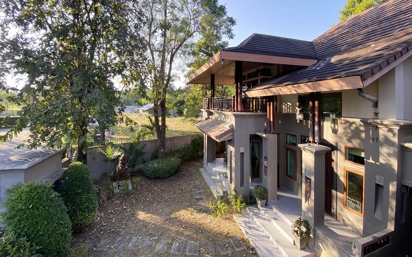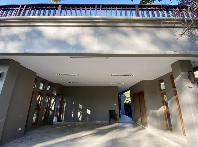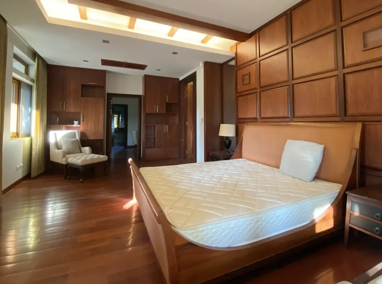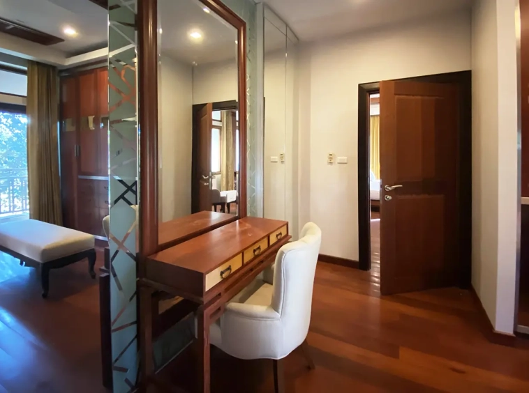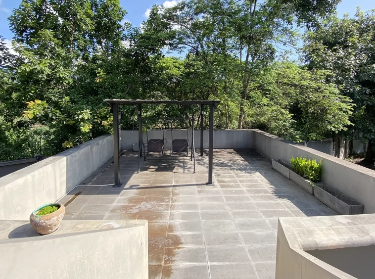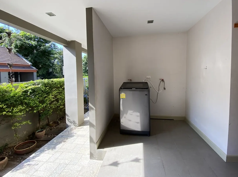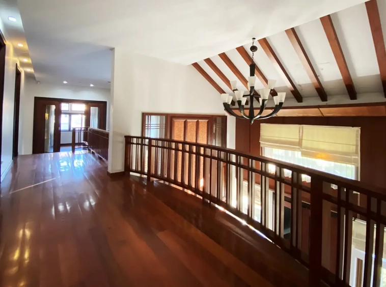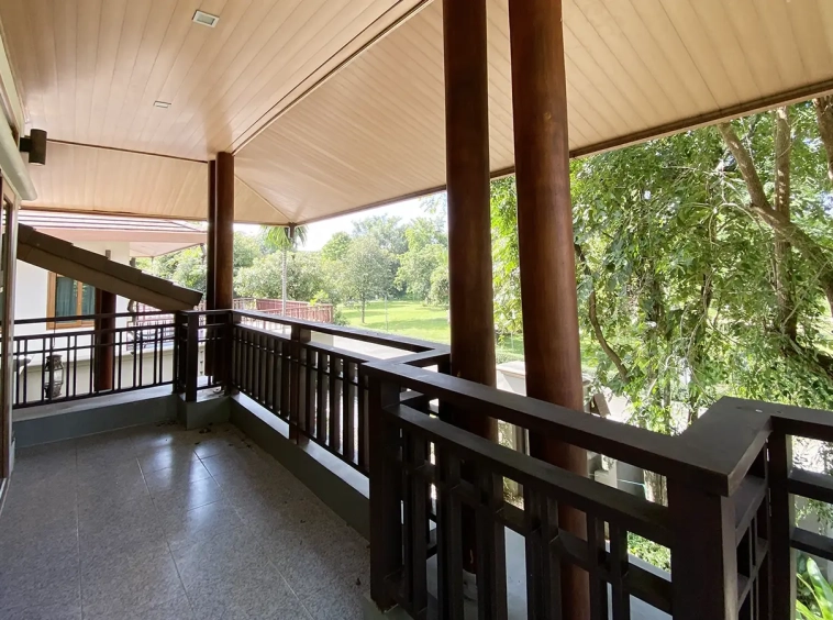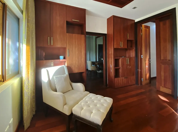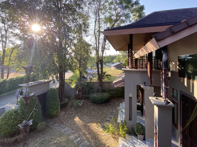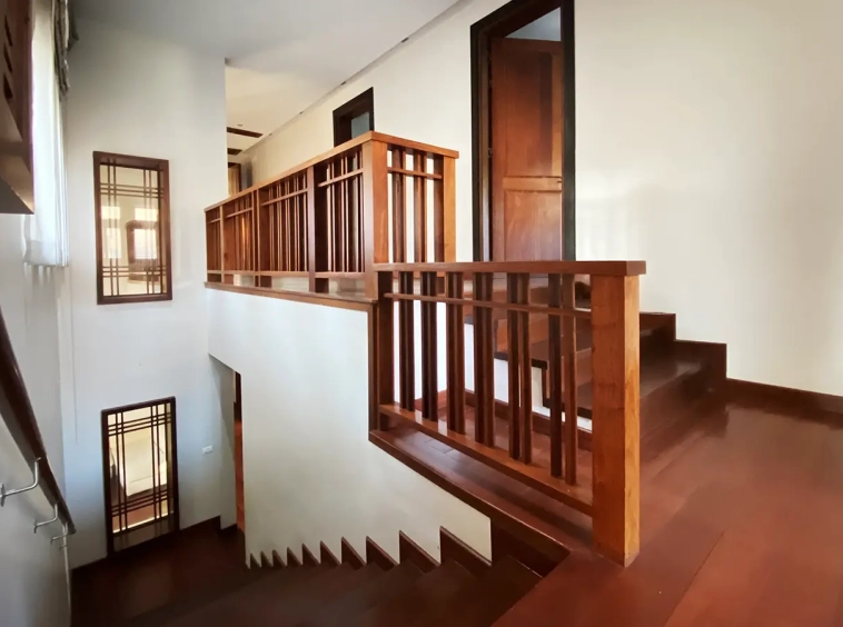 Going up the beautiful wood staircase there is a large hallway with railings looking down at the living area below. There is a sitting room with access to a large terrace. 2 ensuite guest bedrooms, a study which has access to the rooftop terrace with gorgeous panoramic views of the mountain and Doi Suthep and Doi Kham temples. The master bedroom has its own sitting area and a wrapped-around terrace with greenery views. It also comes with a large walk-in dressing room and a large bathroom with a jacuzzi and walk-in shower. There is a central a/c throughout the house.