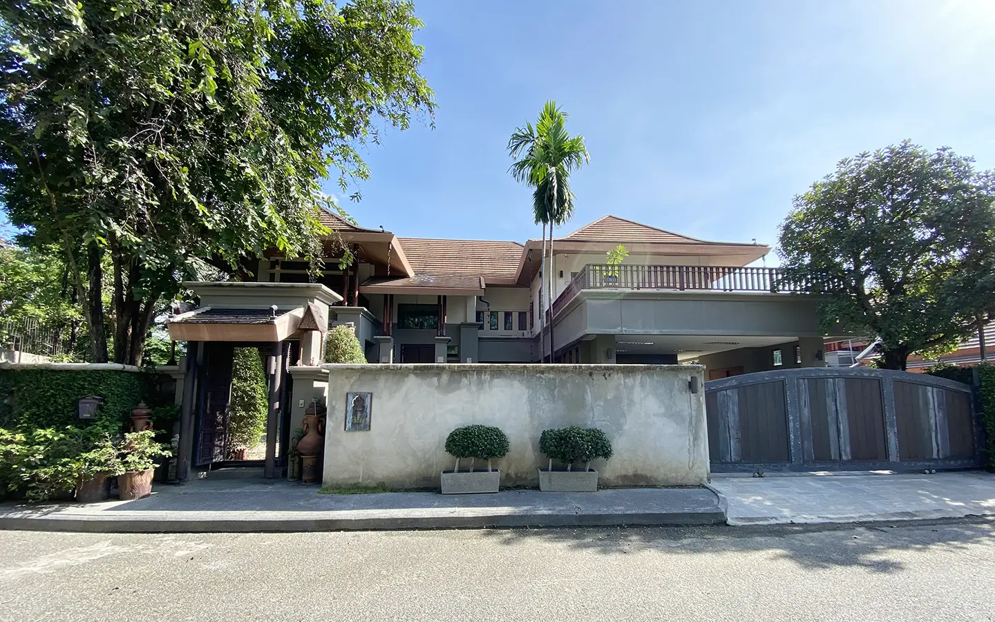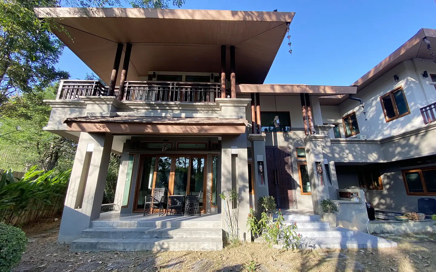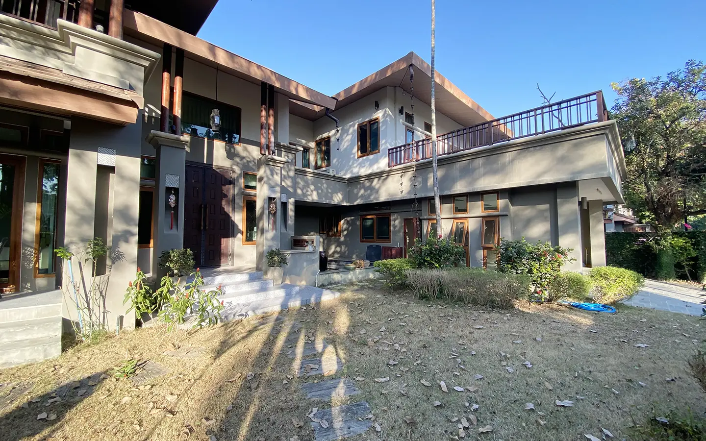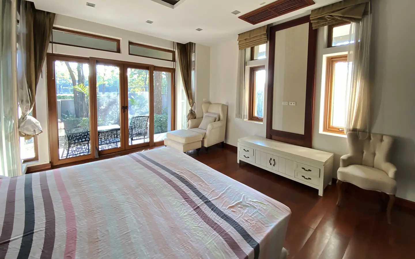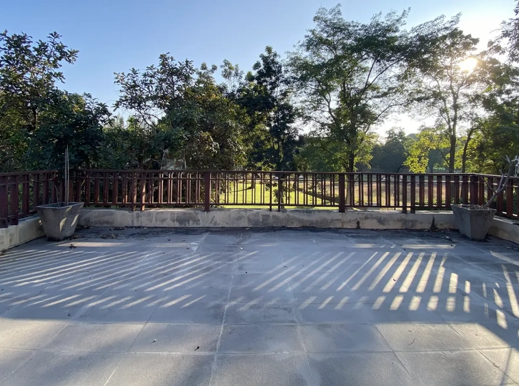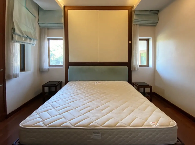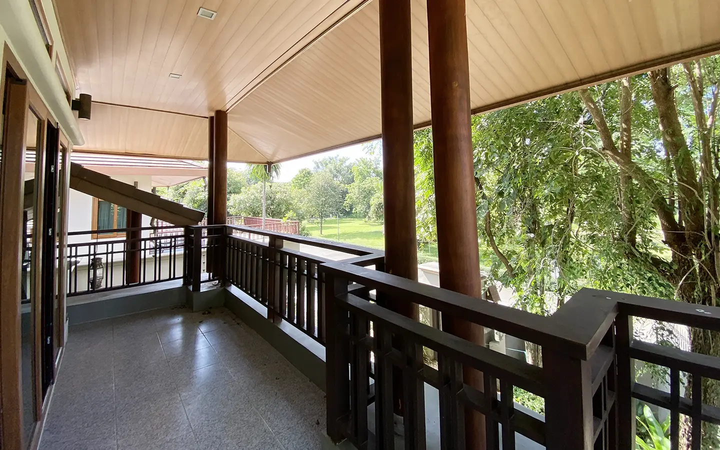 Going up the beautiful wood staircase there is a large hallway with railings looking down at the living area below. There is a sitting room with access to a large terrace. 2 ensuite guest bedrooms, a study which has access to the rooftop terrace with gorgeous panoramic views of the mountain and Doi Suthep and Doi Kham temples. The master bedroom has its own sitting area and a wrapped-around terrace with greenery views. It also comes with a large walk-in dressing room and a large bathroom with a jacuzzi and walk-in shower. There is a central a/c throughout the house.