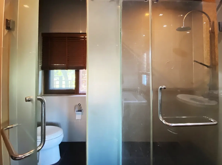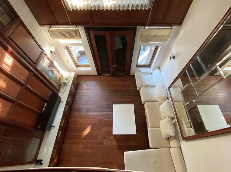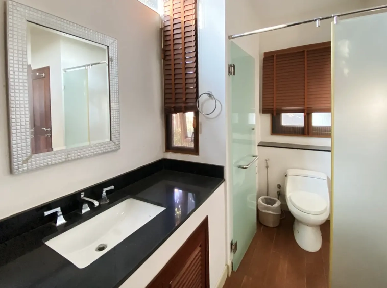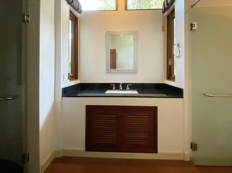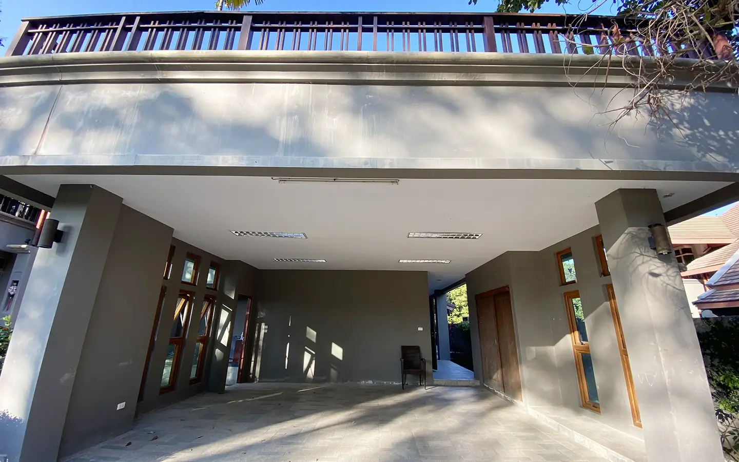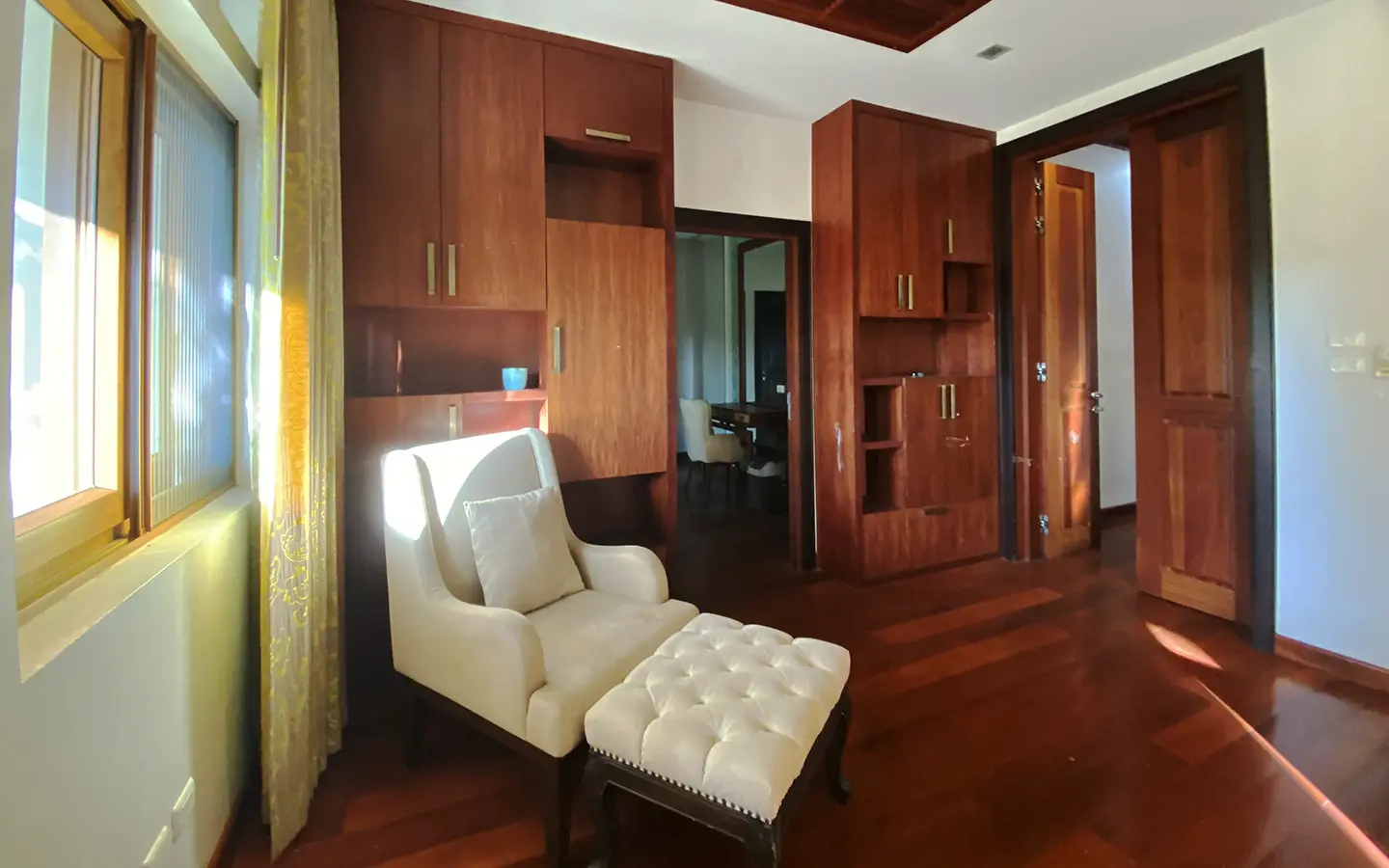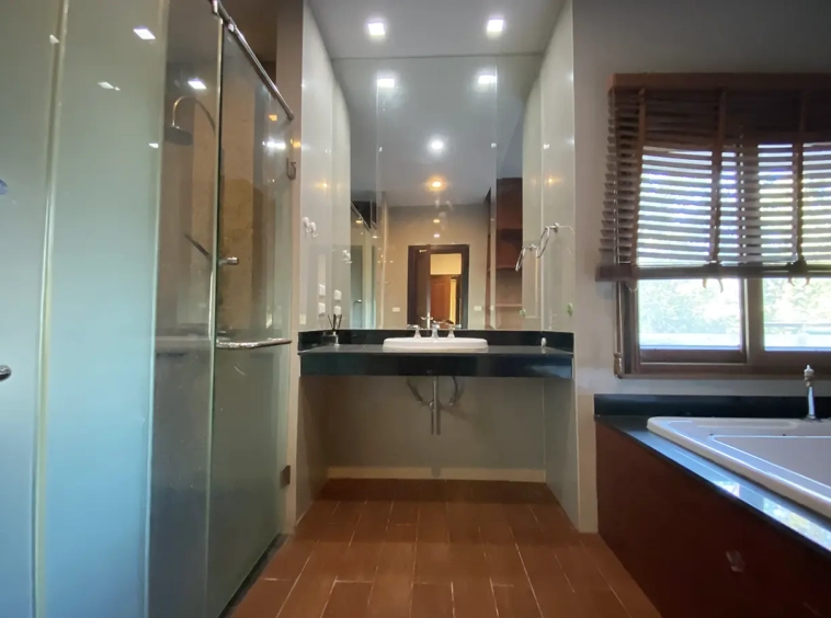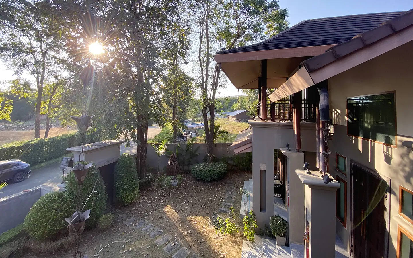 Going up the beautiful wood staircase there is a large hallway with railings looking down at the living area below. There is a sitting room with access to a large terrace. 2 ensuite guest bedrooms, a study which has access to the rooftop terrace with gorgeous panoramic views of the mountain and Doi Suthep and Doi Kham temples. The master bedroom has its own sitting area and a wrapped-around terrace with greenery views. It also comes with a large walk-in dressing room and a large bathroom with a jacuzzi and walk-in shower. There is a central a/c throughout the house.