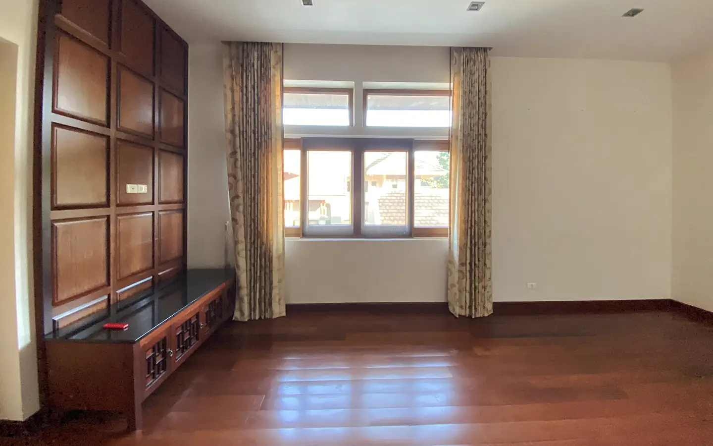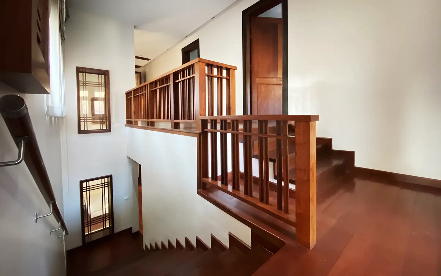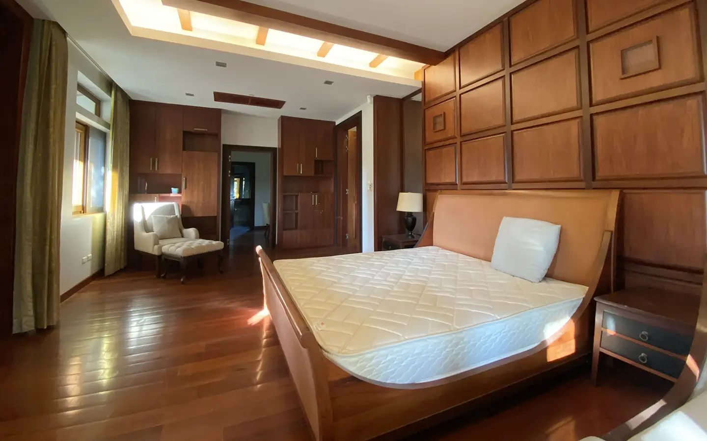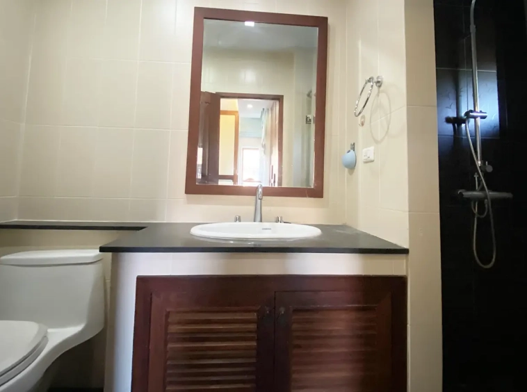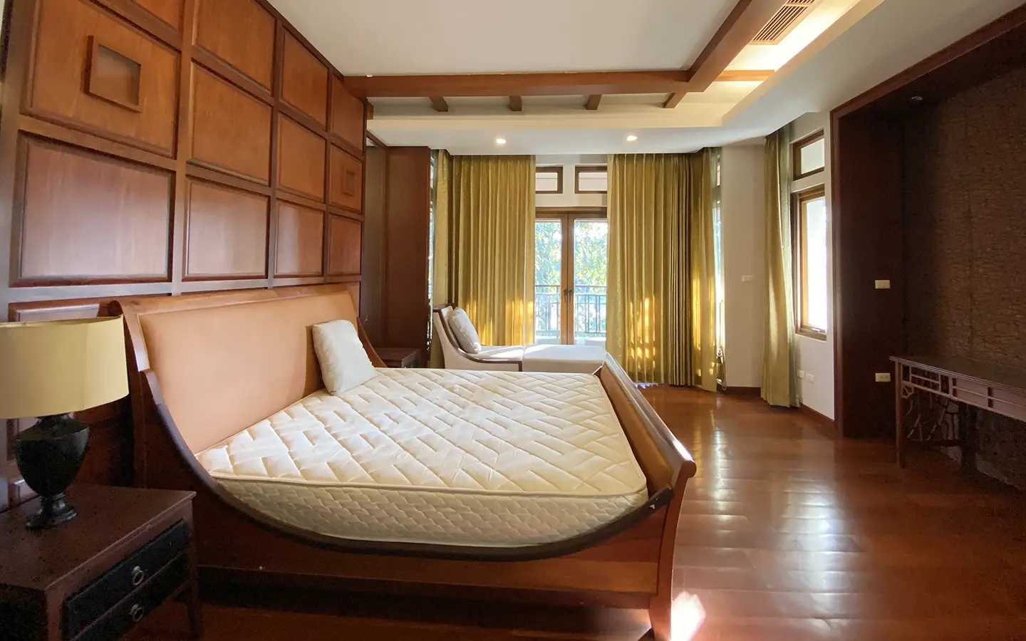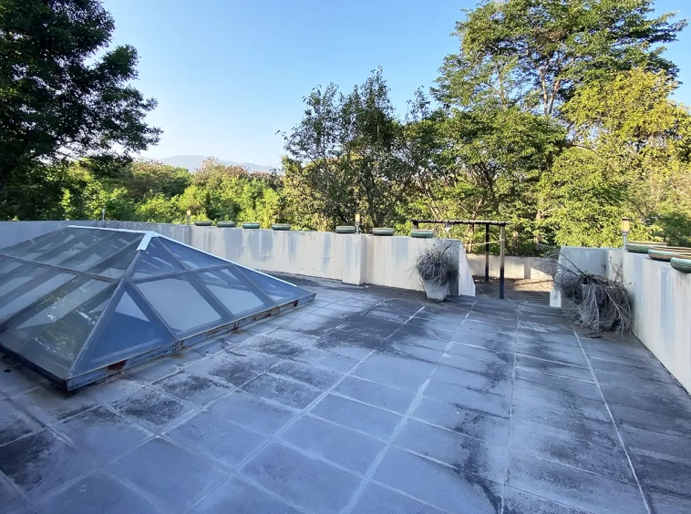 Going up the beautiful wood staircase there is a large hallway with railings looking down at the living area below. There is a sitting room with access to a large terrace. 2 ensuite guest bedrooms, a study which has access to the rooftop terrace with gorgeous panoramic views of the mountain and Doi Suthep and Doi Kham temples. The master bedroom has its own sitting area and a wrapped-around terrace with greenery views. It also comes with a large walk-in dressing room and a large bathroom with a jacuzzi and walk-in shower. There is a central a/c throughout the house.