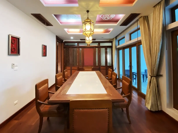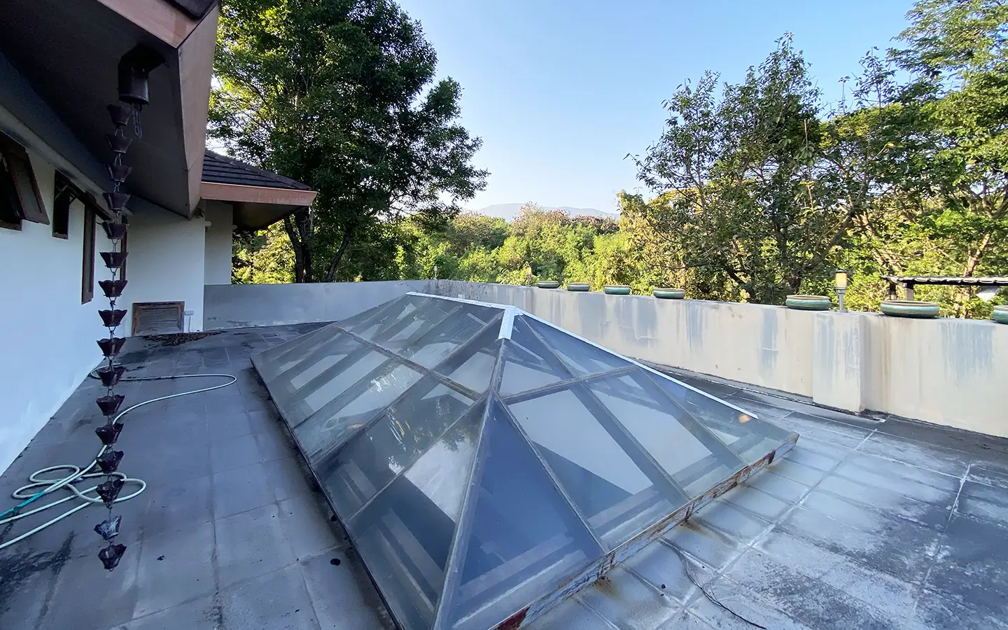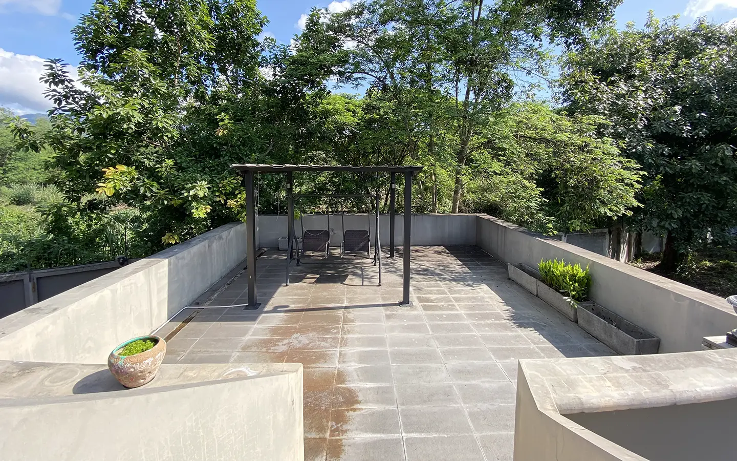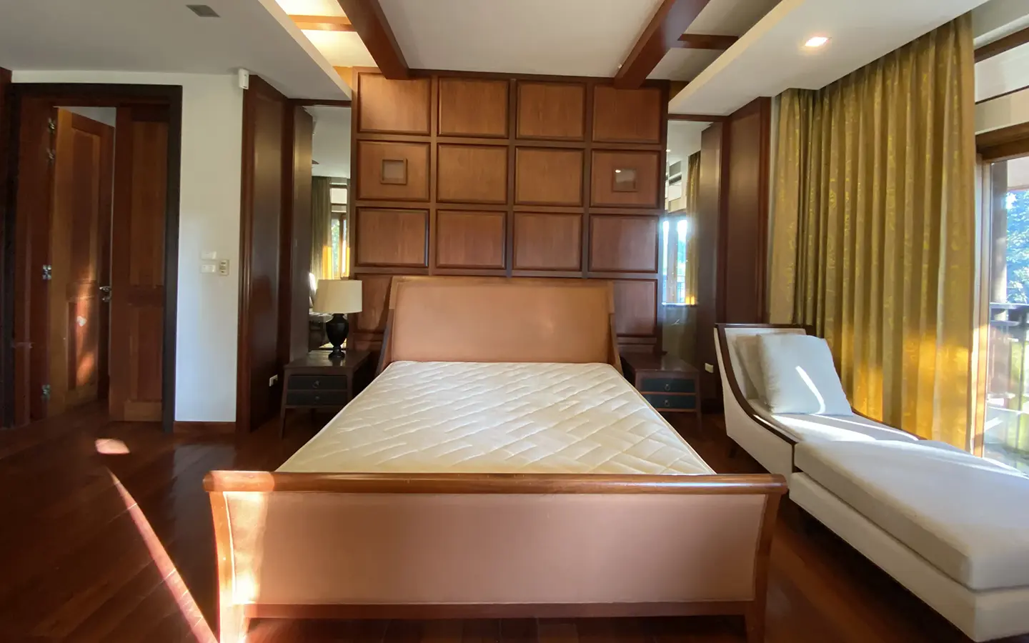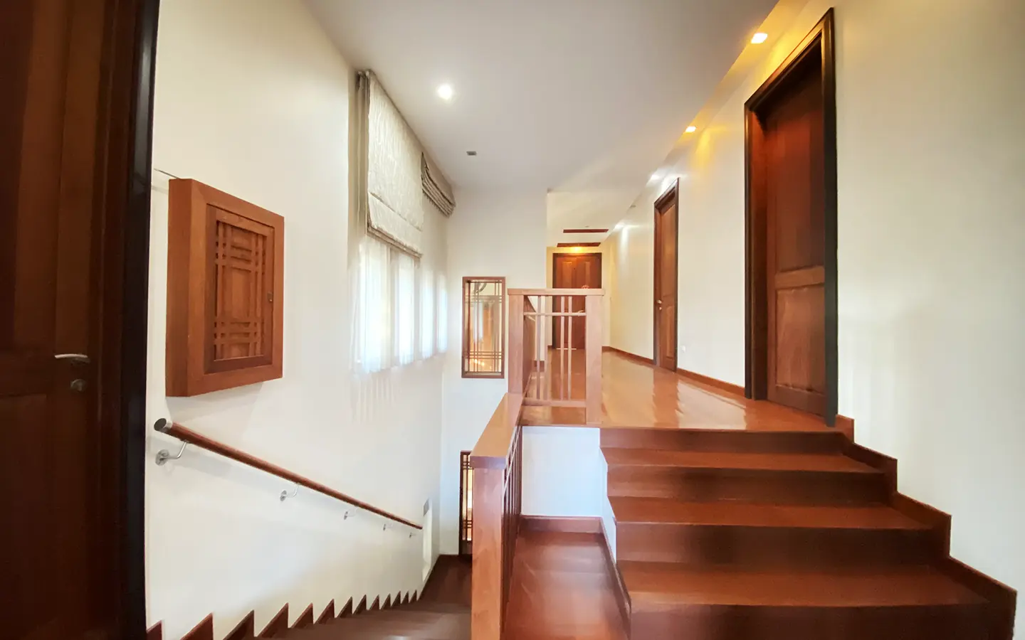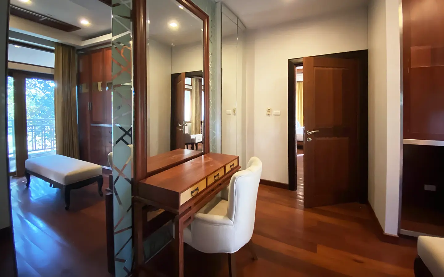 Going up the beautiful wood staircase there is a large hallway with railings looking down at the living area below. There is a sitting room with access to a large terrace. 2 ensuite guest bedrooms, a study which has access to the rooftop terrace with gorgeous panoramic views of the mountain and Doi Suthep and Doi Kham temples. The master bedroom has its own sitting area and a wrapped-around terrace with greenery views. It also comes with a large walk-in dressing room and a large bathroom with a jacuzzi and walk-in shower. There is a central a/c throughout the house.