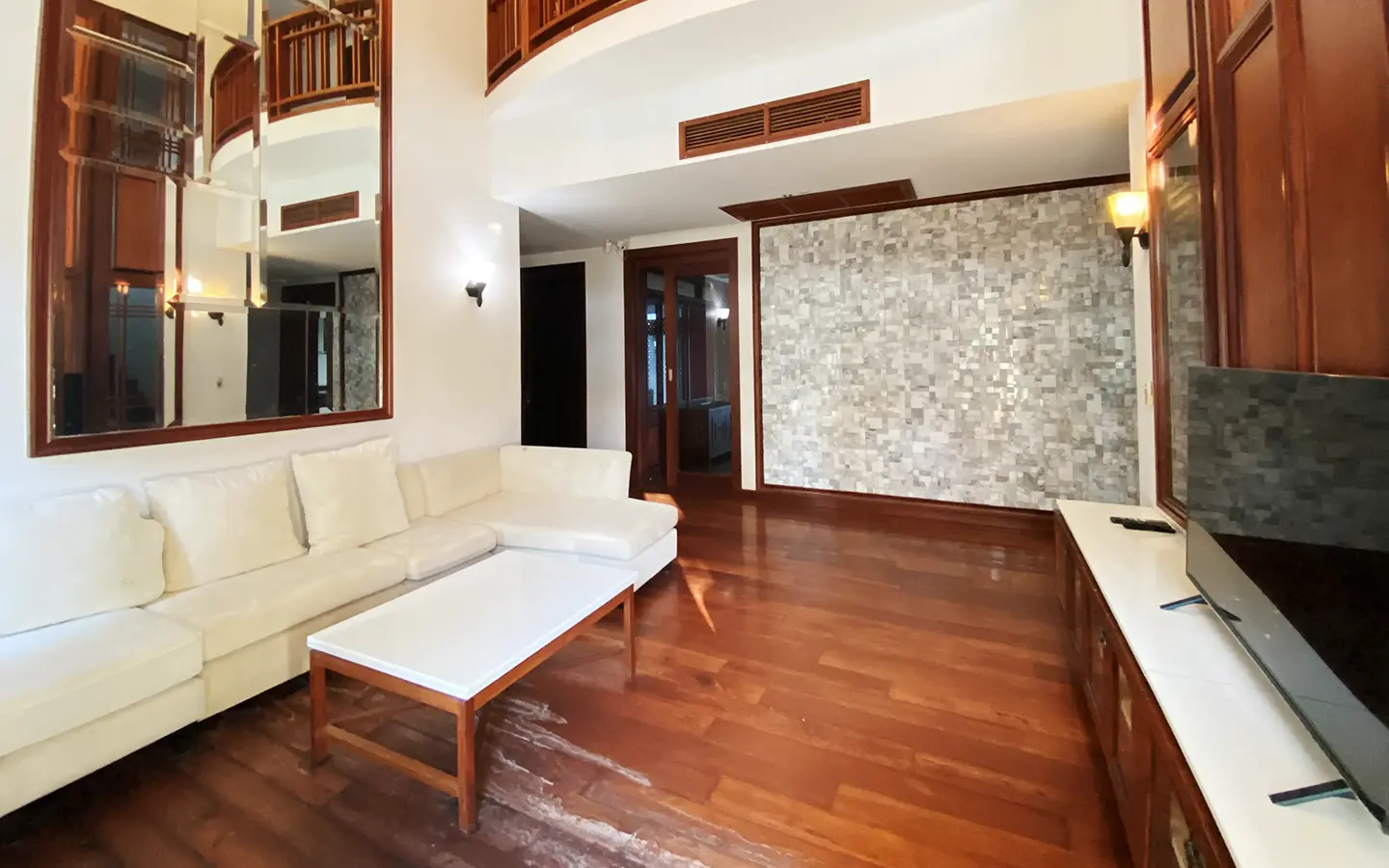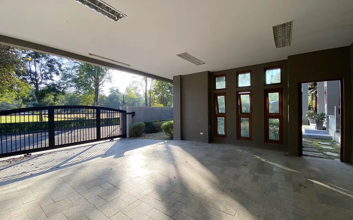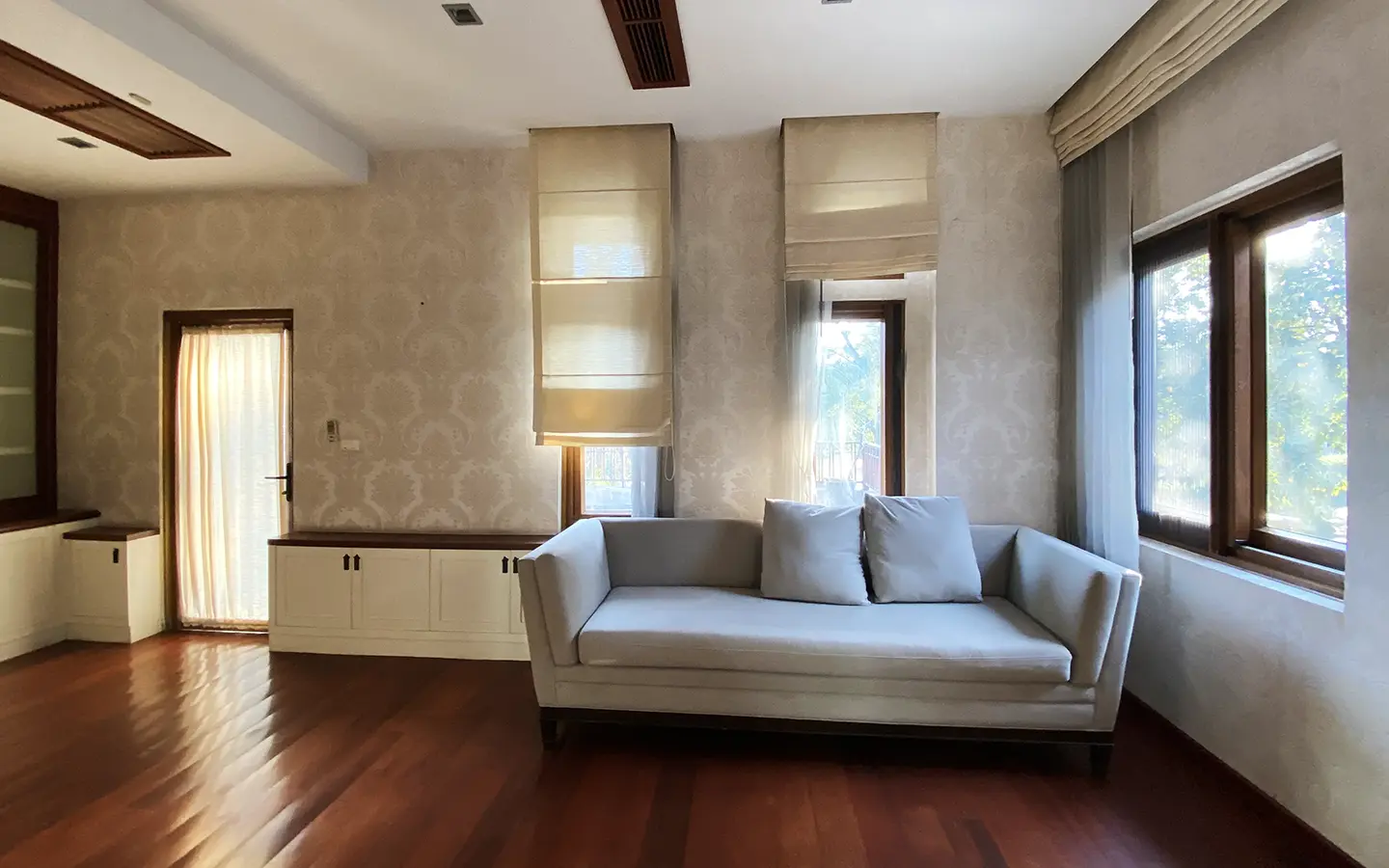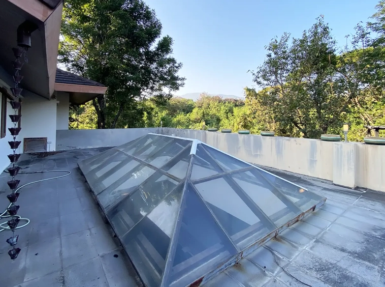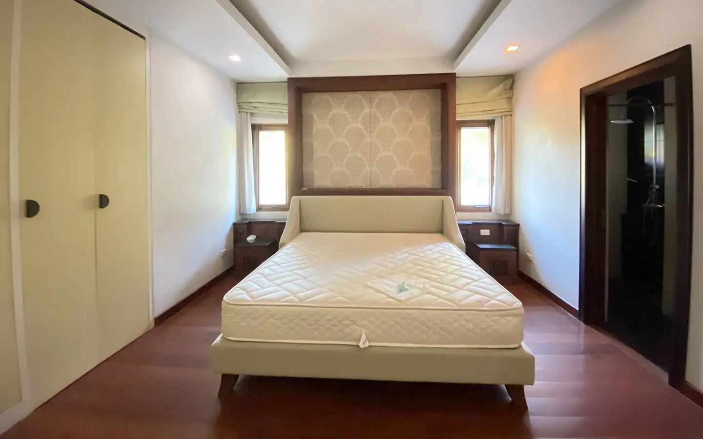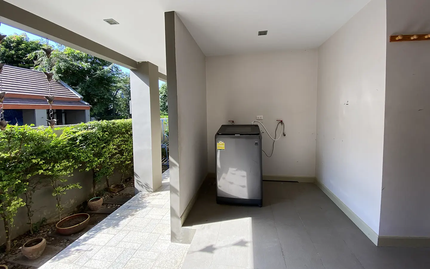 Going up the beautiful wood staircase there is a large hallway with railings looking down at the living area below. There is a sitting room with access to a large terrace. 2 ensuite guest bedrooms, a study which has access to the rooftop terrace with gorgeous panoramic views of the mountain and Doi Suthep and Doi Kham temples. The master bedroom has its own sitting area and a wrapped-around terrace with greenery views. It also comes with a large walk-in dressing room and a large bathroom with a jacuzzi and walk-in shower. There is a central a/c throughout the house.