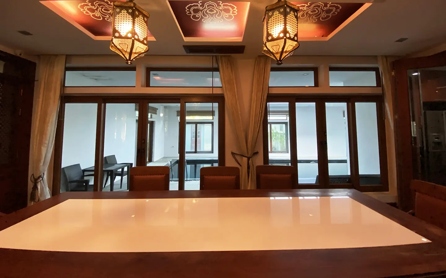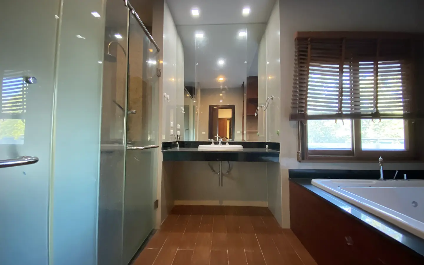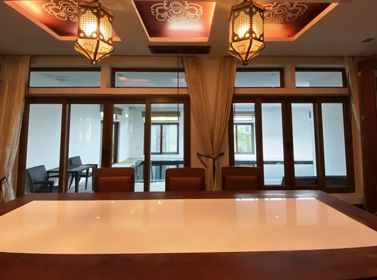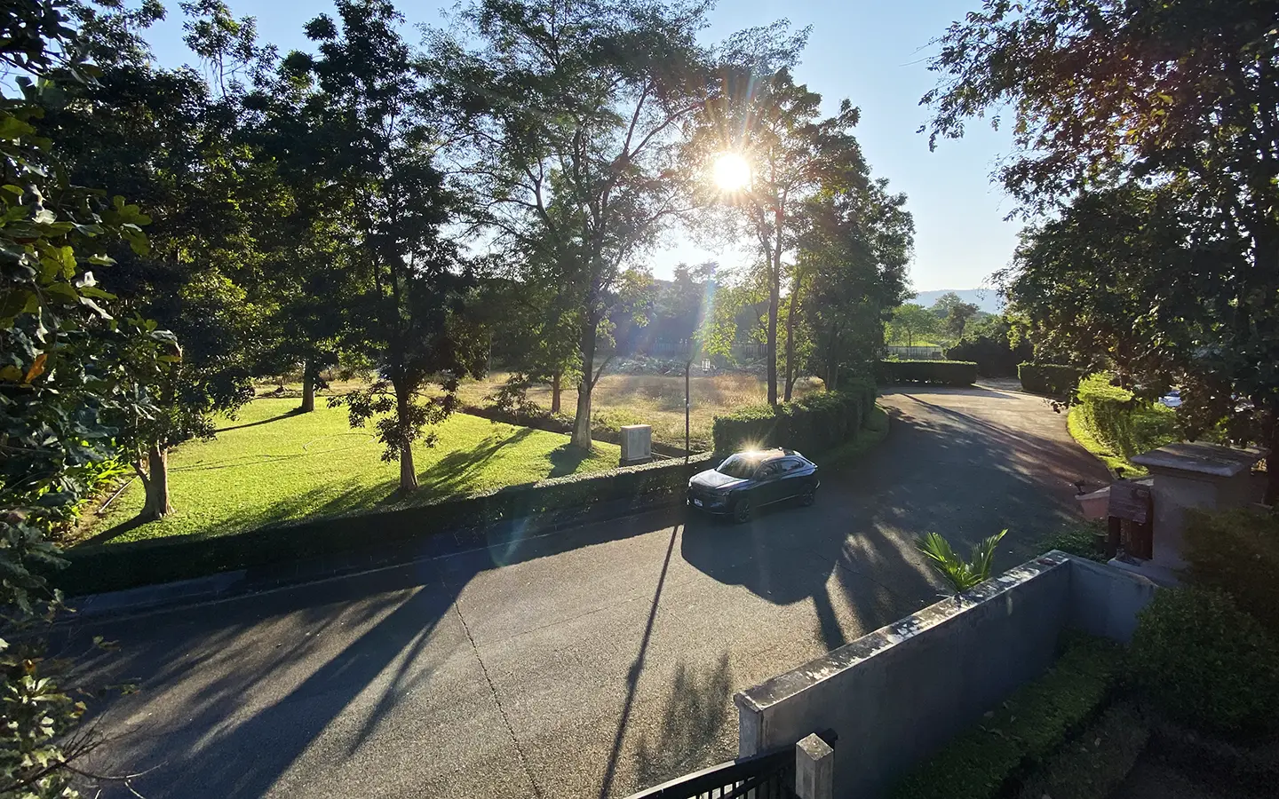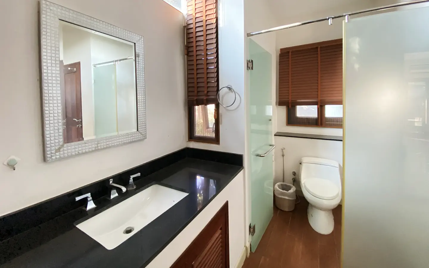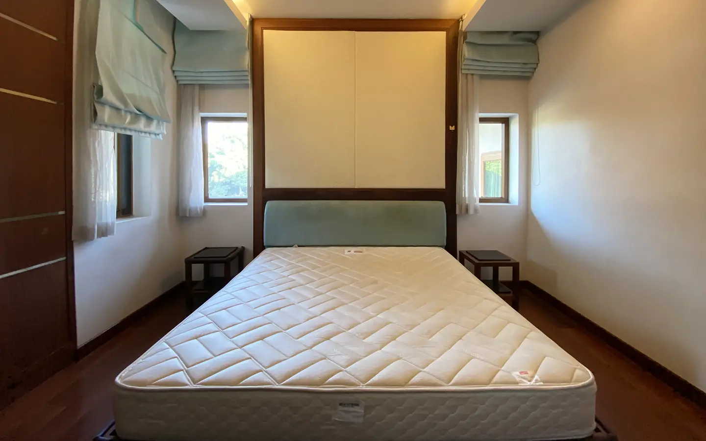 Going up the beautiful wood staircase there is a large hallway with railings looking down at the living area below. There is a sitting room with access to a large terrace. 2 ensuite guest bedrooms, a study which has access to the rooftop terrace with gorgeous panoramic views of the mountain and Doi Suthep and Doi Kham temples. The master bedroom has its own sitting area and a wrapped-around terrace with greenery views. It also comes with a large walk-in dressing room and a large bathroom with a jacuzzi and walk-in shower. There is a central a/c throughout the house.