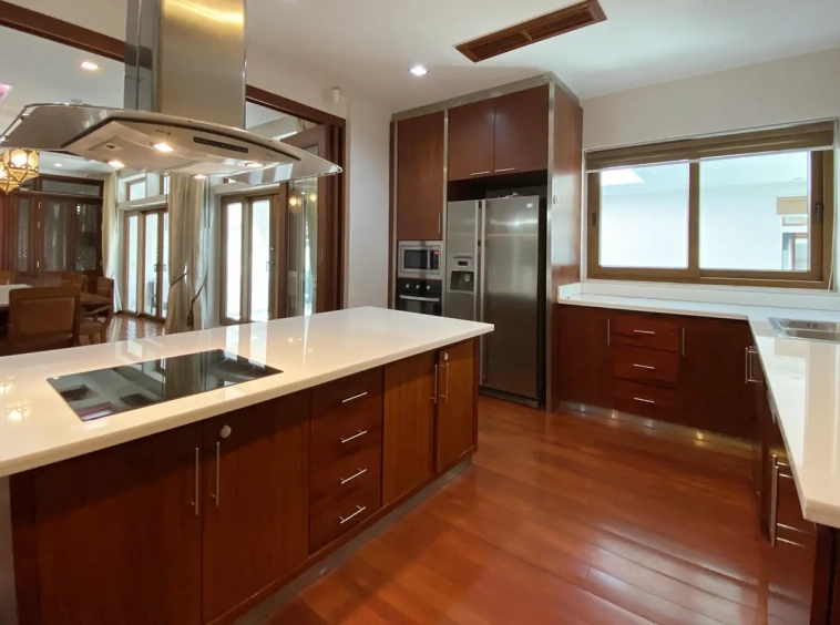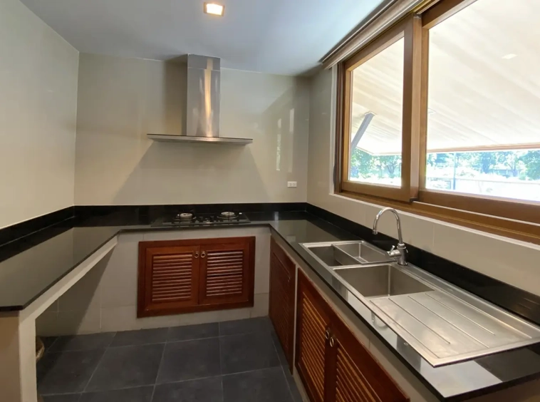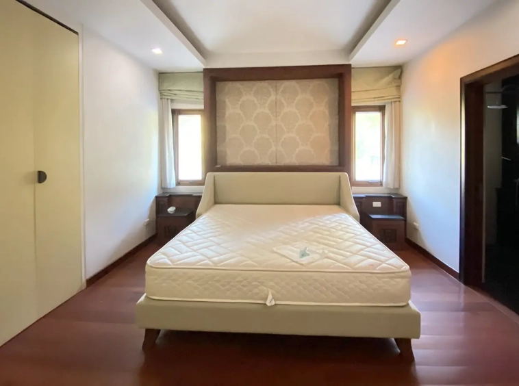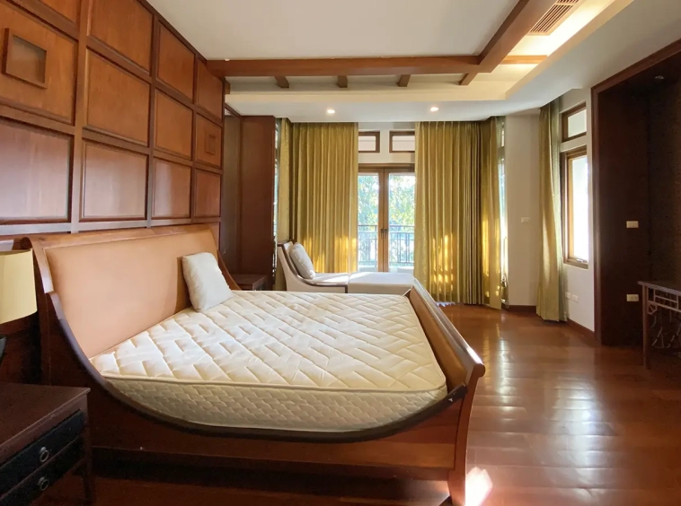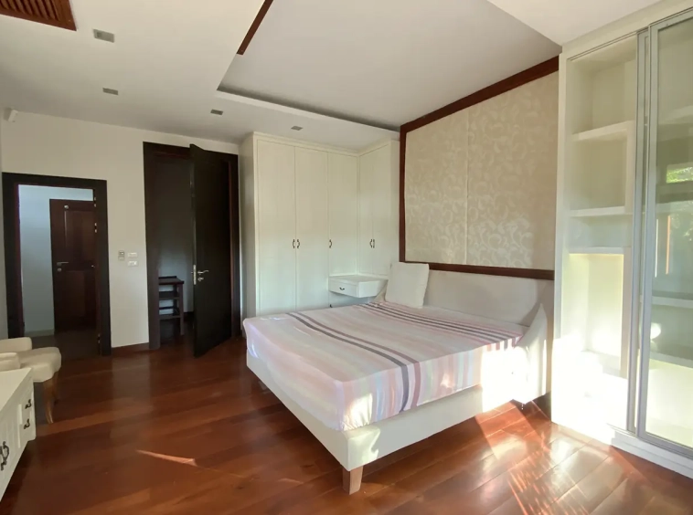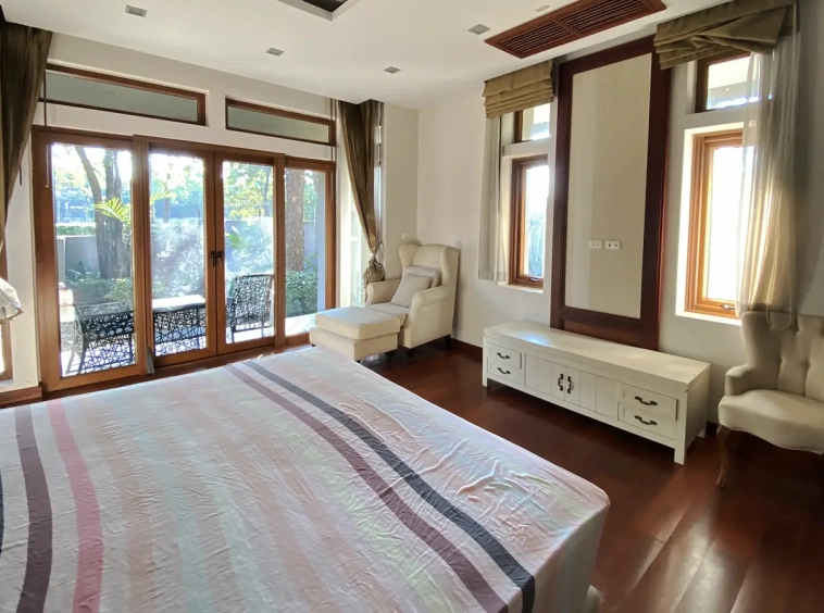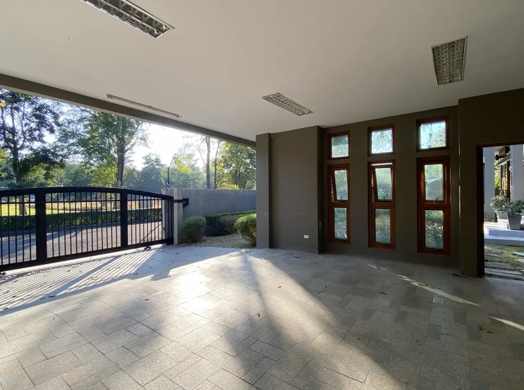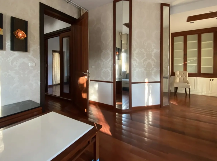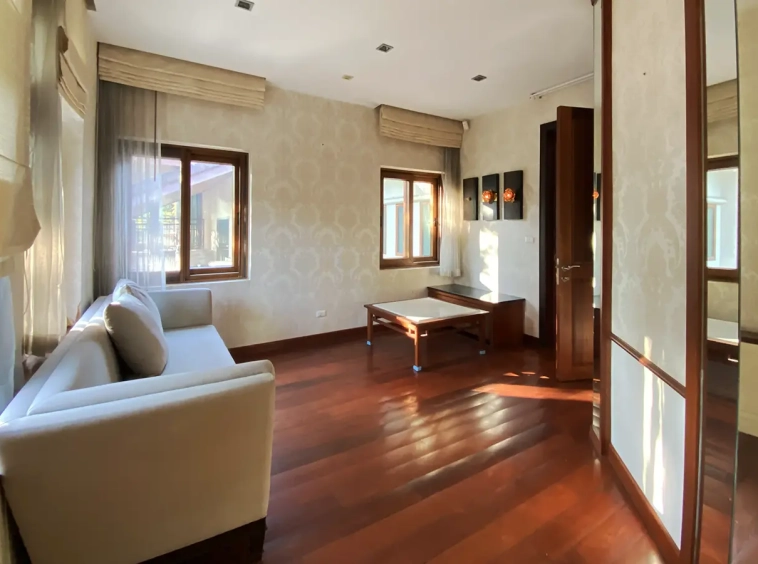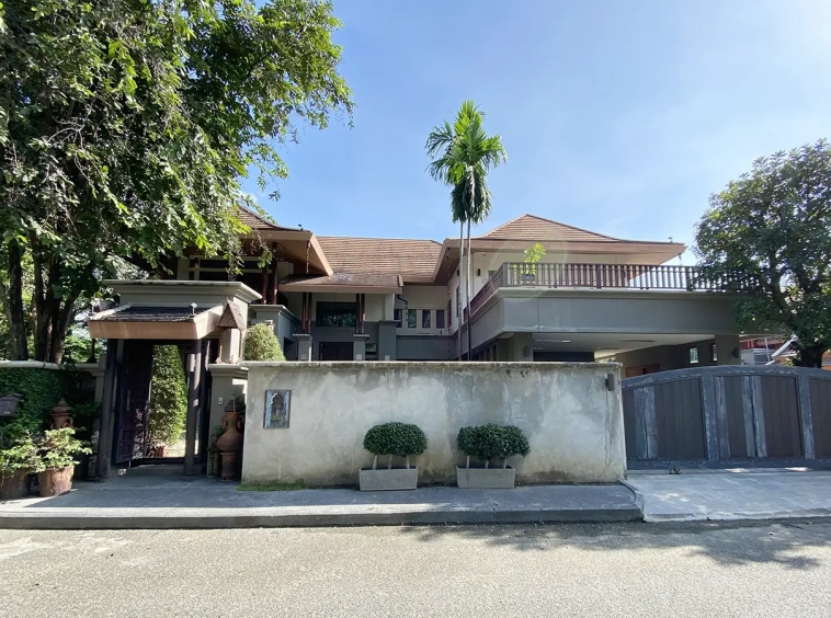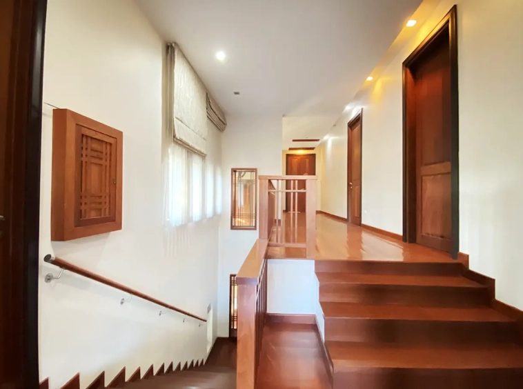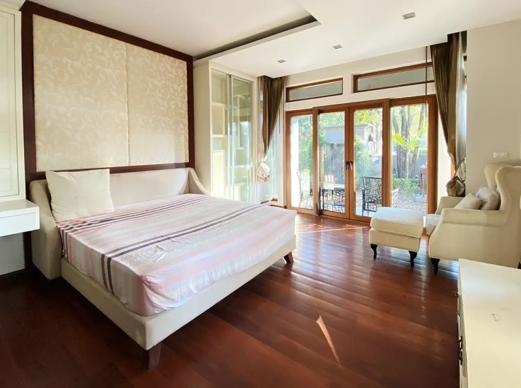 Being one of the very few properties in this exclusive and private state, the house occupies over half a rai of land, and has a lovely landscaped garden with a koi pond and a 4-car garage with storage room. The ensuite maid's quarter is attached here with access to the storage room and Thai kitchen. All fittings and trimmings in the house are of absolute high quality. The sitting room has a double ceiling featuring wood beams and a wood floor. The open-plan dining/kitchen room is spacious and has access to the covered saltwater swimming pool and the sitting deck by the garden. The beautiful open fully fitted Western kitchen comes with built-in appliances and a cooking island, great for entertaining. In addition, still on the ground floor, there is a study which could be used as a guest bedroom or a playroom, an ensuite guest bedroom with its own access to the front garden and a guest bathroom. All the rooms are neatly decorated and all feature beautiful wood trimmings.