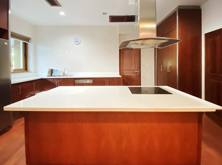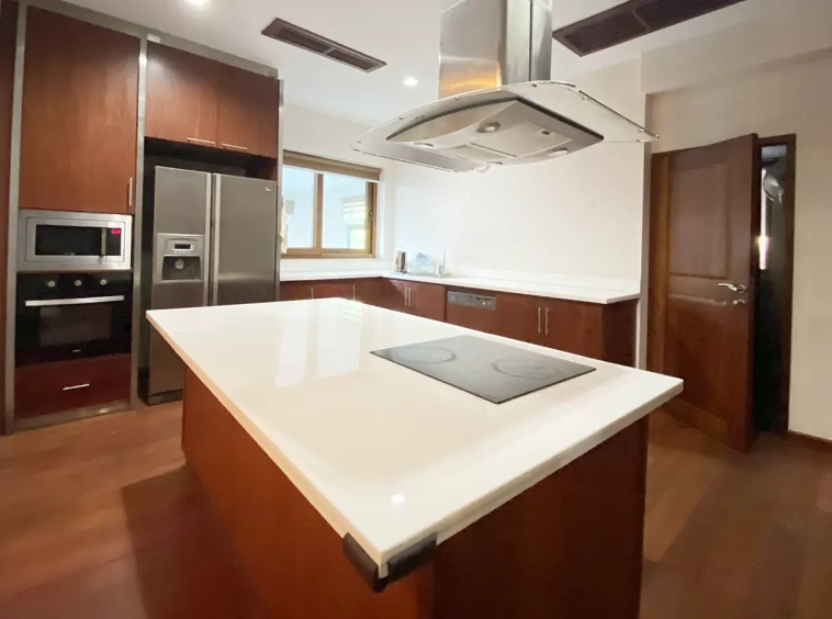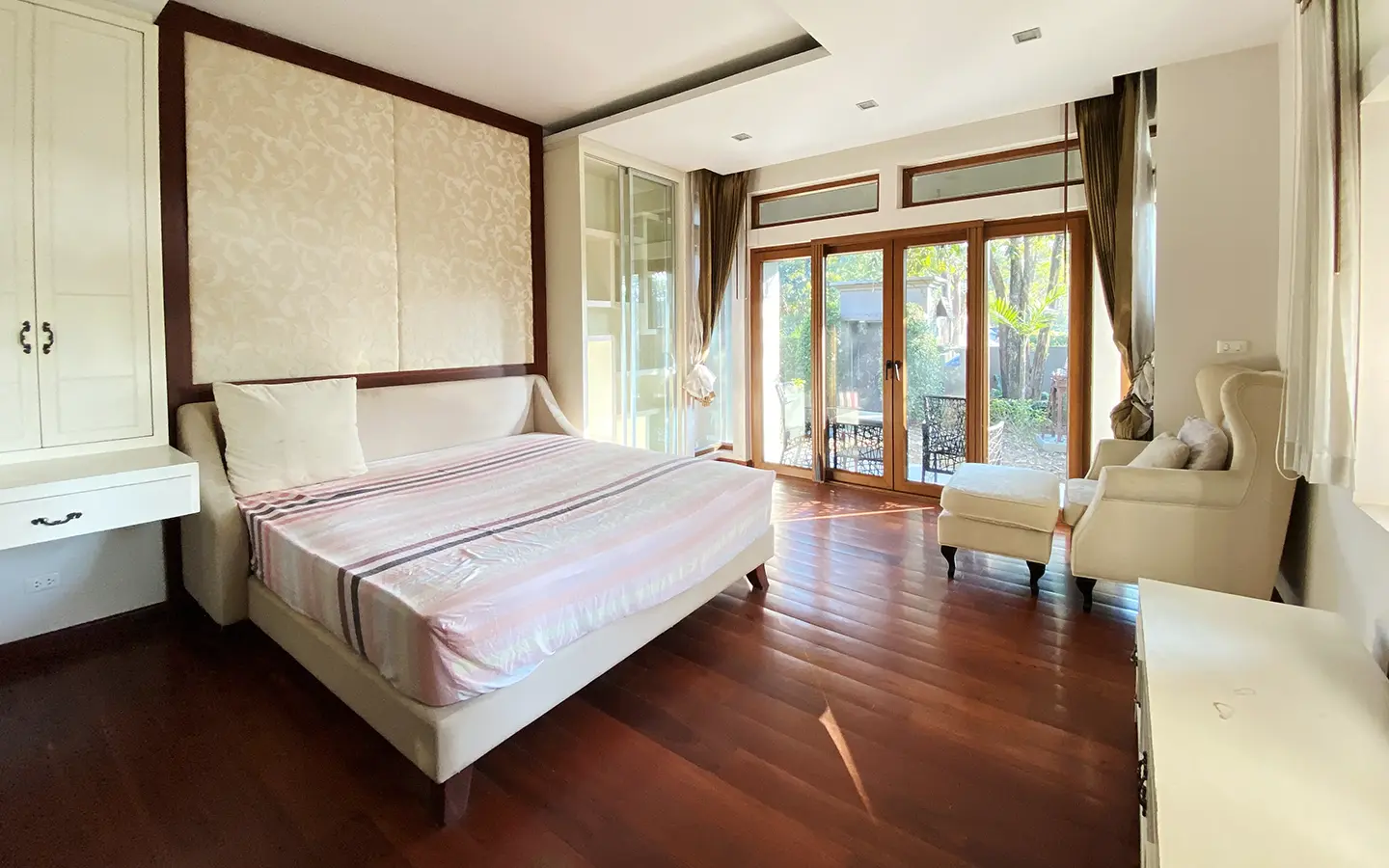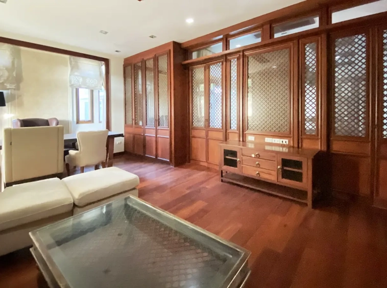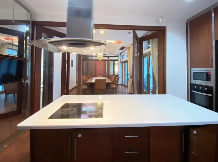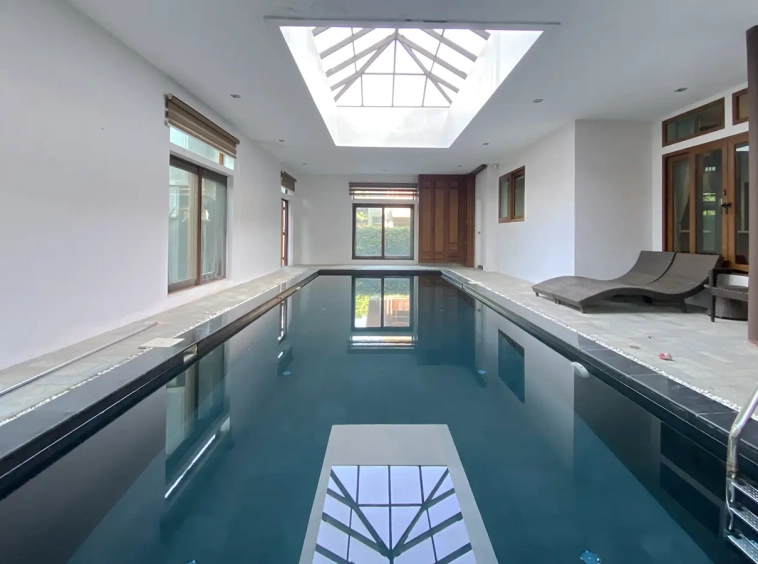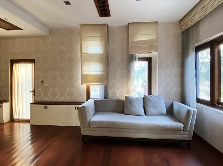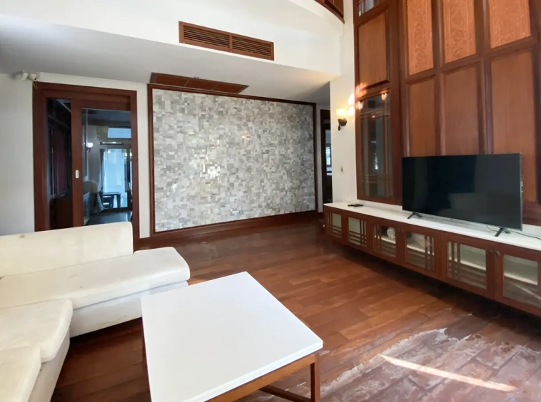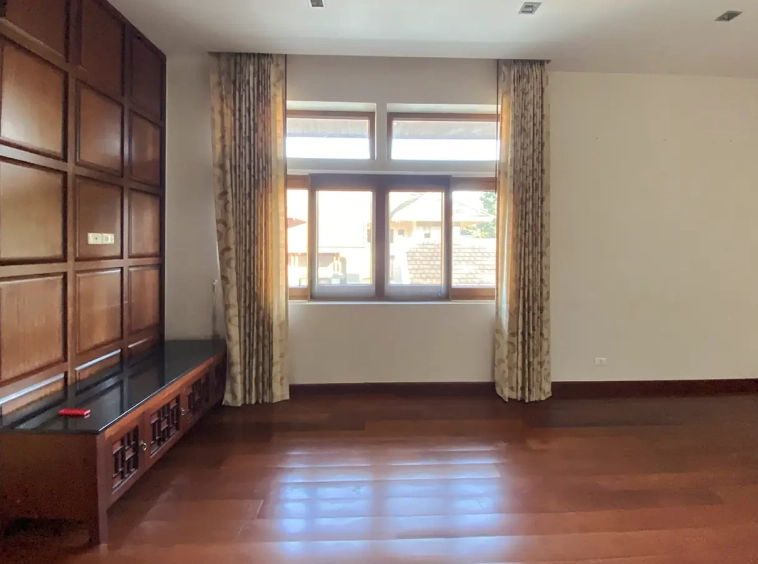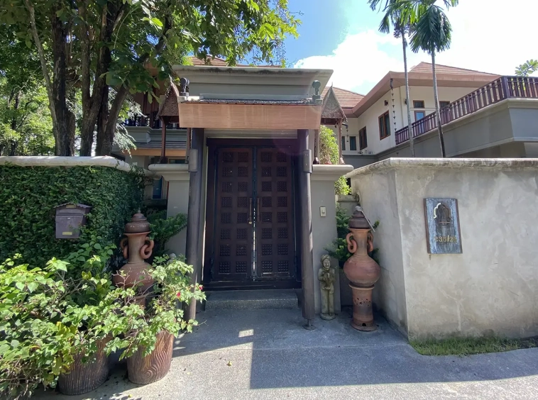 Being one of the very few properties in this exclusive and private state, the house occupies over half a rai of land, and has a lovely landscaped garden with a koi pond and a 4-car garage with storage room. The ensuite maid's quarter is attached here with access to the storage room and Thai kitchen. All fittings and trimmings in the house are of absolute high quality. The sitting room has a double ceiling featuring wood beams and a wood floor. The open-plan dining/kitchen room is spacious and has access to the covered saltwater swimming pool and the sitting deck by the garden. The beautiful open fully fitted Western kitchen comes with built-in appliances and a cooking island, great for entertaining. In addition, still on the ground floor, there is a study which could be used as a guest bedroom or a playroom, an ensuite guest bedroom with its own access to the front garden and a guest bathroom. All the rooms are neatly decorated and all feature beautiful wood trimmings.