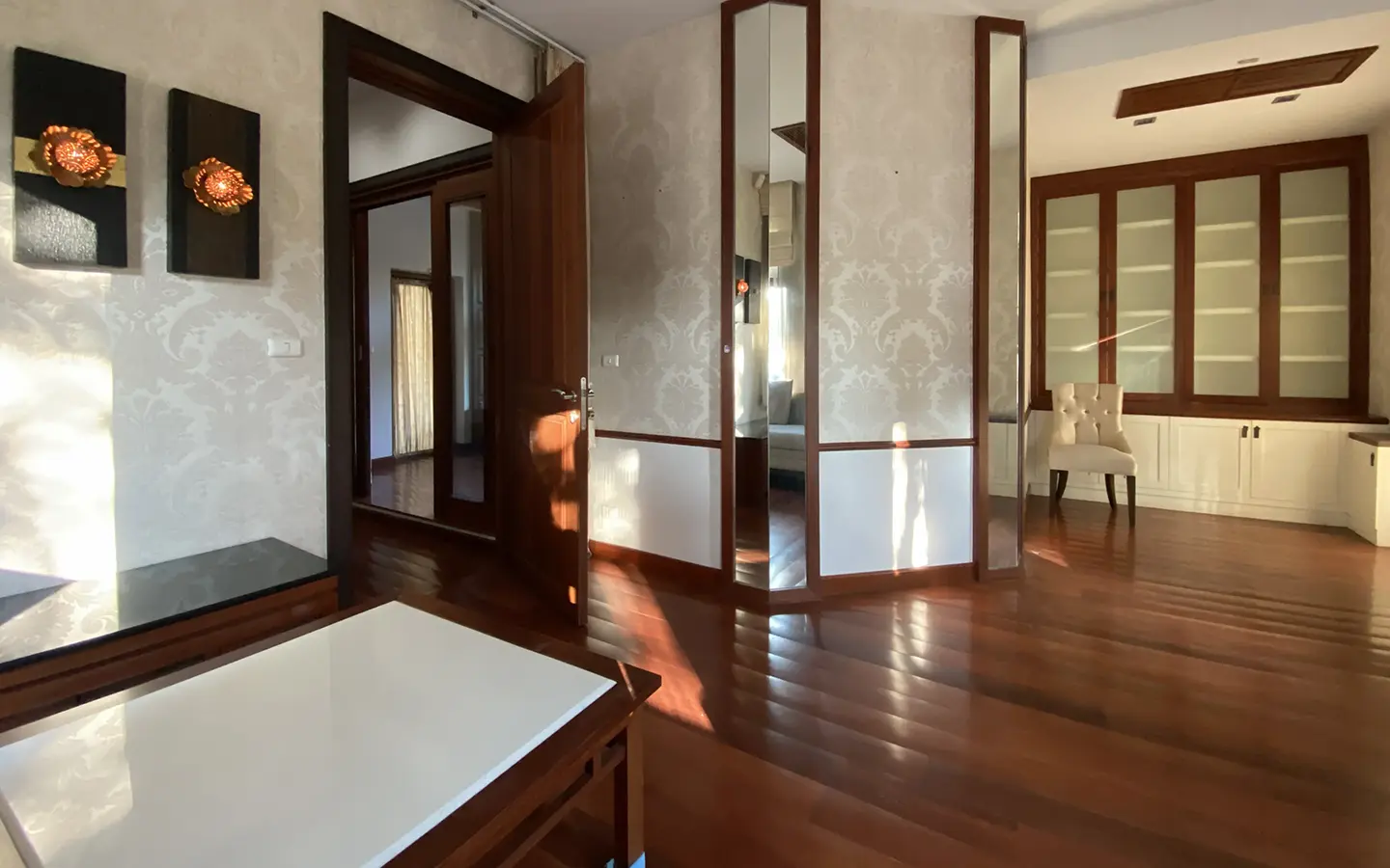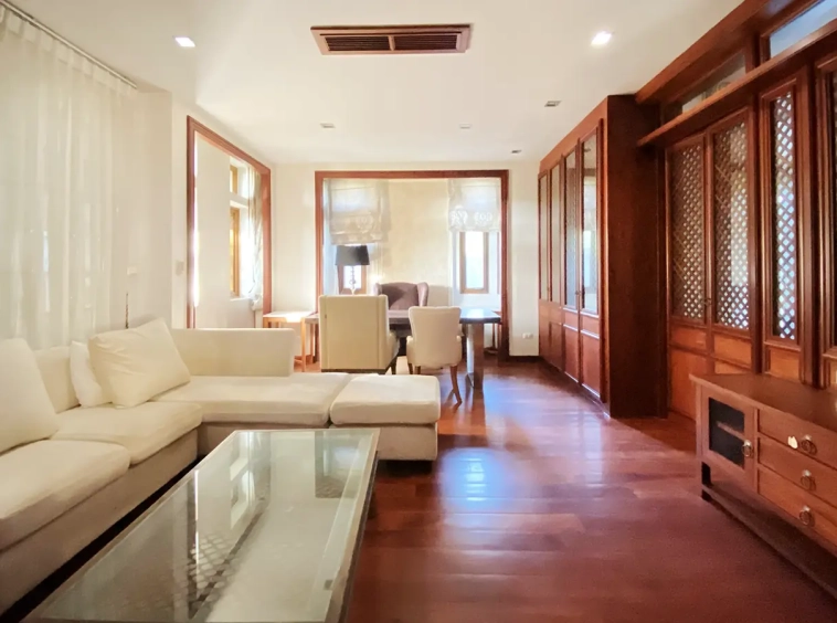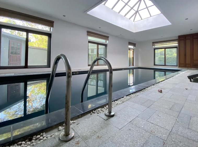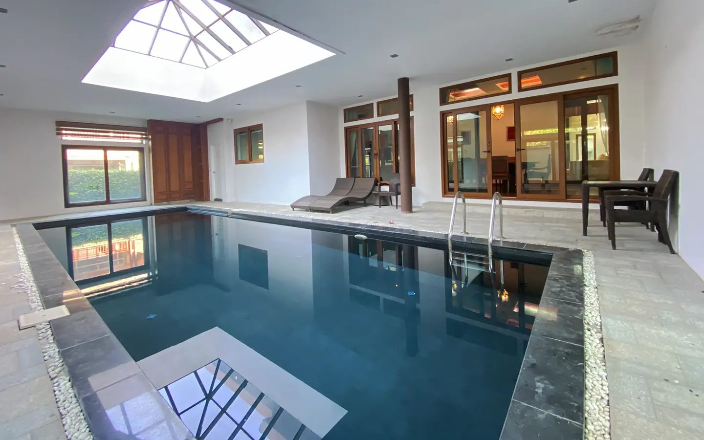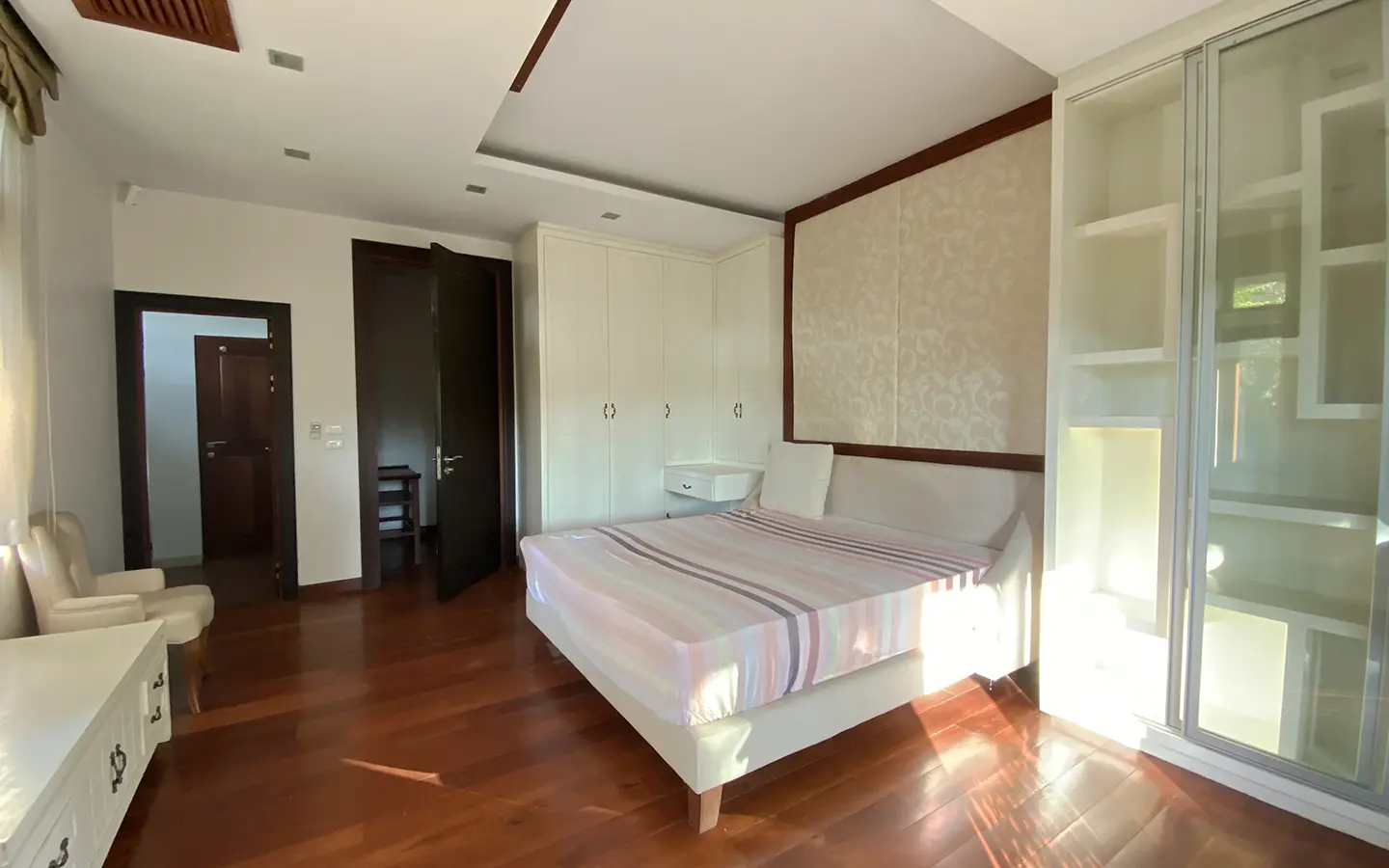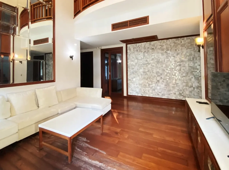 Being one of the very few properties in this exclusive and private state, the house occupies over half a rai of land, and has a lovely landscaped garden with a koi pond and a 4-car garage with storage room. The ensuite maid's quarter is attached here with access to the storage room and Thai kitchen. All fittings and trimmings in the house are of absolute high quality. The sitting room has a double ceiling featuring wood beams and a wood floor. The open-plan dining/kitchen room is spacious and has access to the covered saltwater swimming pool and the sitting deck by the garden. The beautiful open fully fitted Western kitchen comes with built-in appliances and a cooking island, great for entertaining. In addition, still on the ground floor, there is a study which could be used as a guest bedroom or a playroom, an ensuite guest bedroom with its own access to the front garden and a guest bathroom. All the rooms are neatly decorated and all feature beautiful wood trimmings.